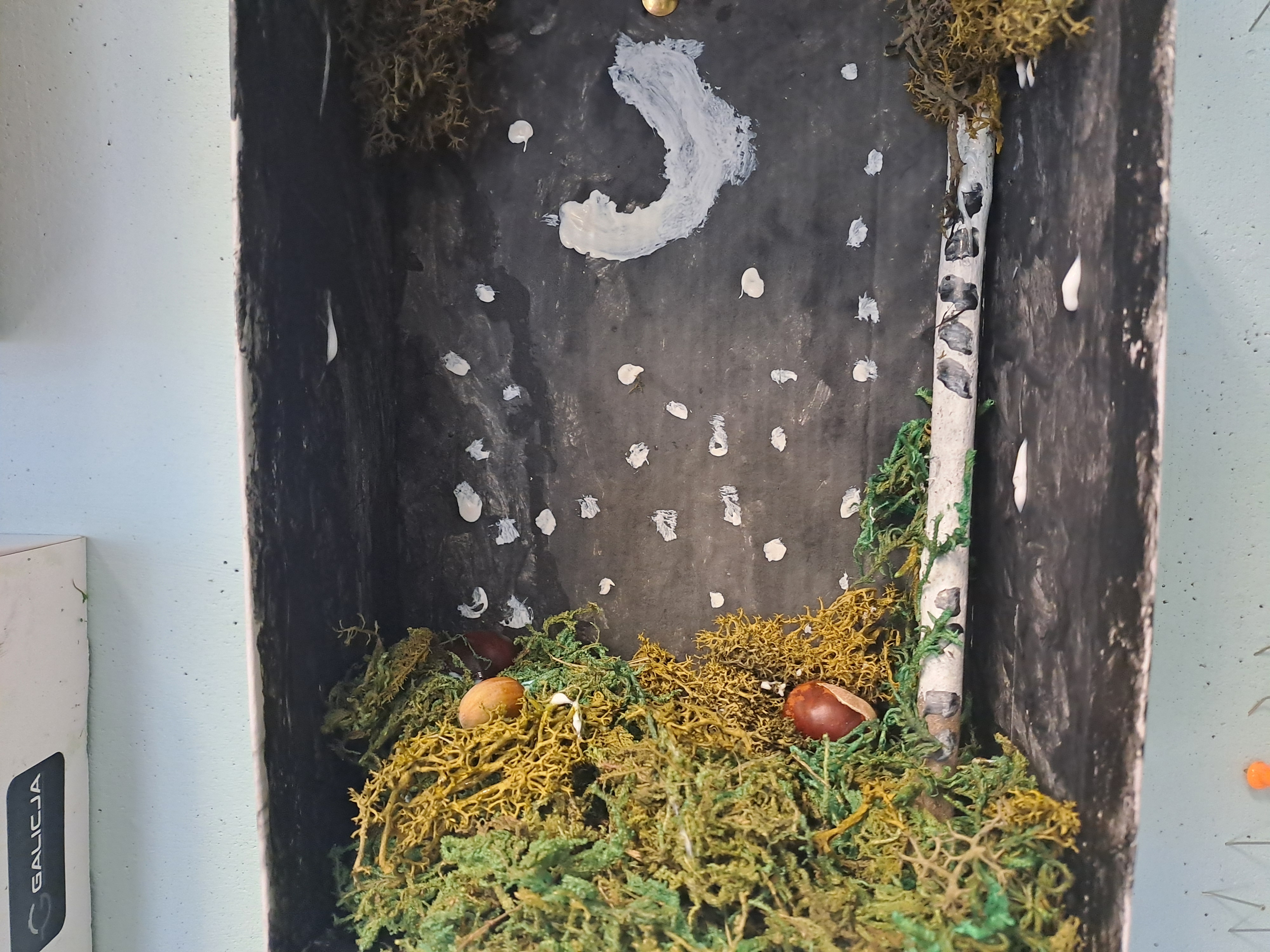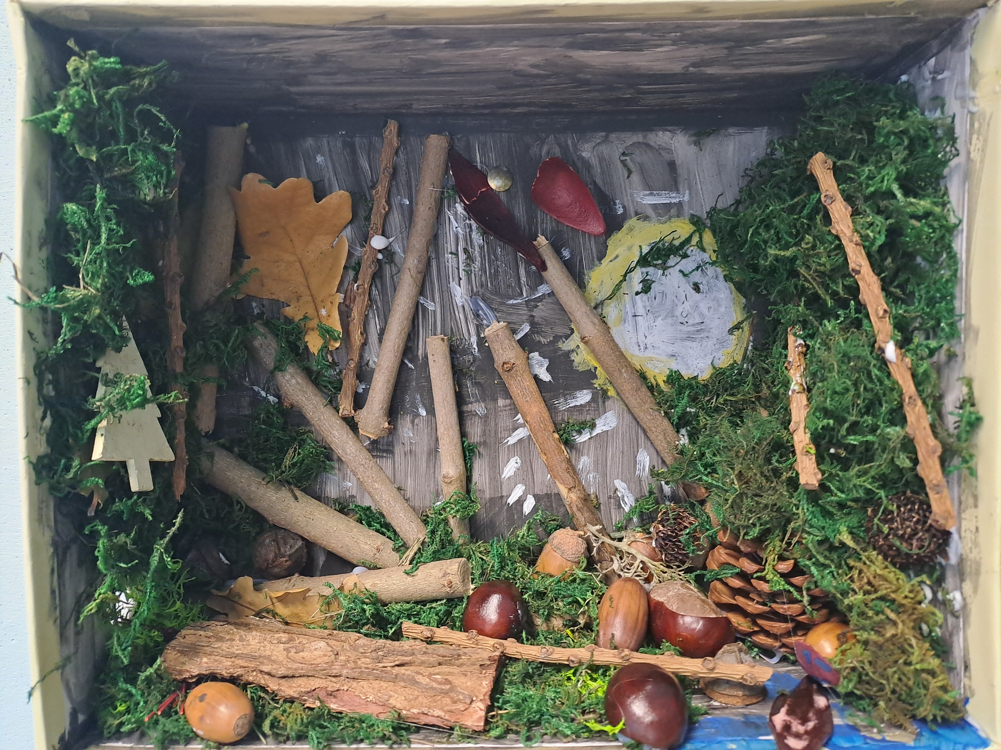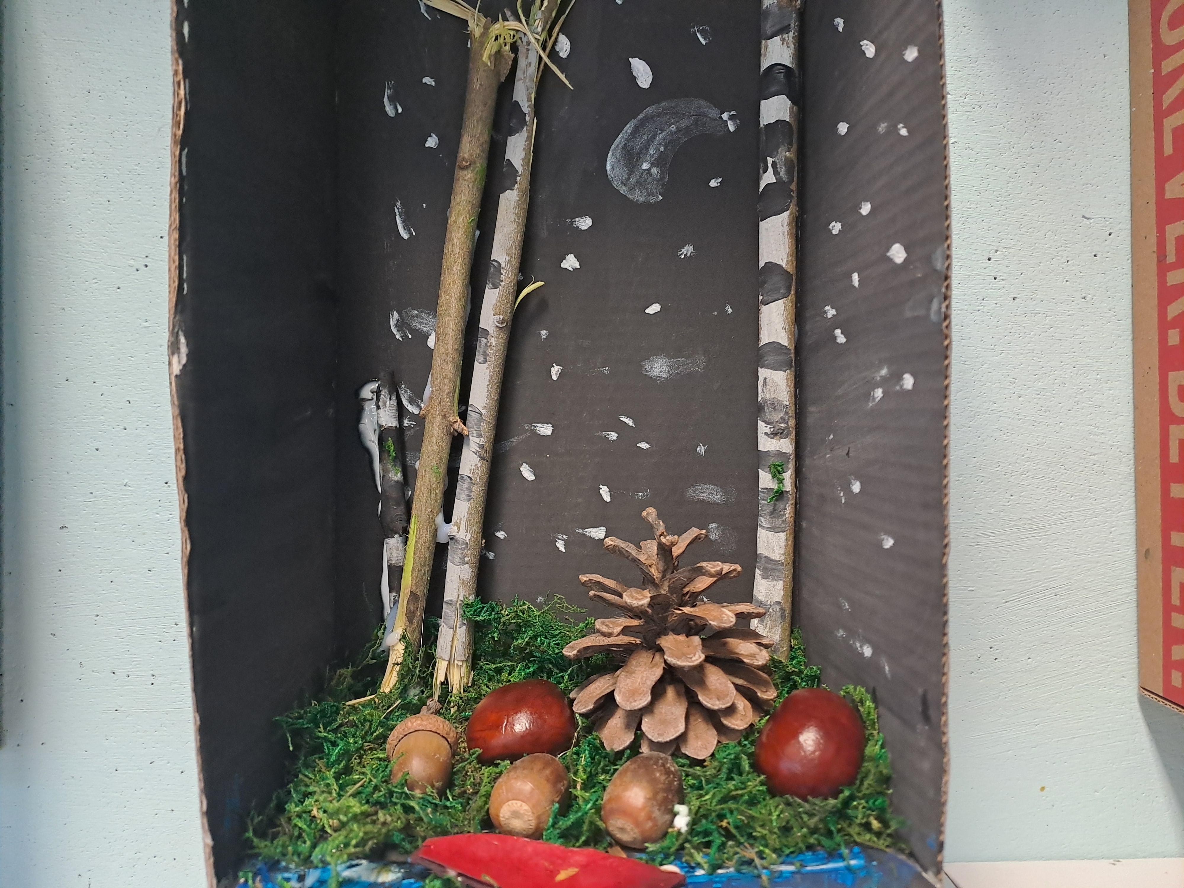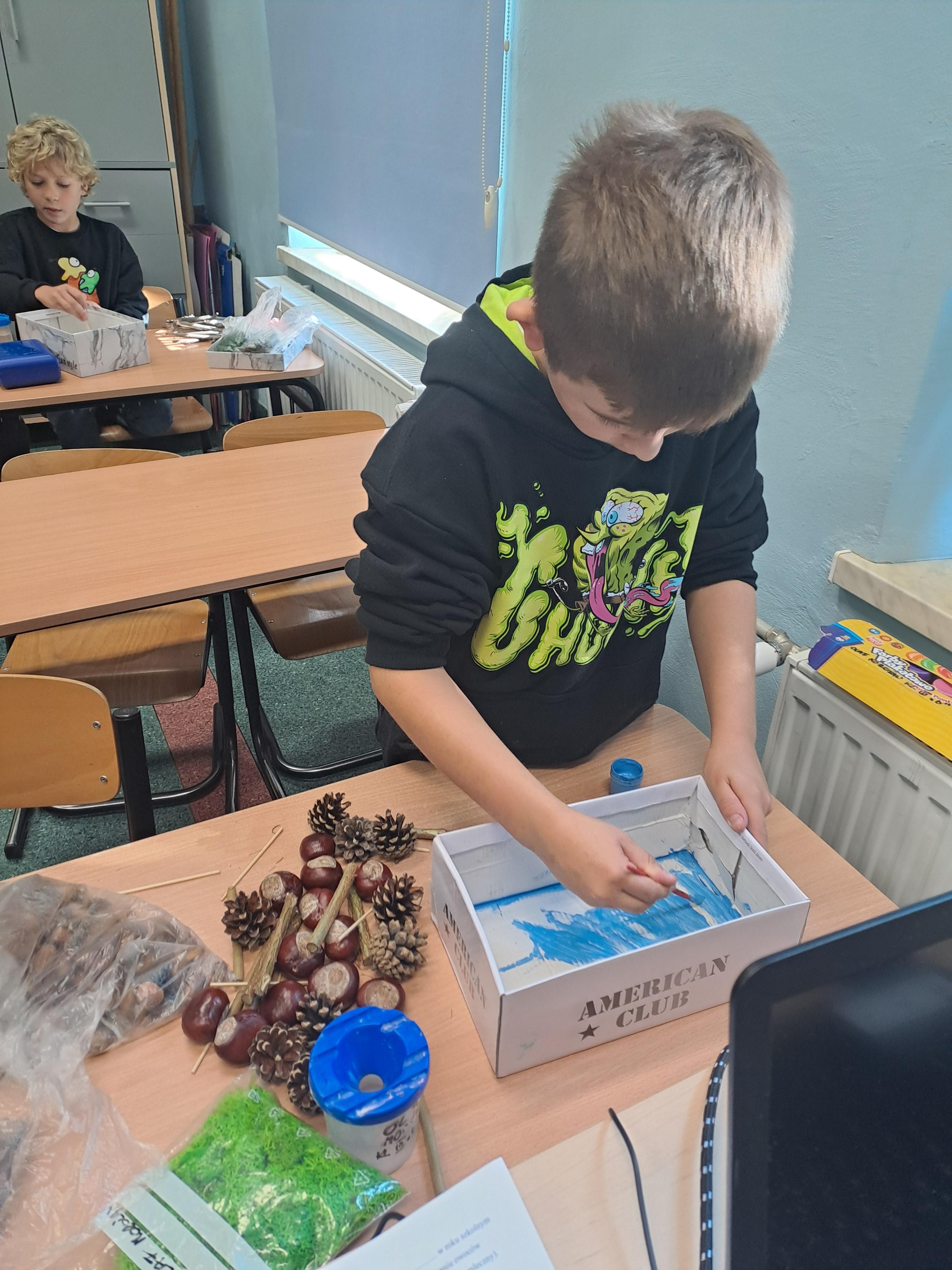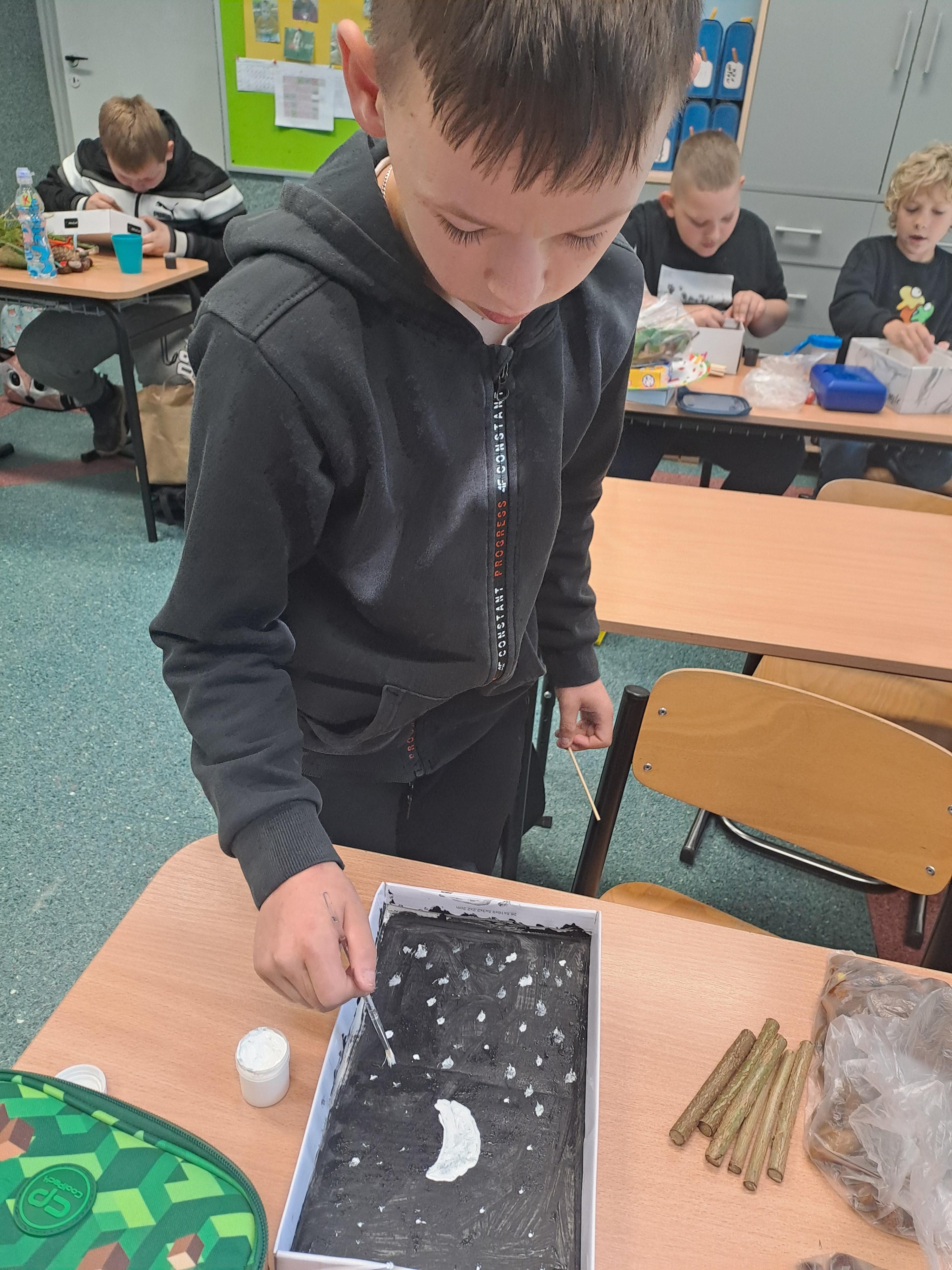 Tematem dzisiejszych zajęć był krajobraz w lesie. Pracowaliśmy z wykorzystaniem pudełek, farb oraz jesiennych skarbów: kasztanów, gałązek, szyszek i mchu. Dzięki swojej kreatywności i wyobraźni stworzyliśmy zaczarowane pudełka, w których powstały niezwykłe, bajkowe krajobrazy. Niektórzy uczniowie zdecydowali się przedstawić nocny pejzaż lasu, dodając tajemniczy nastrój swoim pracom. Wszystkie prace wyróżniały się pomysłowością i starannością wykonania.