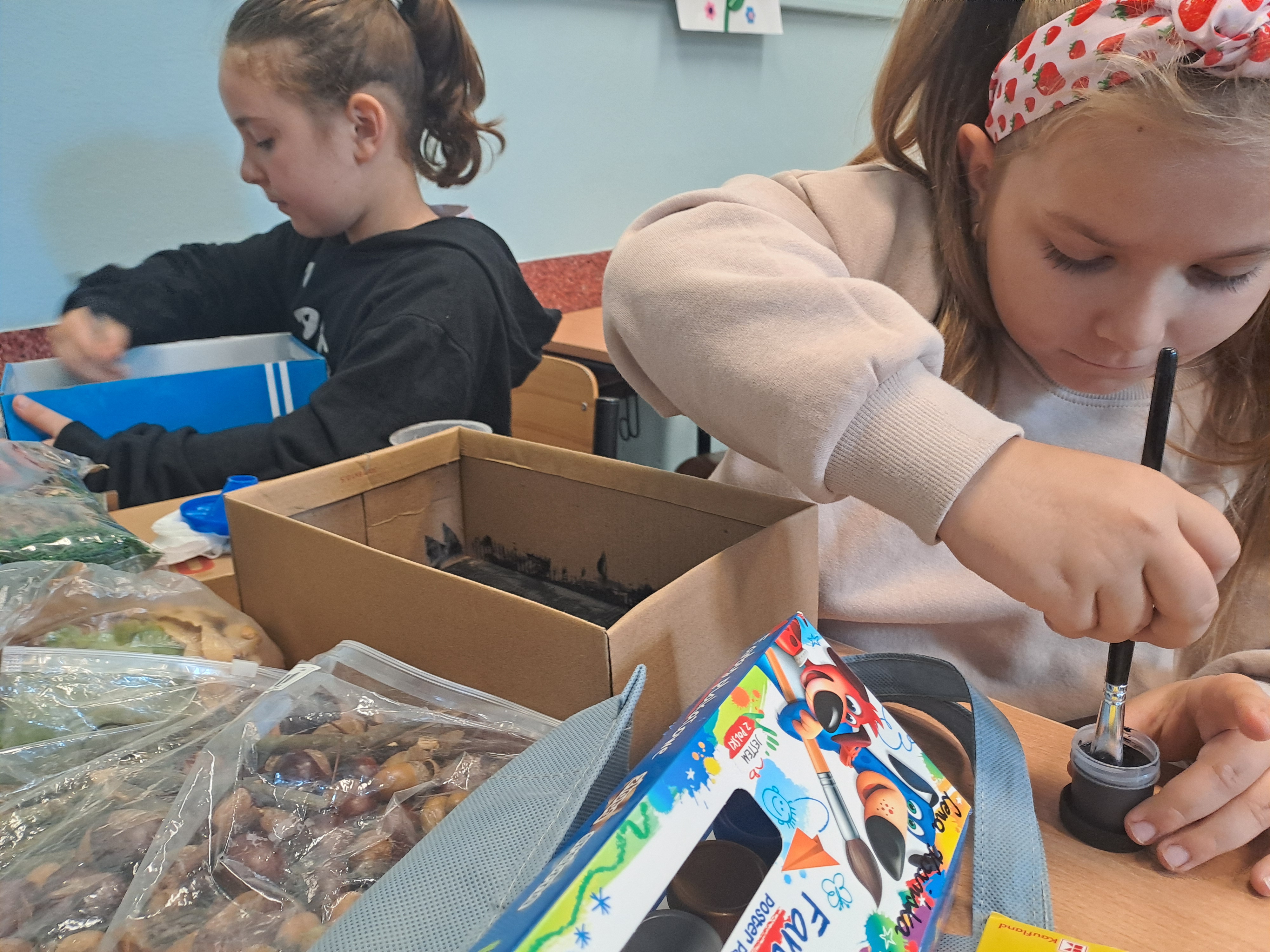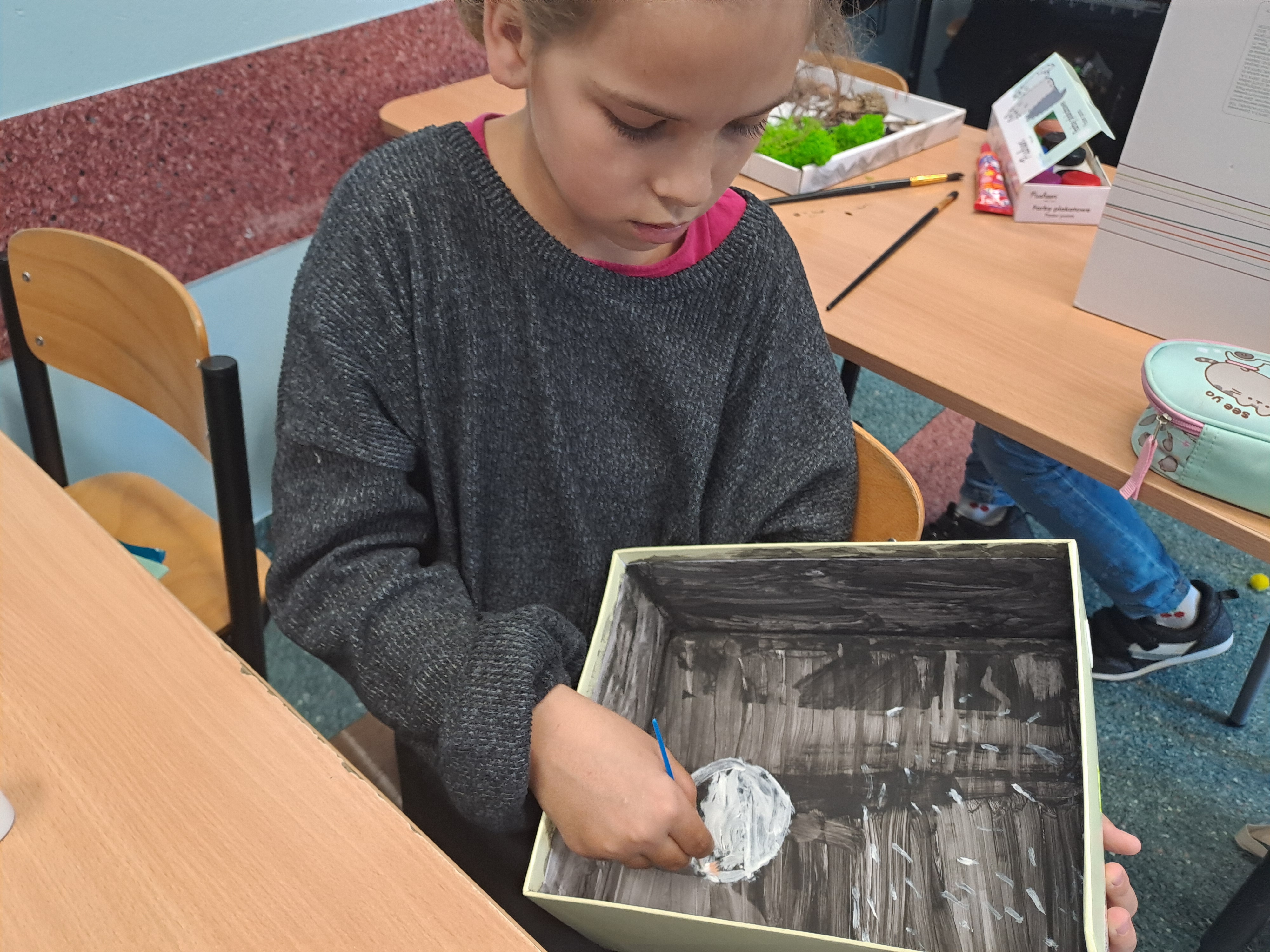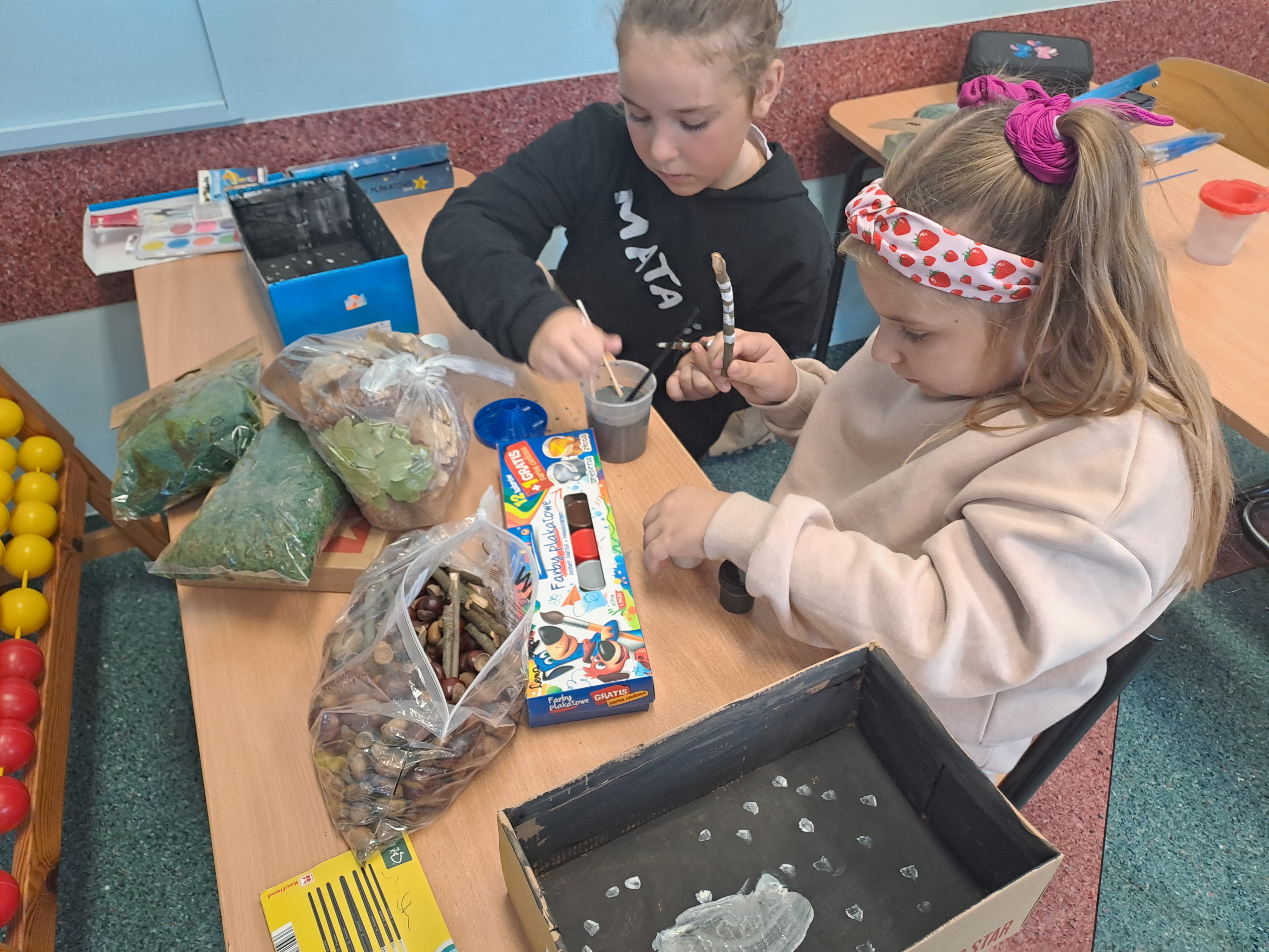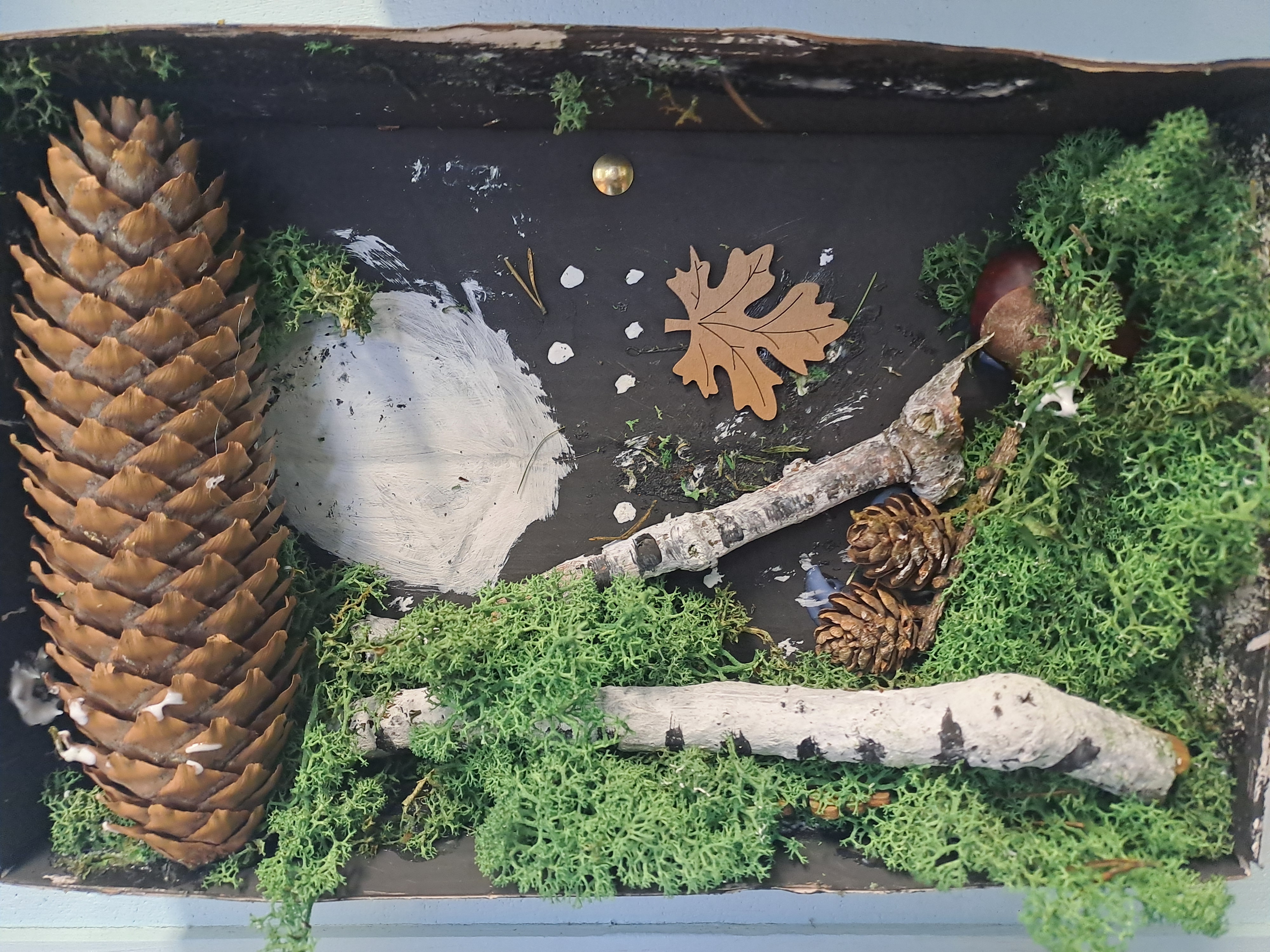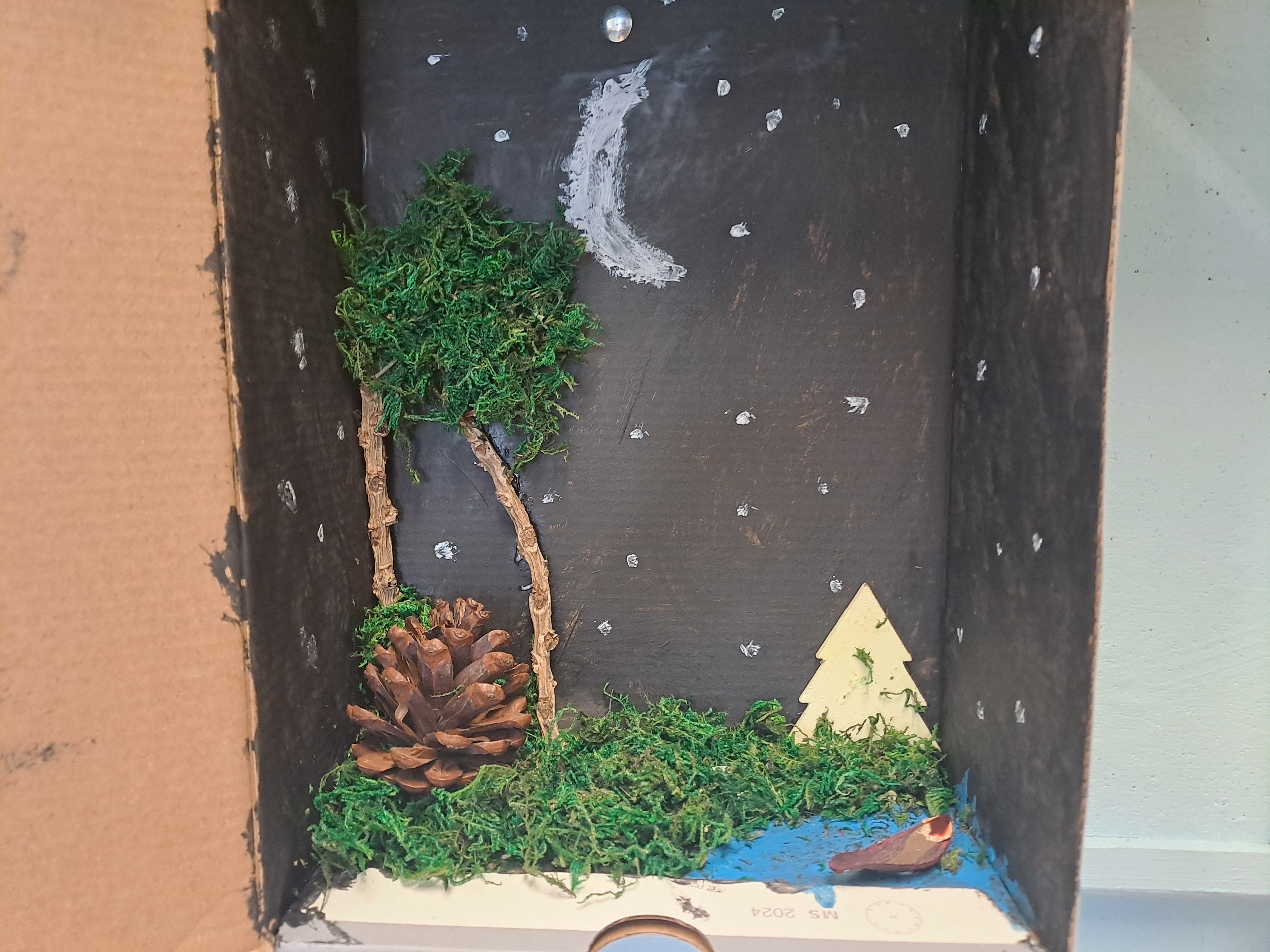 Tematem dzisiejszych zajęć był krajobraz w lesie. Pracowaliśmy z wykorzystaniem pudełek, farb oraz jesiennych skarbów: kasztanów, gałązek, szyszek i mchu. Dzięki swojej kreatywności i wyobraźni stworzyliśmy zaczarowane pudełka, w których powstały niezwykłe, bajkowe krajobrazy. Niektórzy uczniowie zdecydowali się przedstawić nocny pejzaż lasu, dodając tajemniczy nastrój swoim pracom. Wszystkie prace wyróżniały się pomysłowością i starannością wykonania.