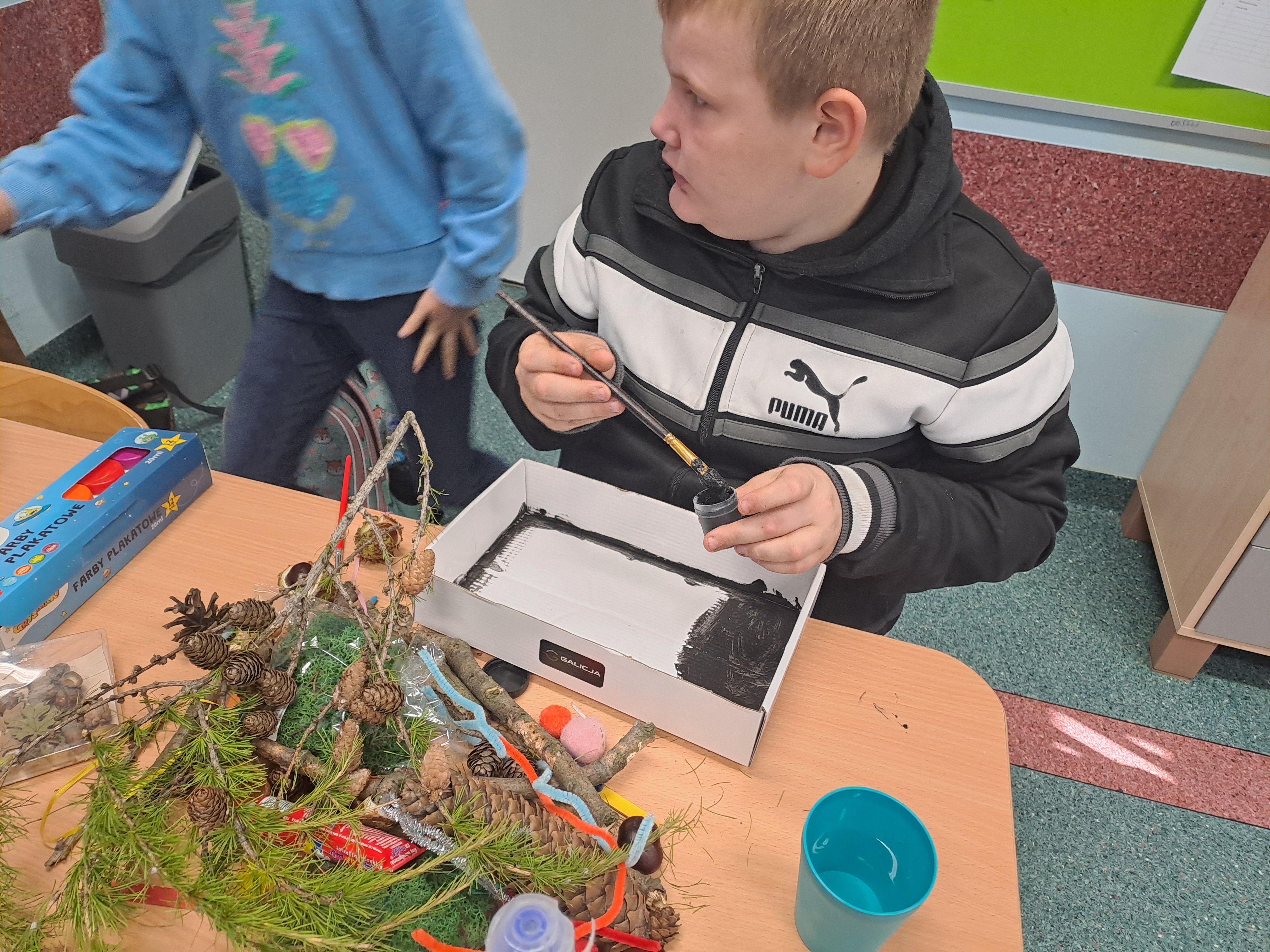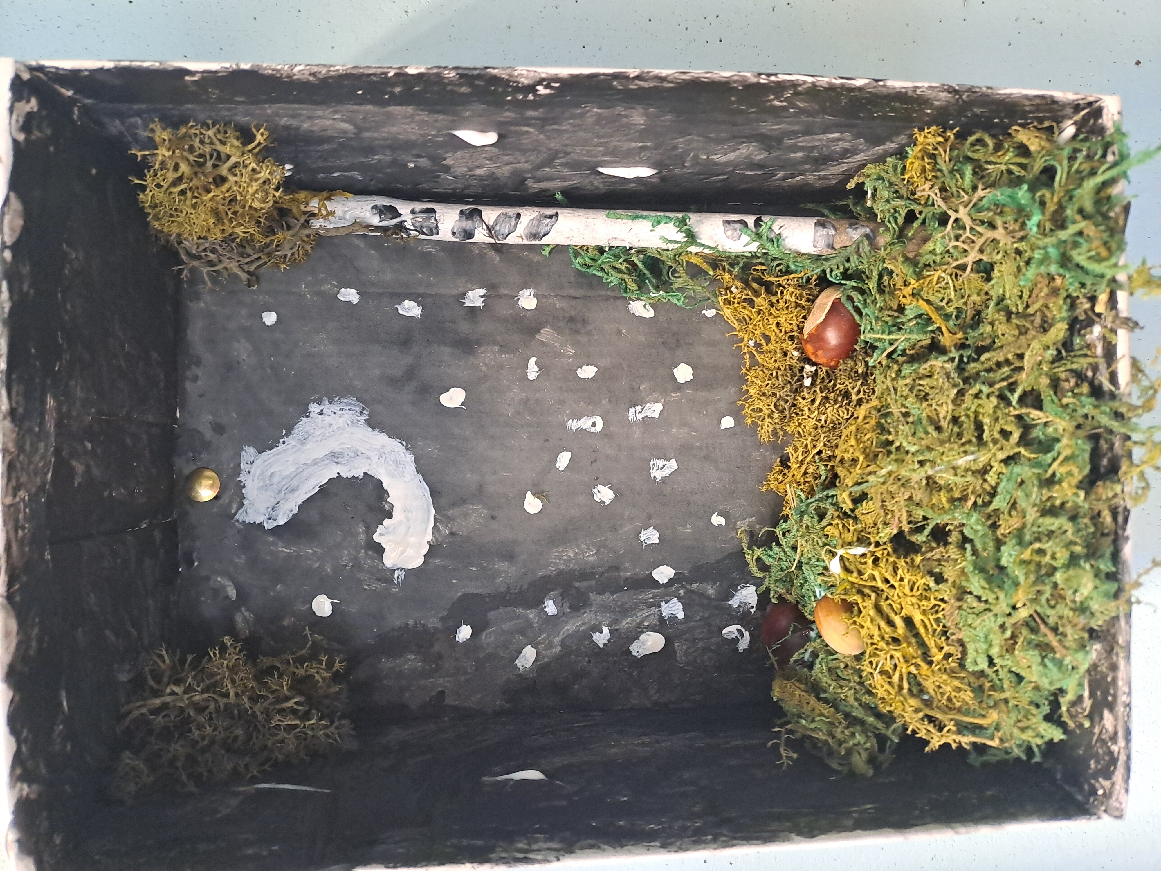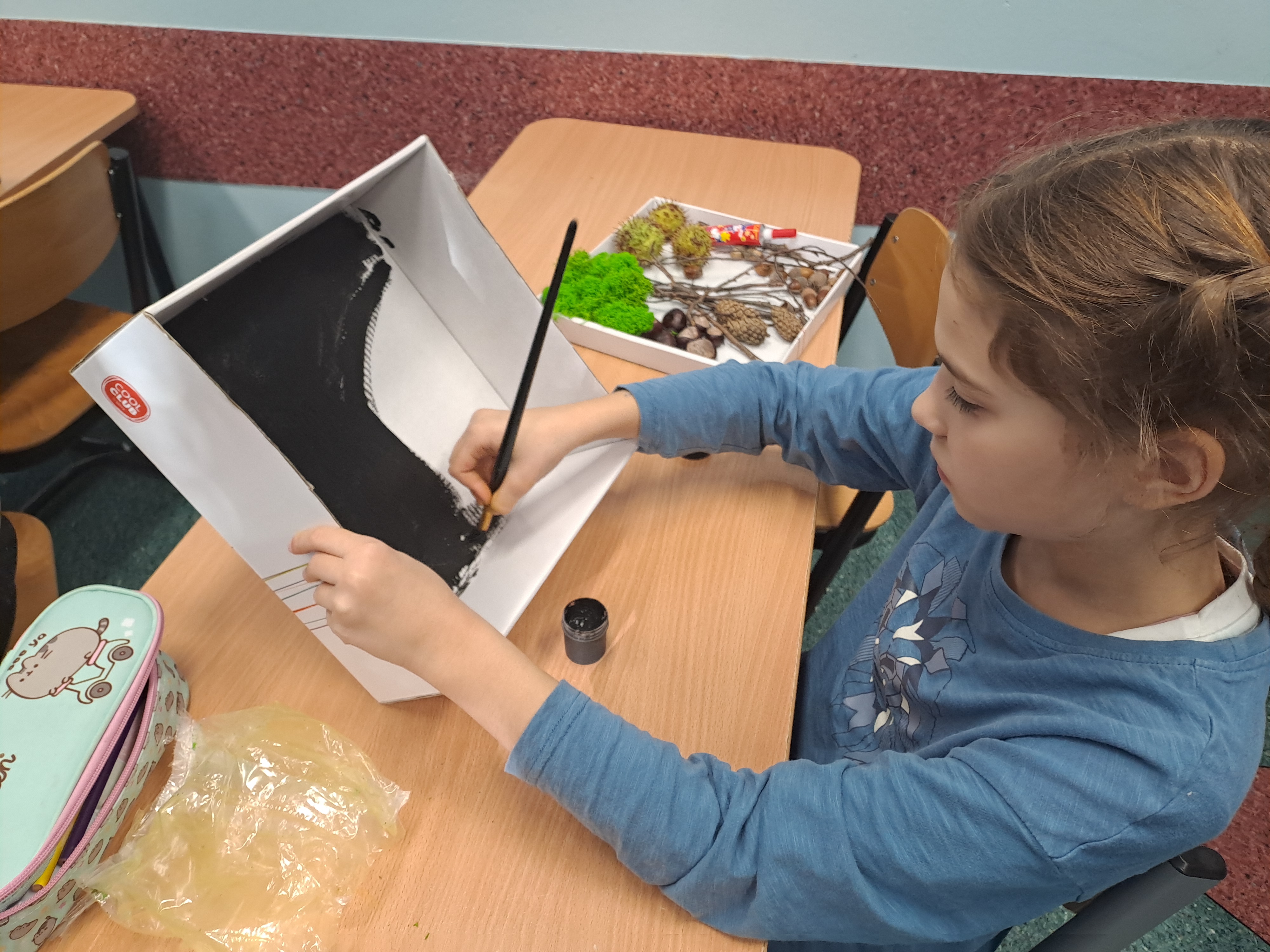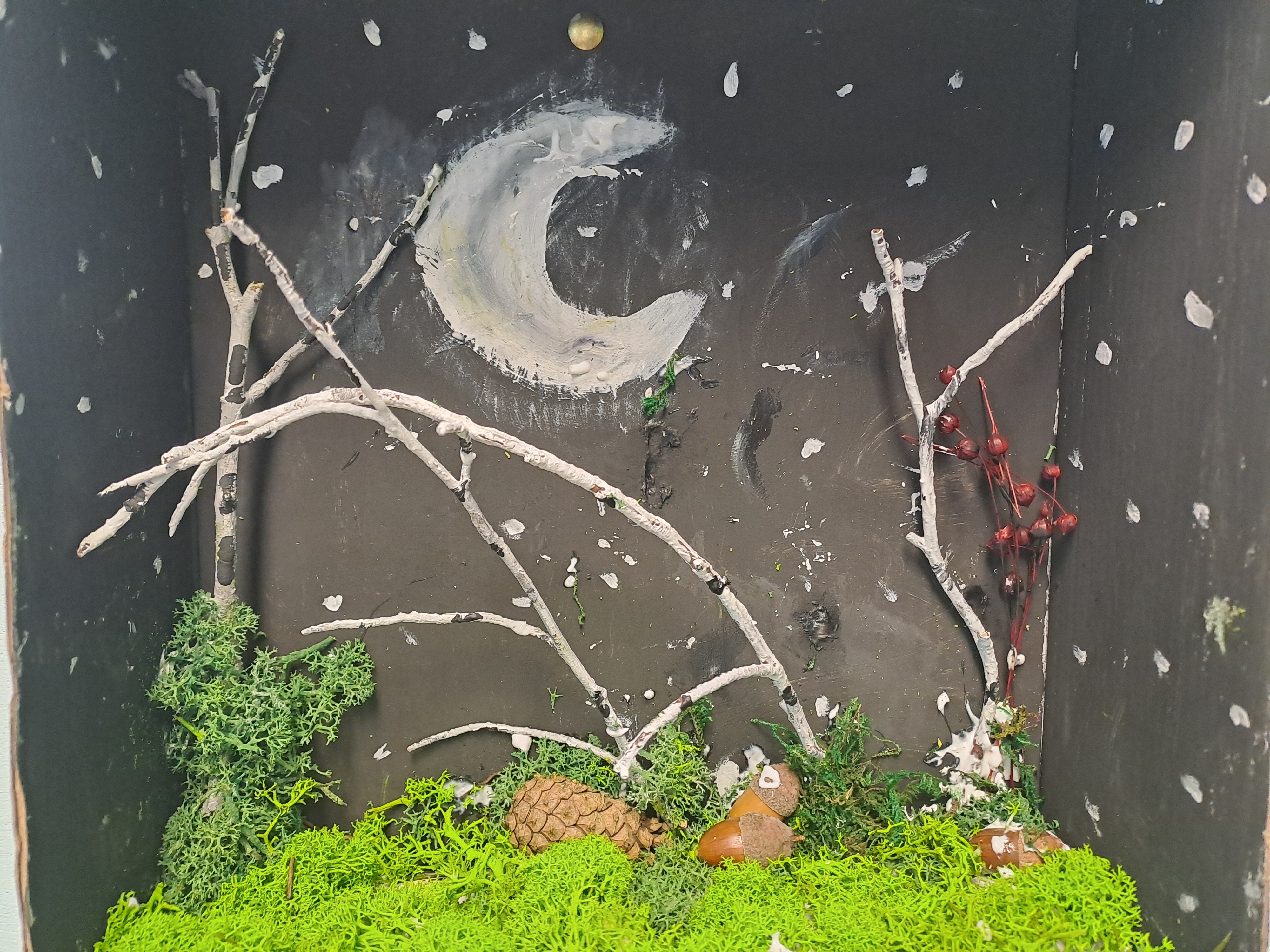 Tematem dzisiejszych zajęć był krajobraz w lesie. Pracowaliśmy z wykorzystaniem pudełek, farb oraz jesiennych skarbów: kasztanów, gałązek, szyszek i mchu. Dzięki swojej kreatywności i wyobraźni stworzyliśmy zaczarowane pudełka, w których powstały niezwykłe, bajkowe krajobrazy. Niektórzy uczniowie zdecydowali się przedstawić nocny pejzaż lasu, dodając tajemniczy nastrój swoim pracom. Wszystkie prace wyróżniały się pomysłowością i starannością wykonania.
