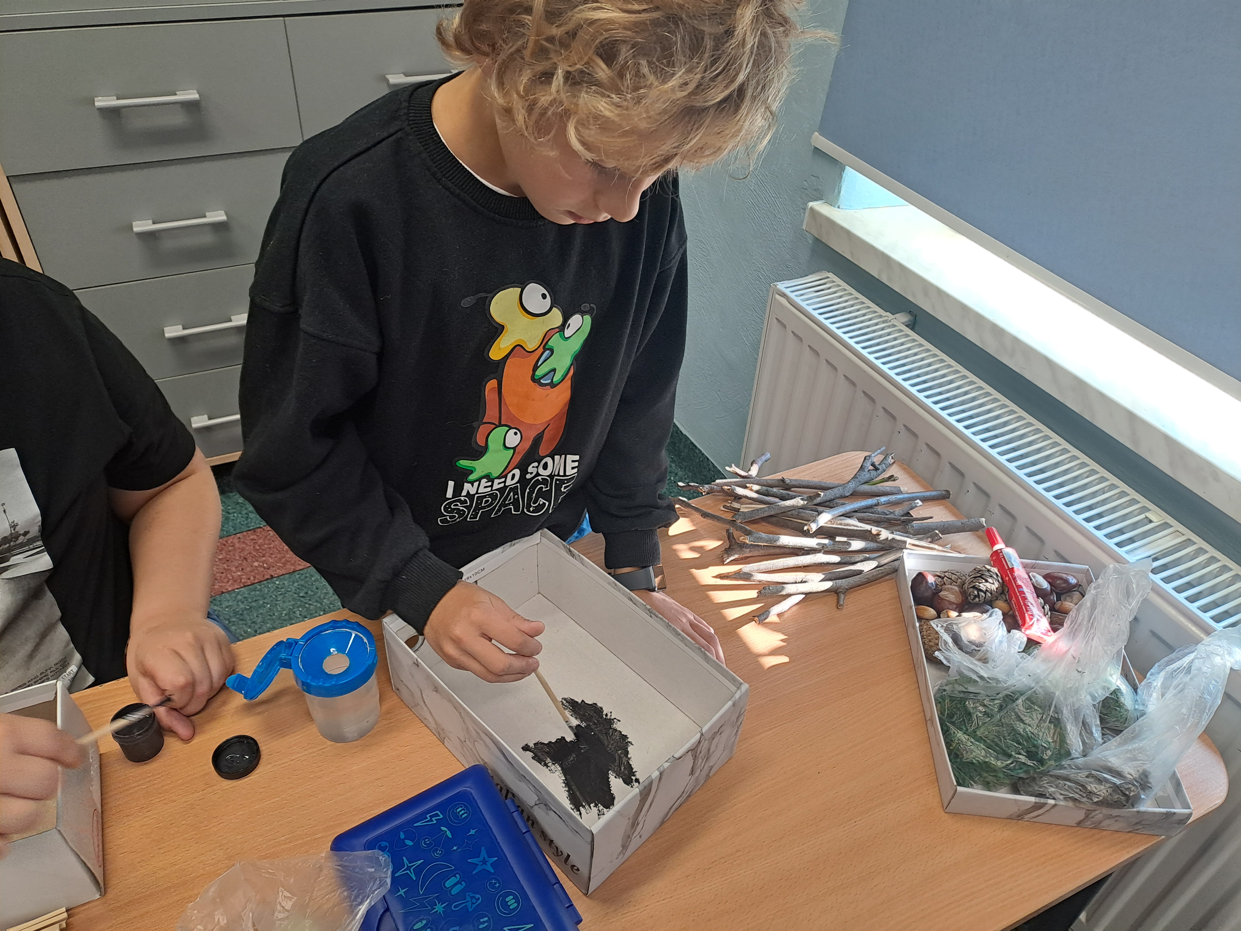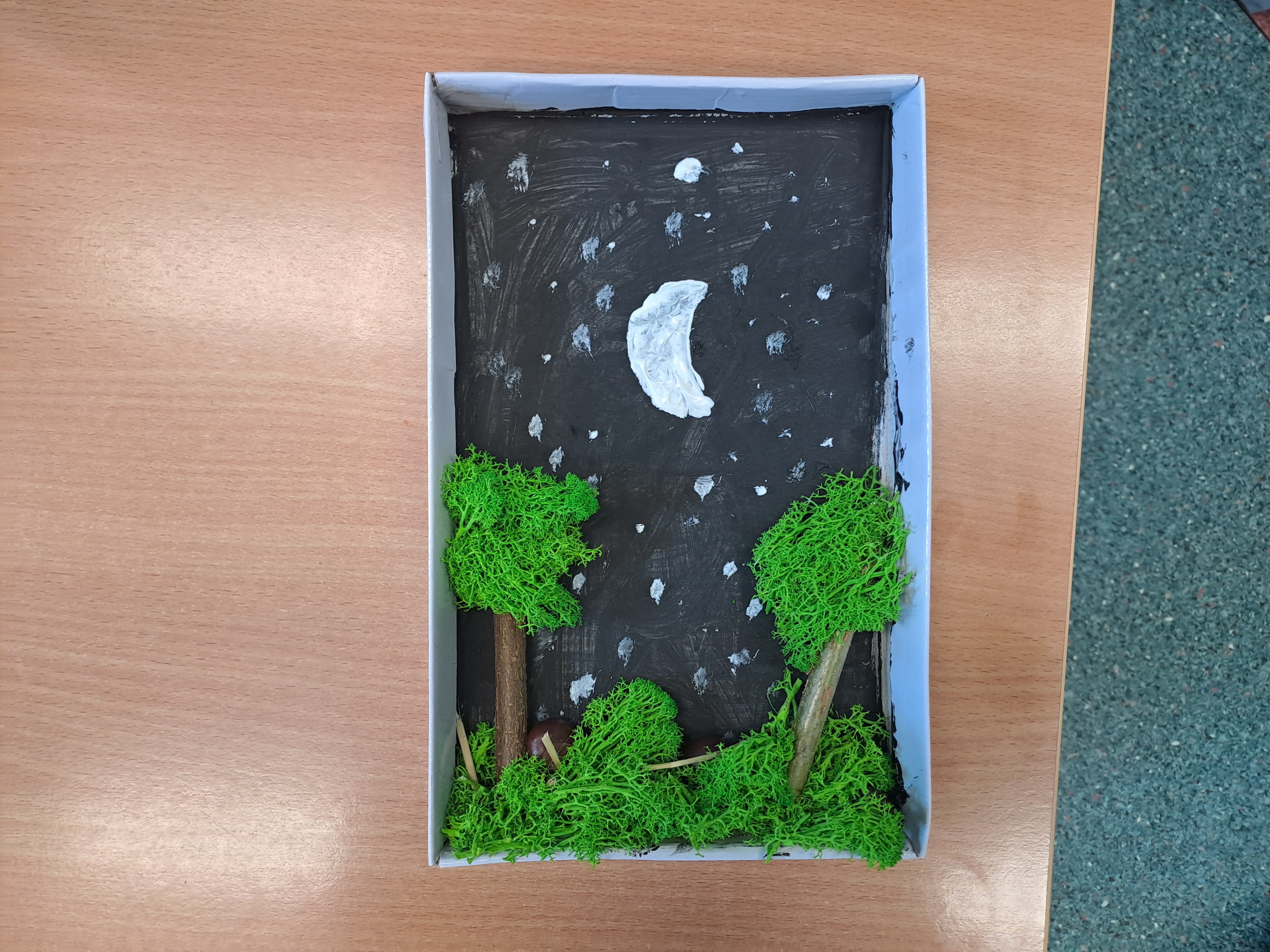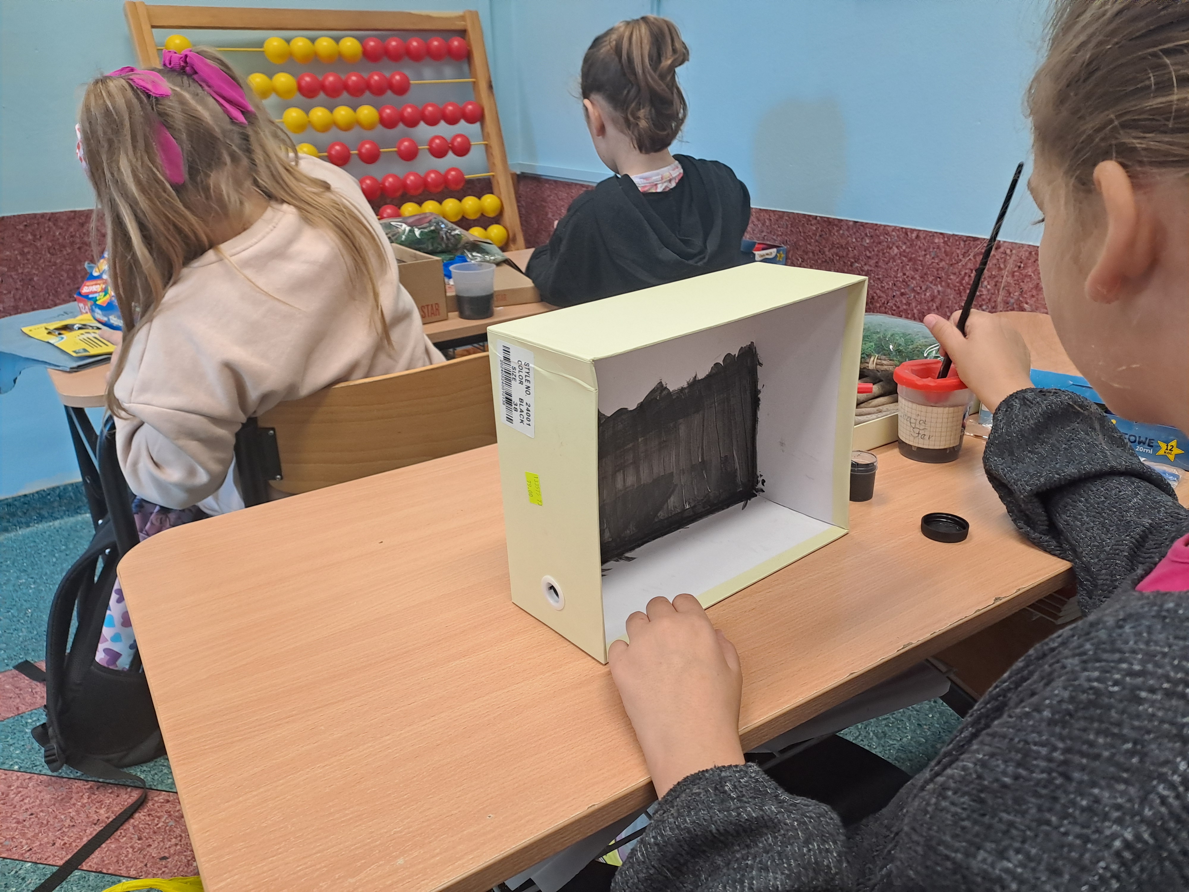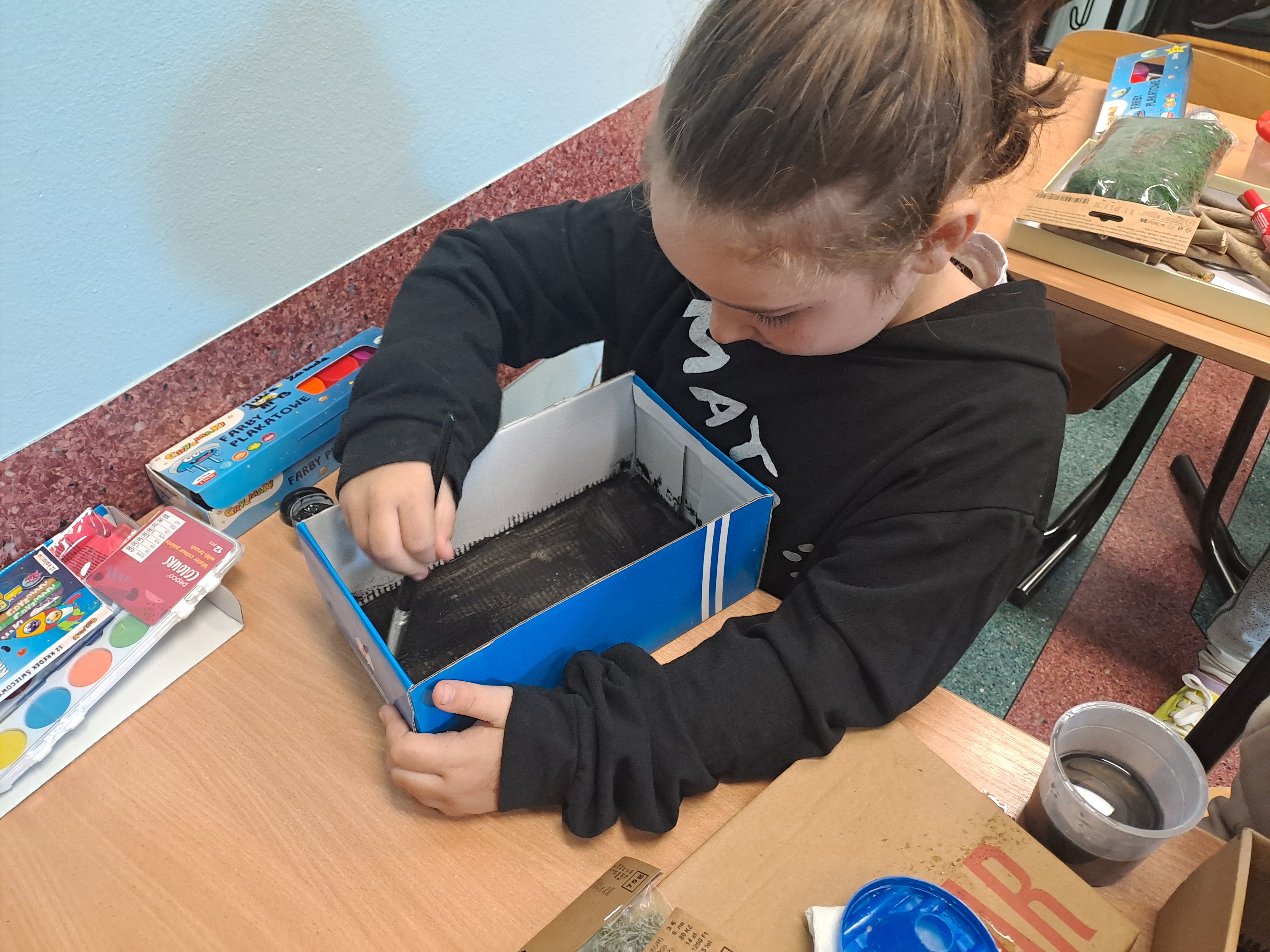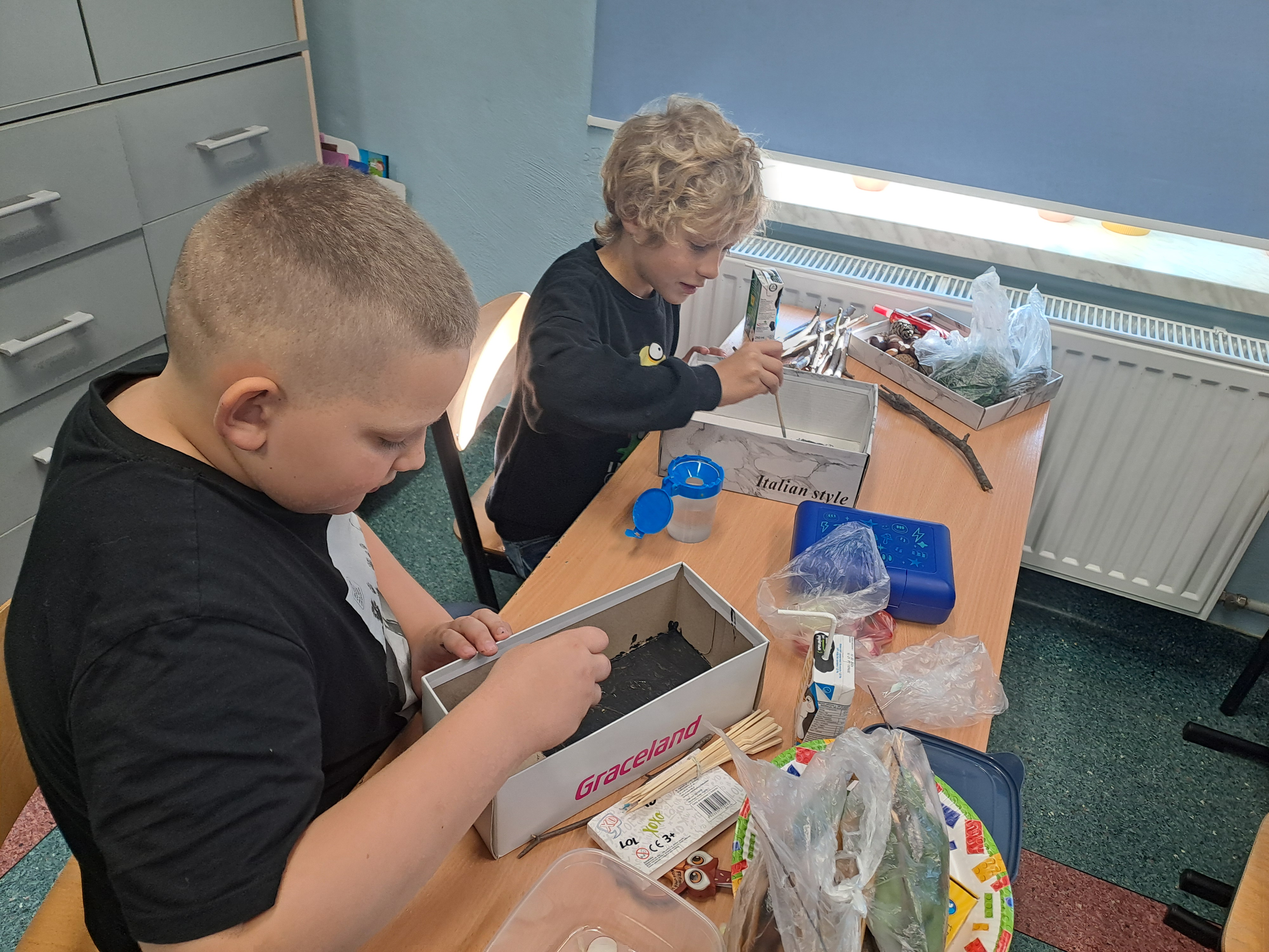 Tematem dzisiejszych zajęć był krajobraz w lesie. Pracowaliśmy z wykorzystaniem pudełek, farb oraz jesiennych skarbów: kasztanów, gałązek, szyszek i mchu. Dzięki swojej kreatywności i wyobraźni stworzyliśmy zaczarowane pudełka, w których powstały niezwykłe, bajkowe krajobrazy. Niektórzy uczniowie zdecydowali się przedstawić nocny pejzaż lasu, dodając tajemniczy nastrój swoim pracom. Wszystkie prace wyróżniały się pomysłowością i starannością wykonania.
