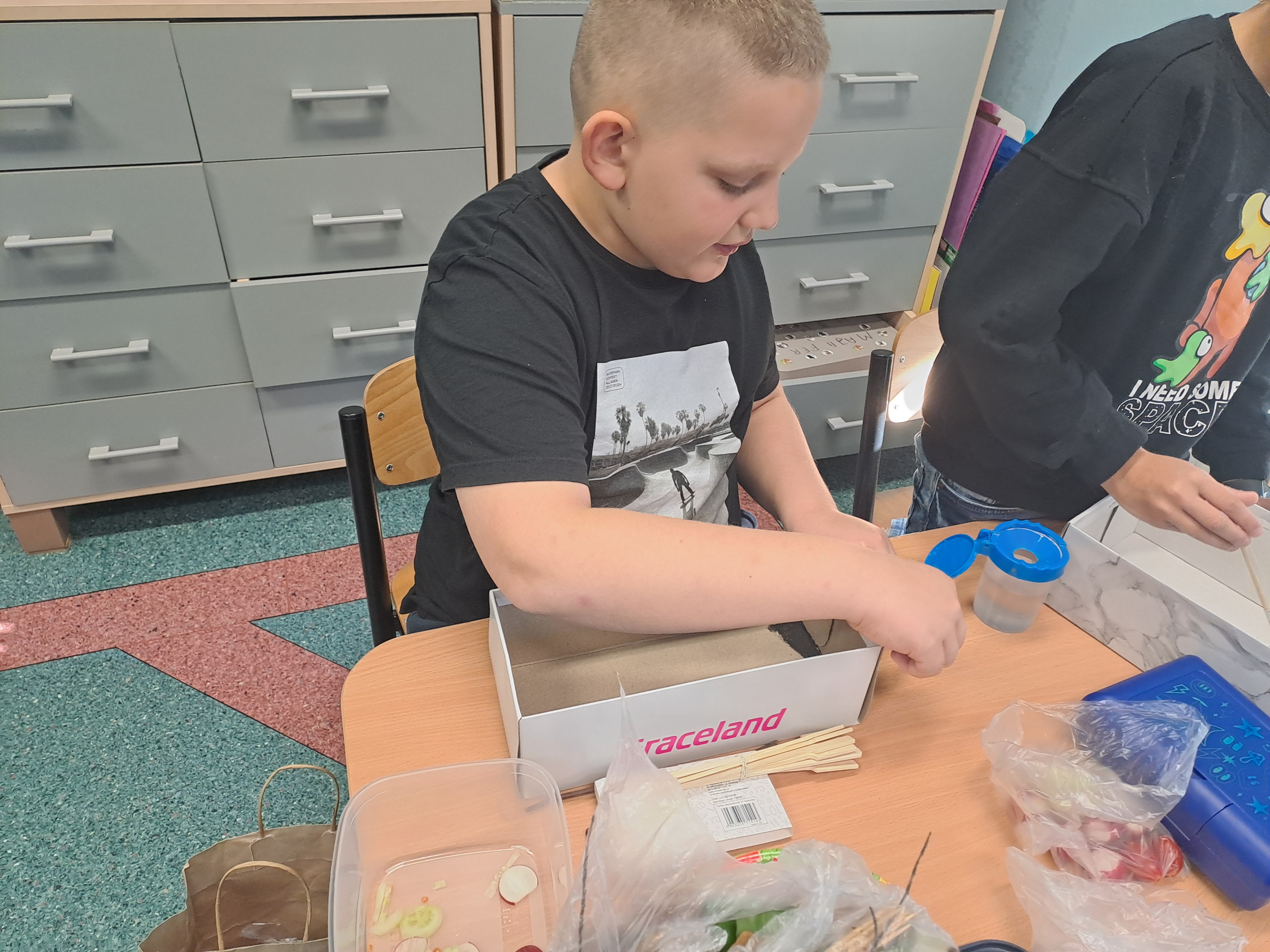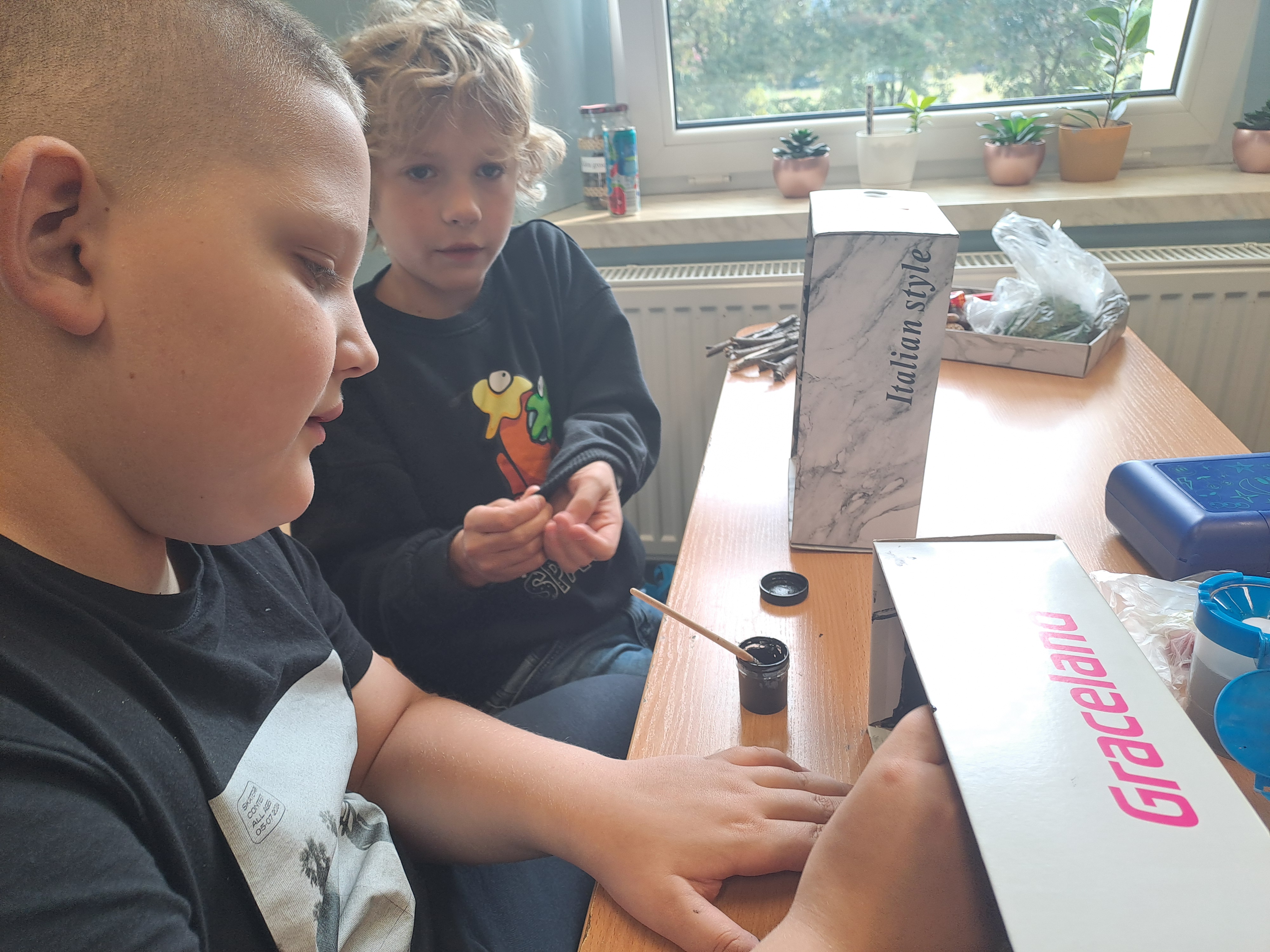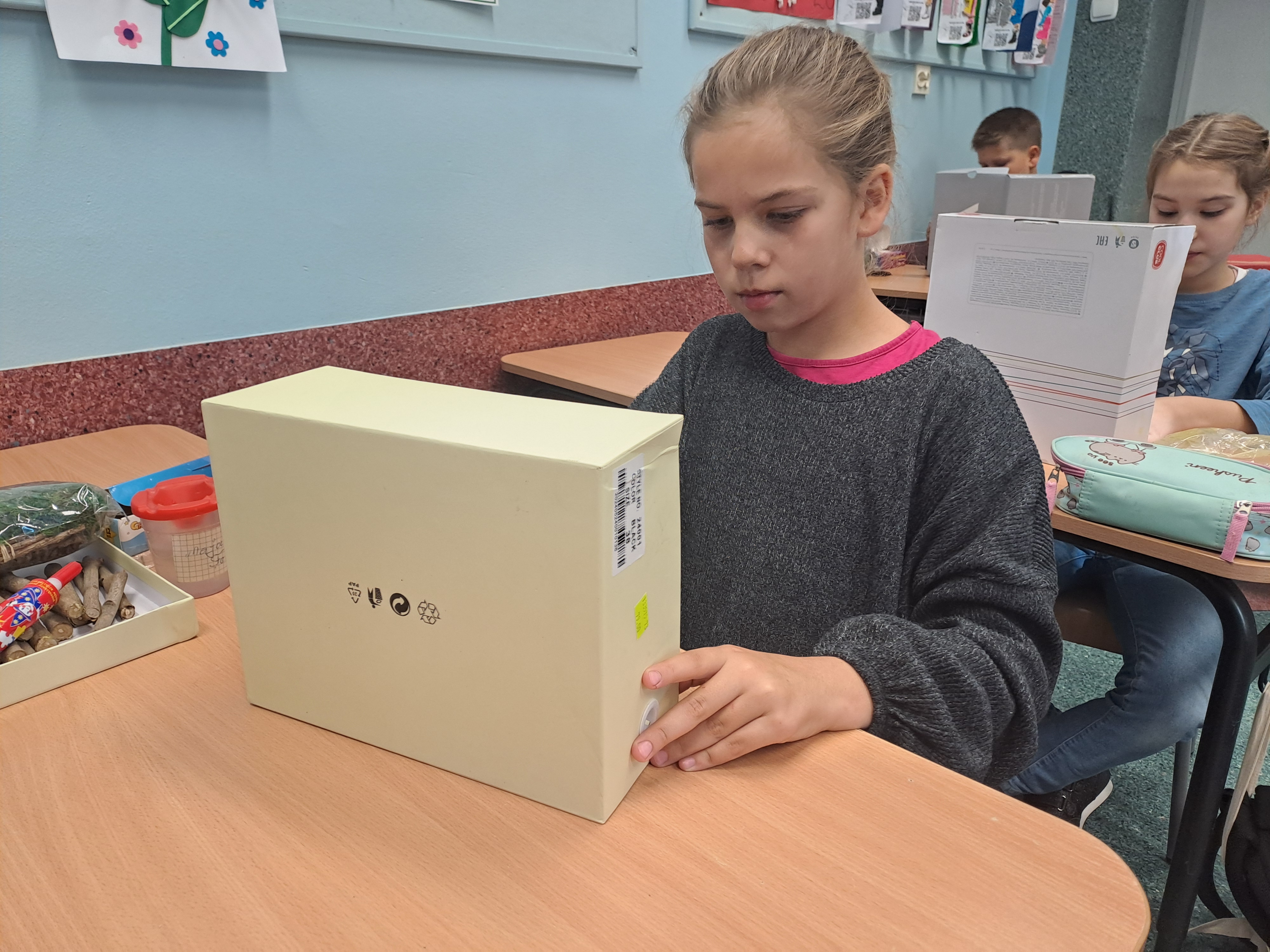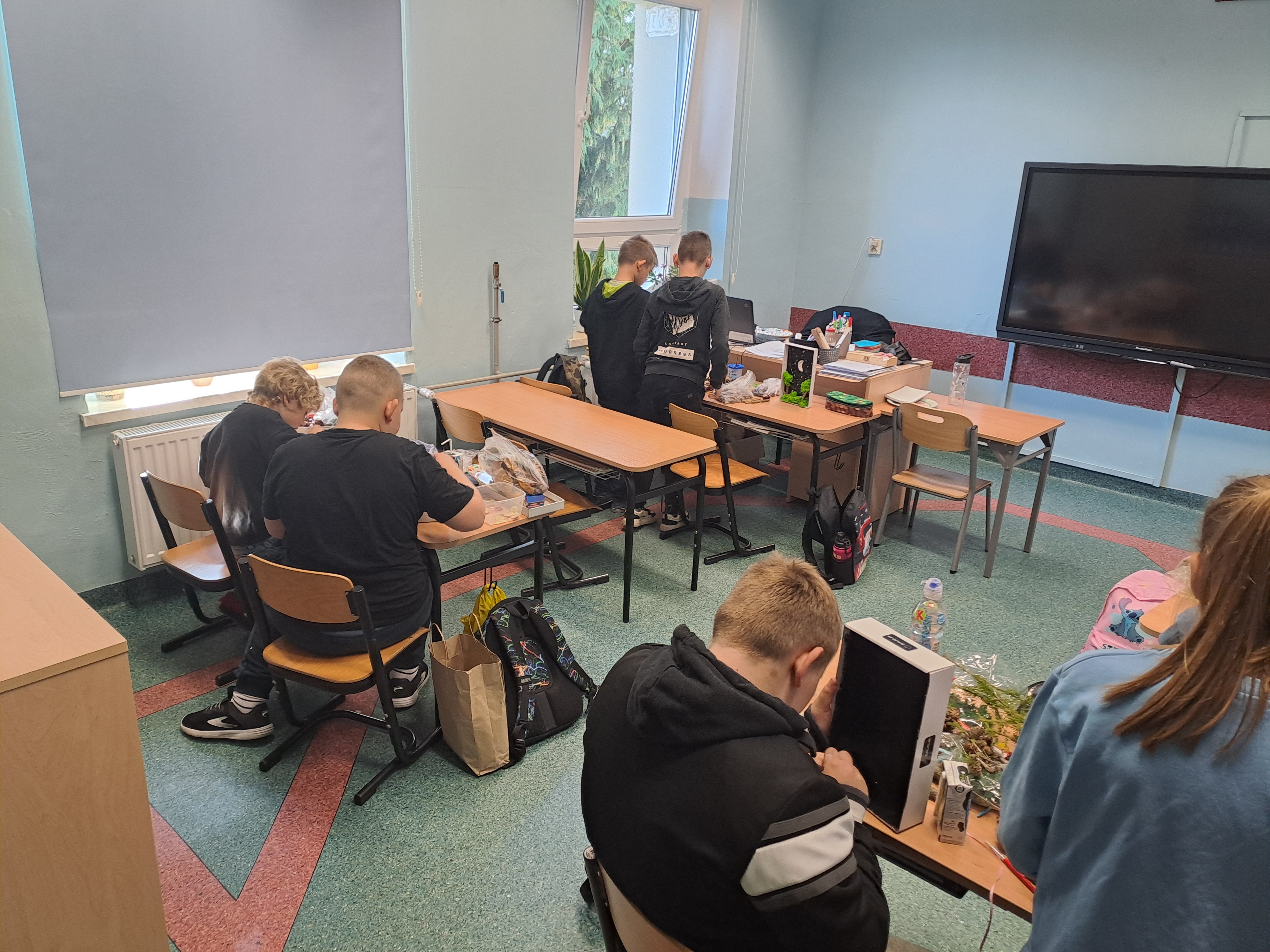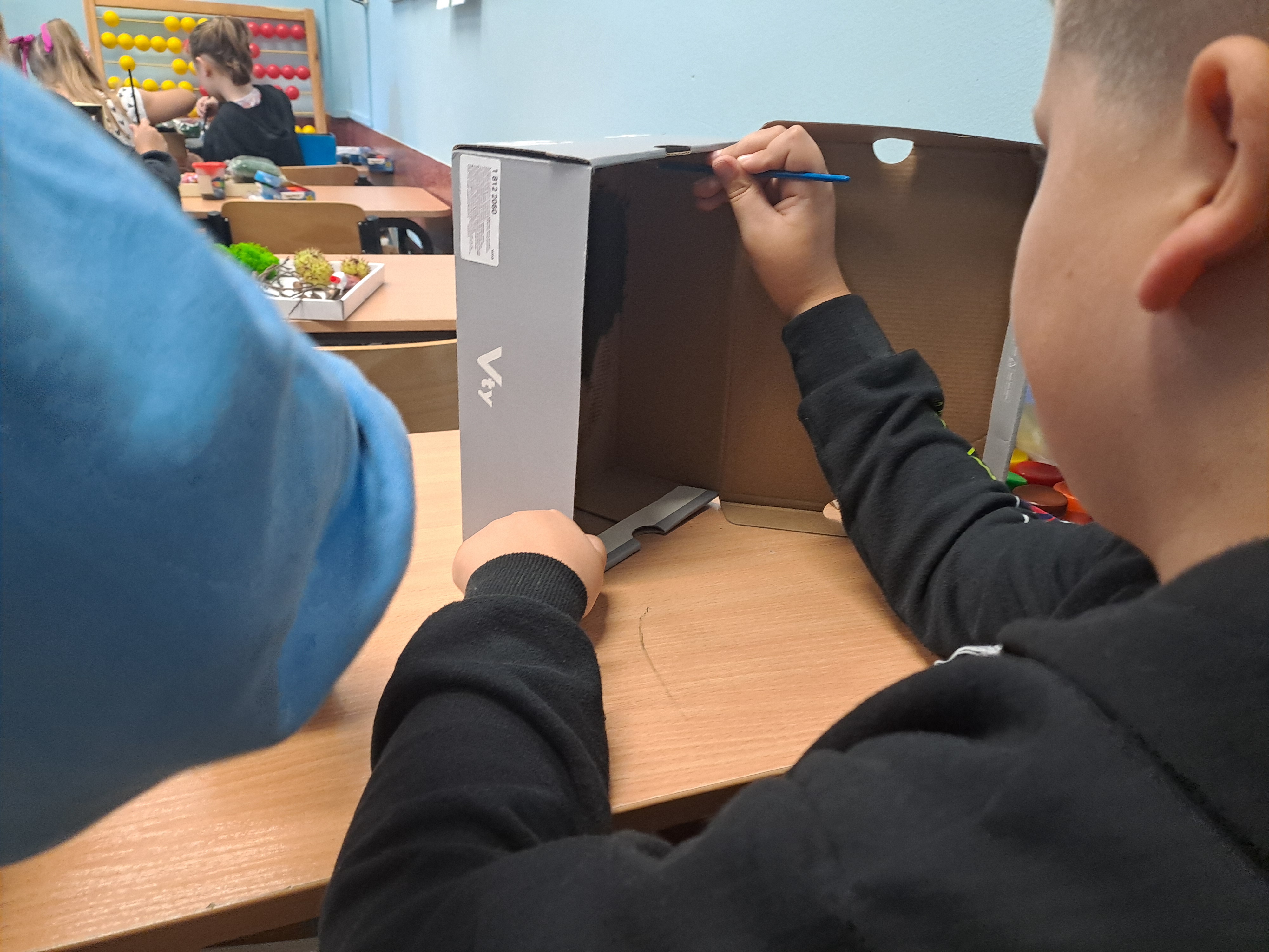 Tematem dzisiejszych zajęć był krajobraz w lesie. Pracowaliśmy z wykorzystaniem pudełek, farb oraz jesiennych skarbów: kasztanów, gałązek, szyszek i mchu. Dzięki swojej kreatywności i wyobraźni stworzyliśmy zaczarowane pudełka, w których powstały niezwykłe, bajkowe krajobrazy. Niektórzy uczniowie zdecydowali się przedstawić nocny pejzaż lasu, dodając tajemniczy nastrój swoim pracom. Wszystkie prace wyróżniały się pomysłowością i starannością wykonania.