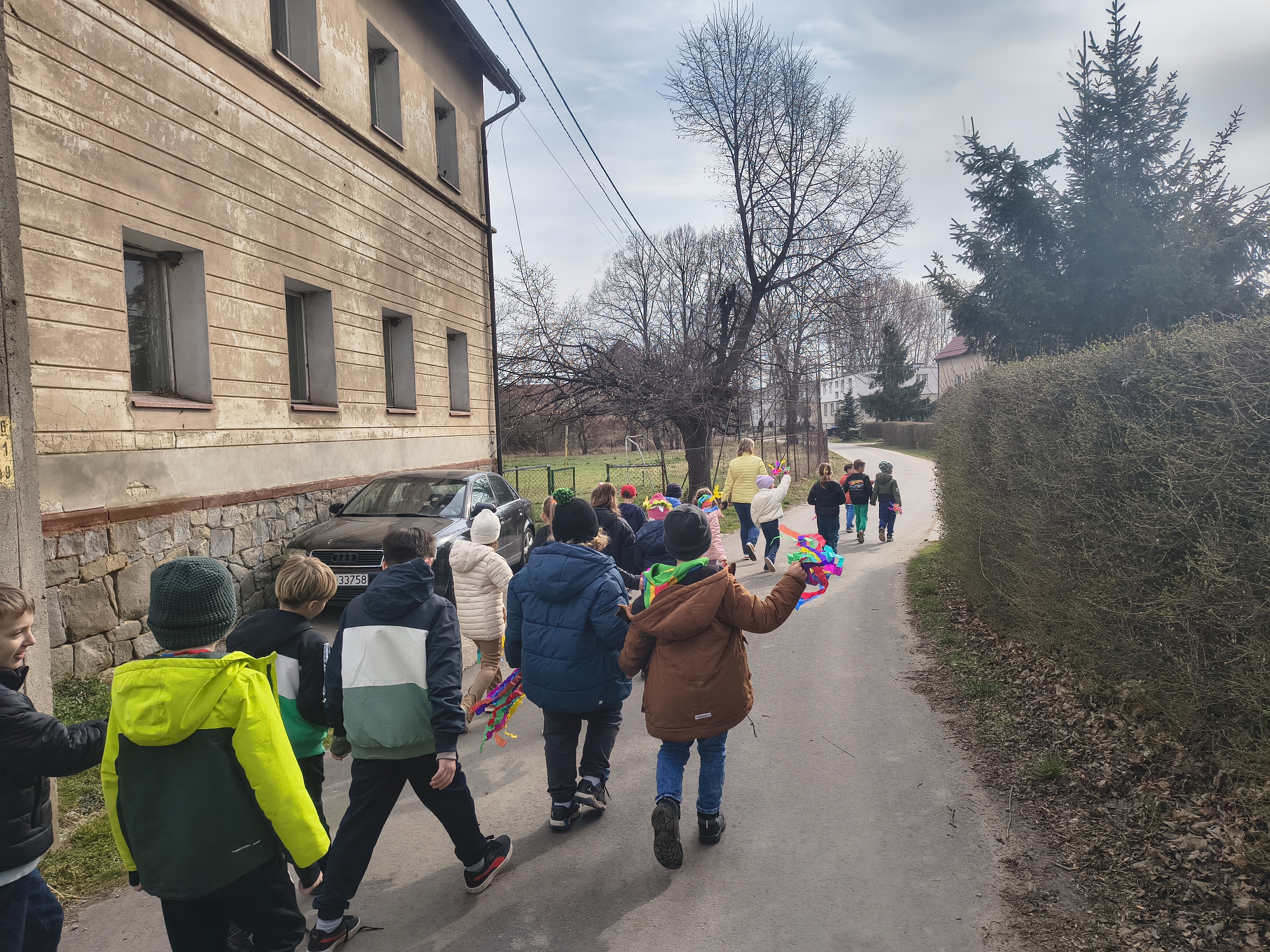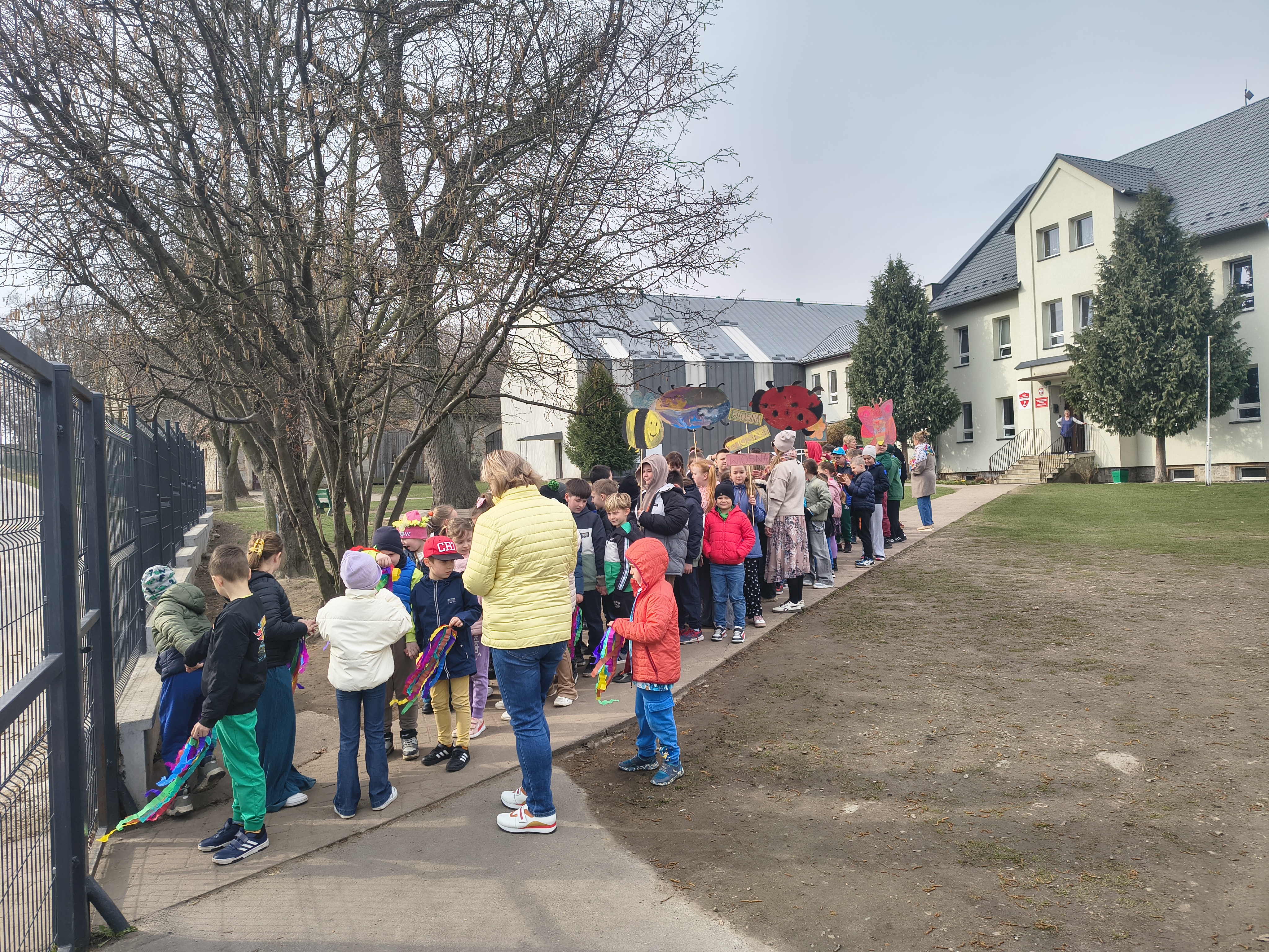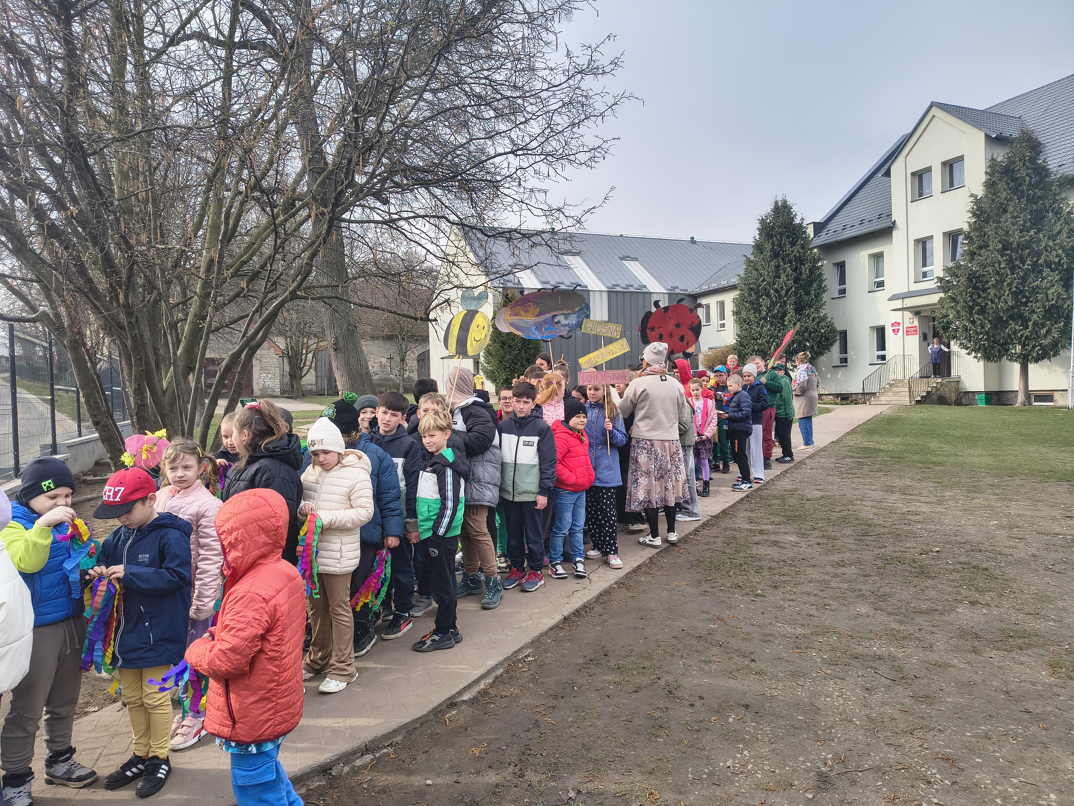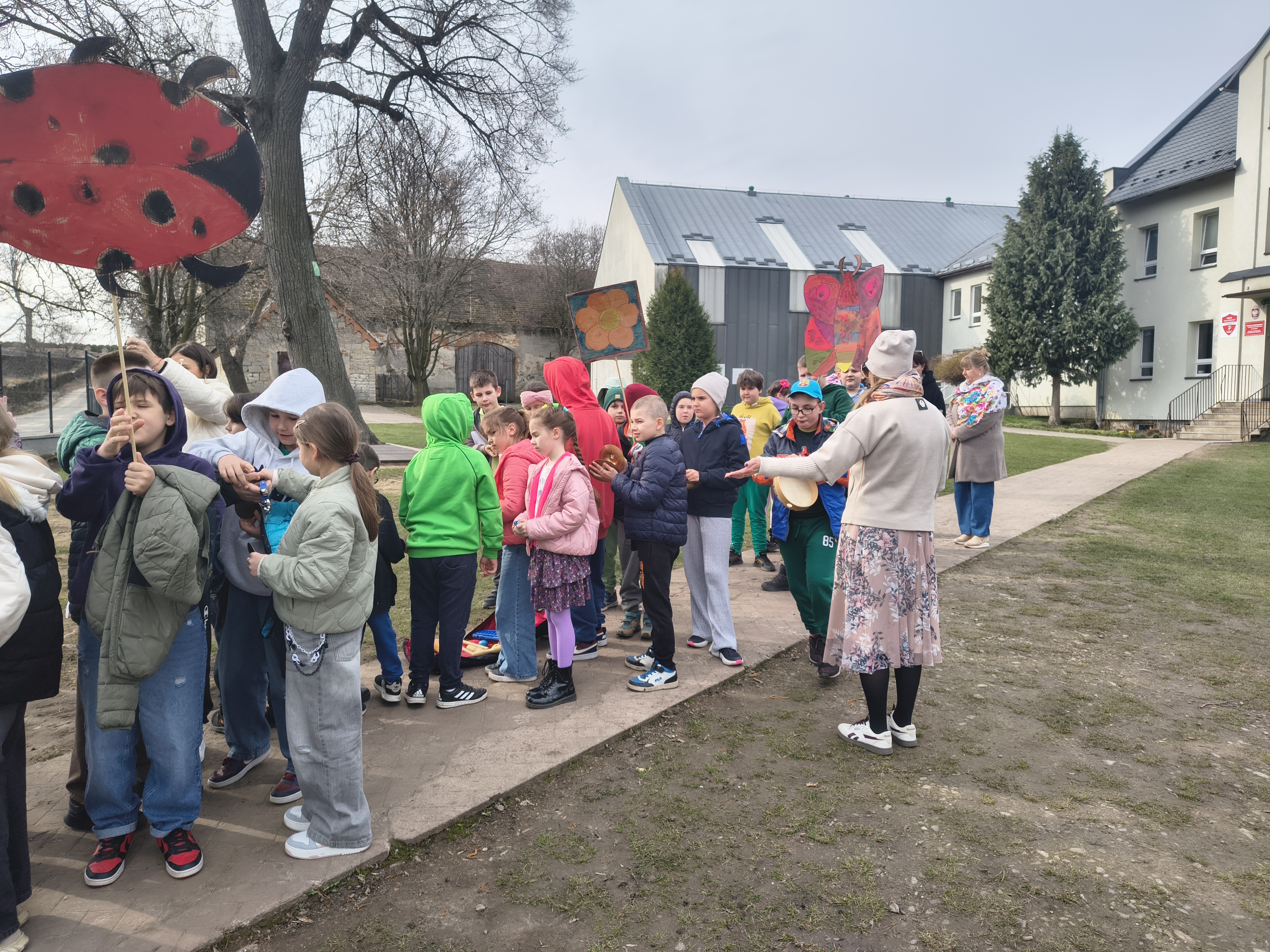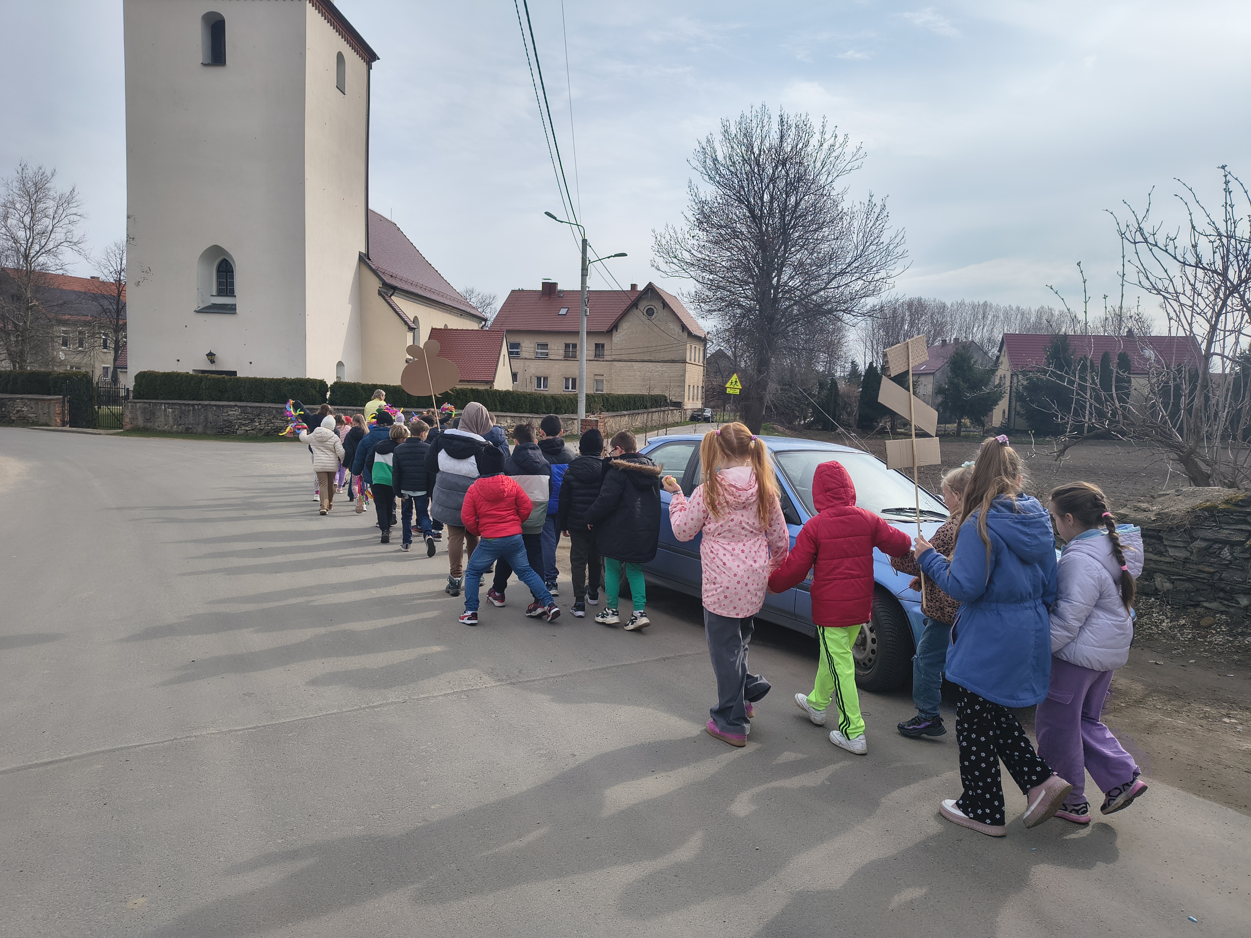 Wybraliśmy się na wspólny spacer przez wieś, podczas którego dzieci z uśmiechem na twarzach śpiewały wiosenne piosenki, witając nadchodzącą porę roku.