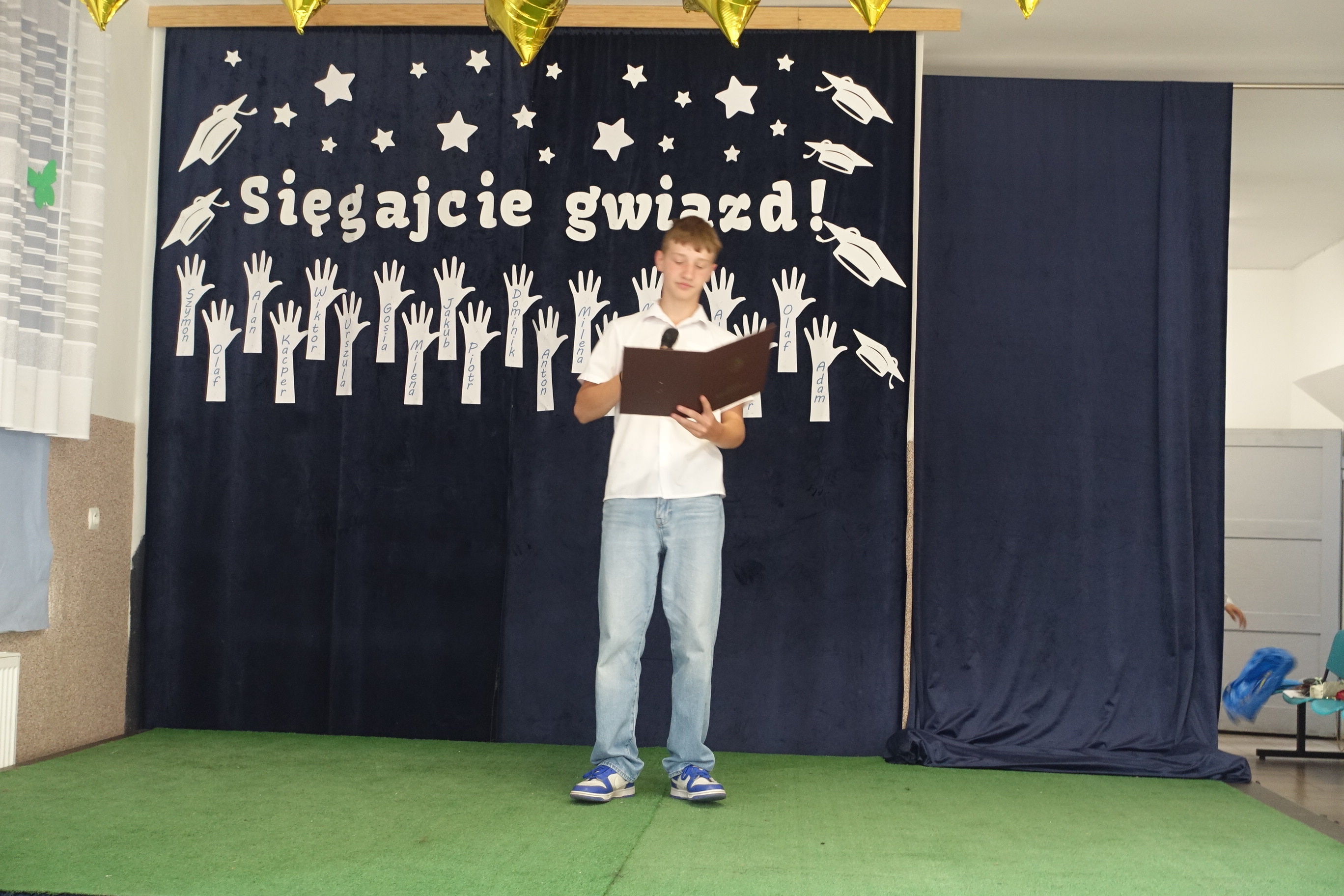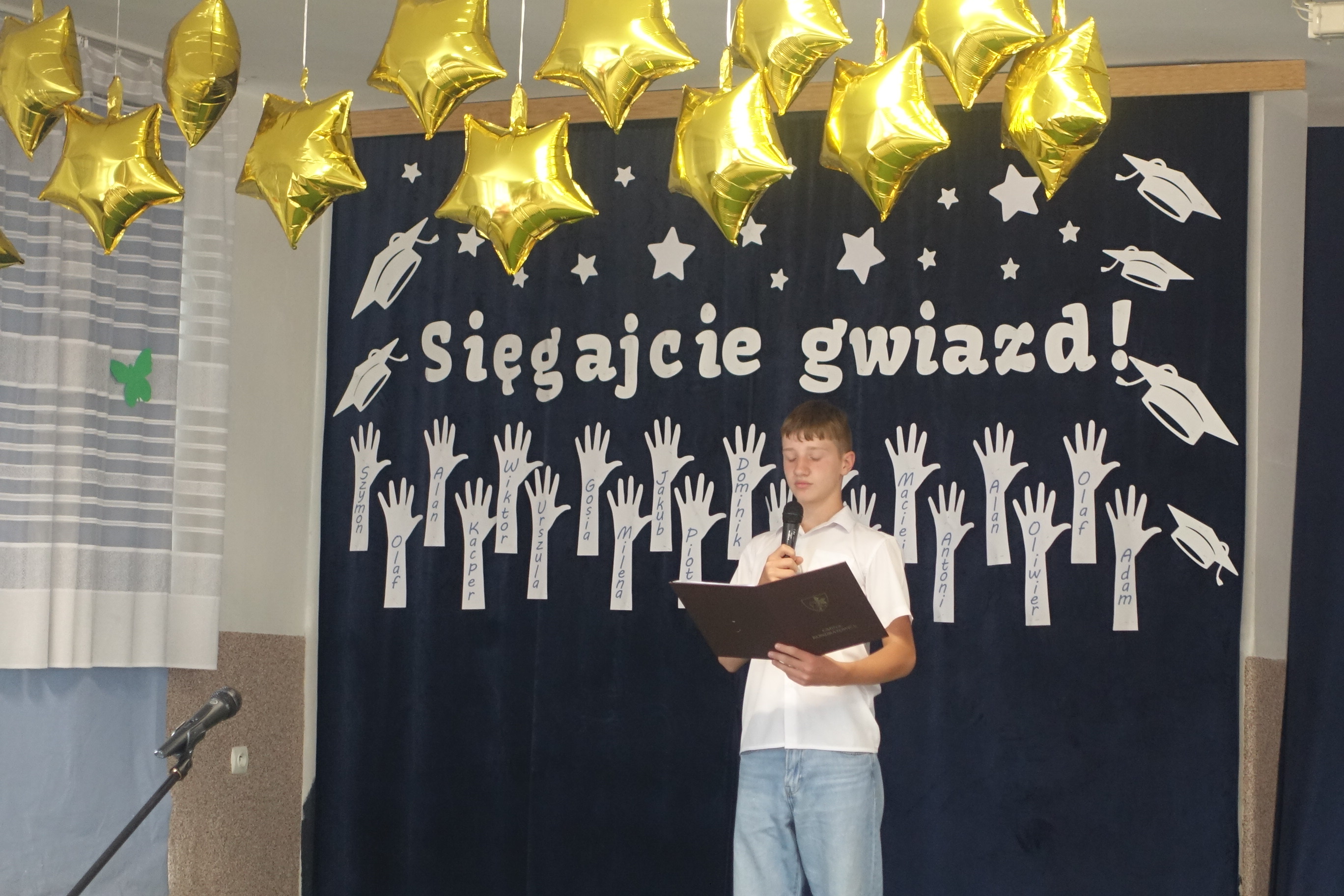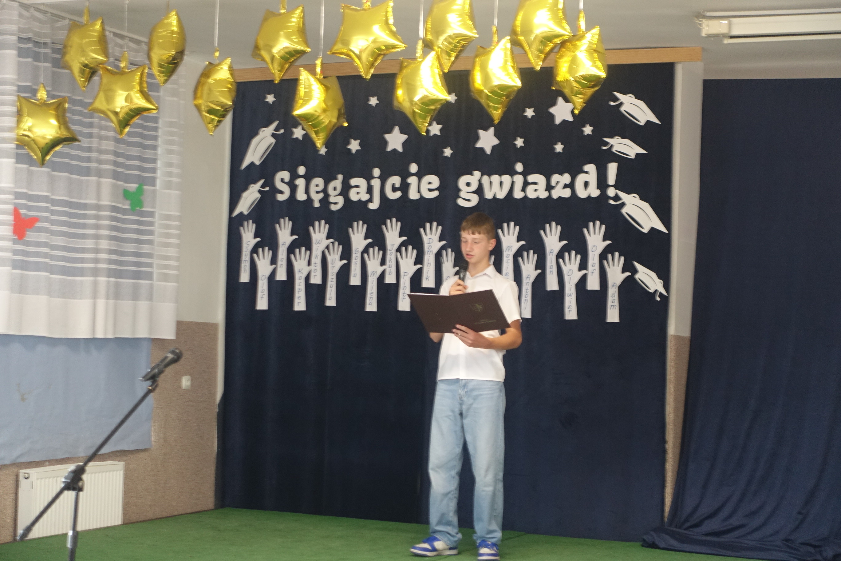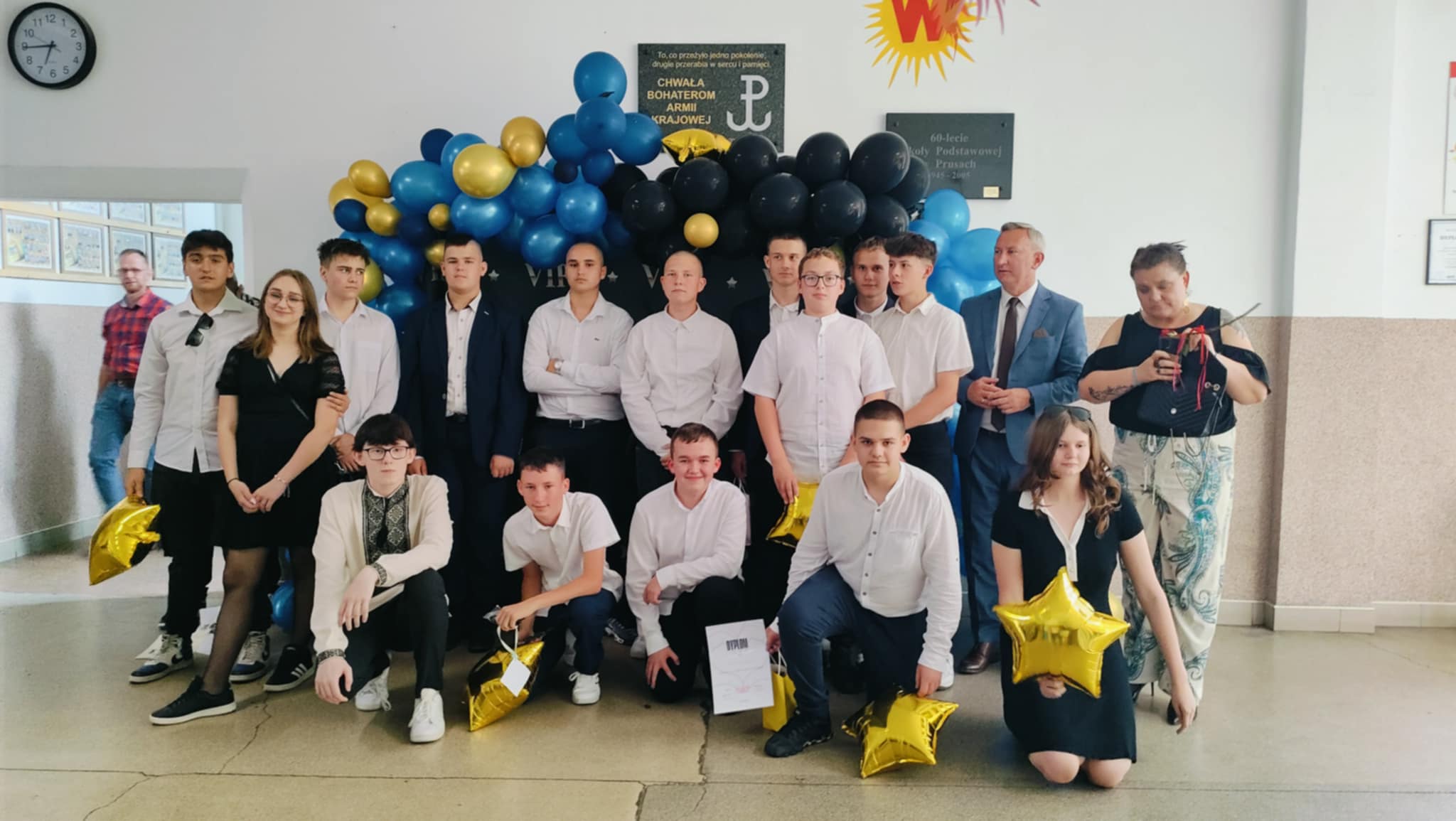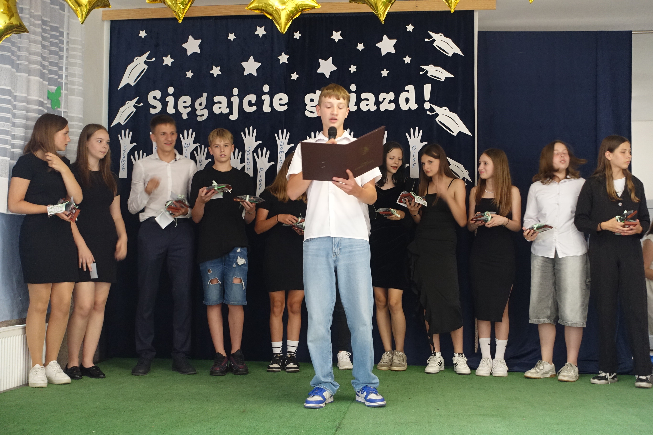 26. czerwca 2025 r. pożegnaliśmy klasę ósmą. Uroczystość była pełna wzruszeń, ale także pozytywnej energii, której jak zwykle dostarczyli nam nasi - już absolwenci. Hasło przwodnie pożegnania brzmiało: Sięgajcie gwiazd i cały przekaz tego wydarzenia skupił się wokól tej idei. Życzenia absolwentom złożyli: Dyrektos Szkoły, Wójt Gminy Kondtratowice, Przewodnicząca Rady Rodziców i wychowawczyni klasy - pani Małgorzata Wójcik. Ściankę VIP przygotowały dla uczniów panie z Rady Rodziców i stąd takie wyjątkowe zdjęcia. Za wyniki w nauce oraz pracę na rzecz szkoły, pracę w wolontariacie, samorządzie uczniowskim, za służbę w poczcie sztandarowym uczniwie otrzymali dyplomy oraz nagrody rzeczowe ufundowane przez Radę Rodziców, samorząd uczniowski, szkołę. Tradycyjnie starszych kolegów pożegnali siómoklasiści. Nie mogło zabraknąć zabawnych wierszyków o każdym absolwencie. Listy gratulacyjne oraz podziękowania za pracę na rzecz szkoły odebrali również rodzice. Do nieba poszybowały także balony z marzeniami naszych ósmoklasistów - oby sie spełniły. Nie zabrakło także słodkiego poczęstunku, za który składamuy serdeczne podziękowania rodzicom.