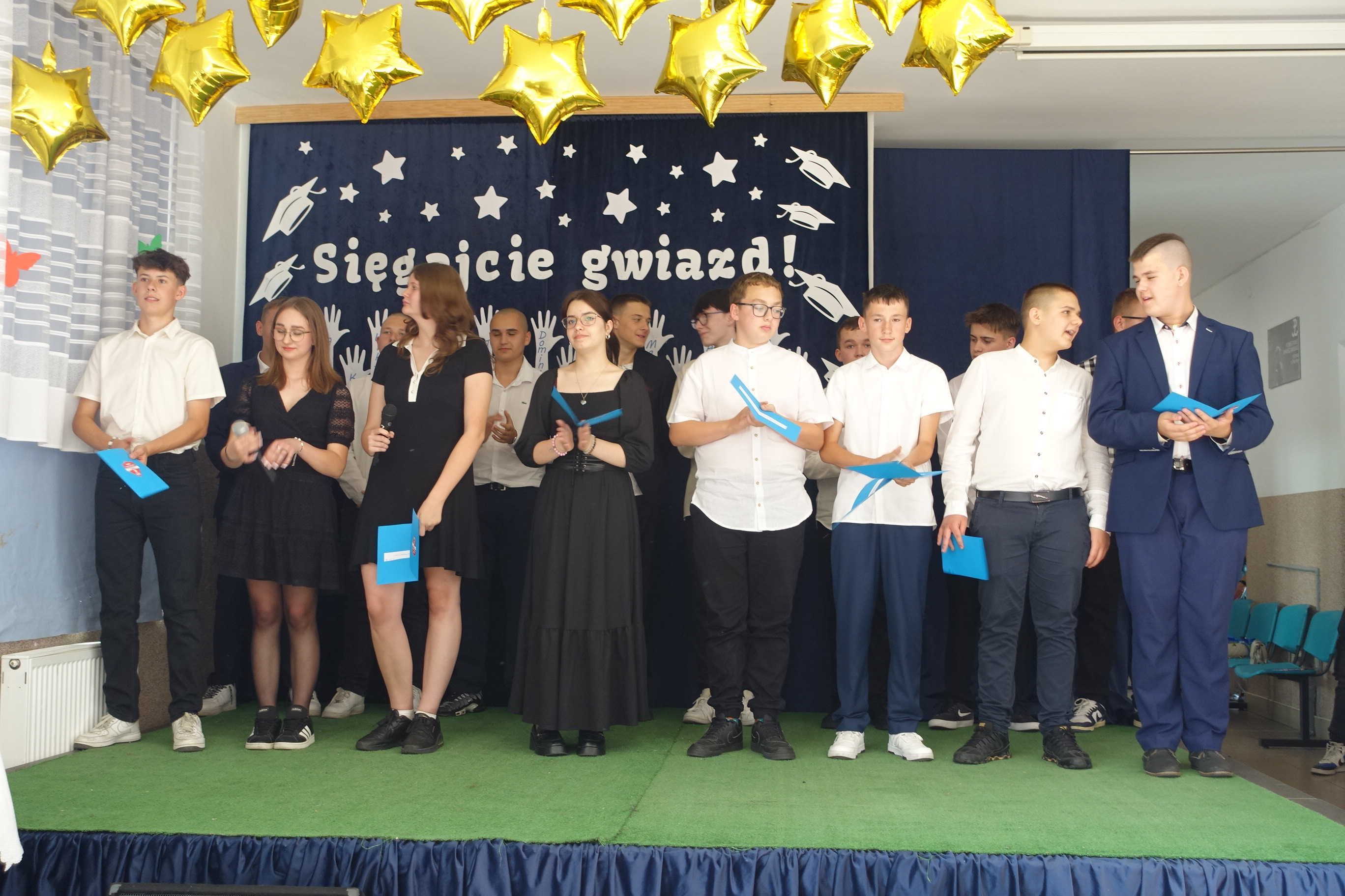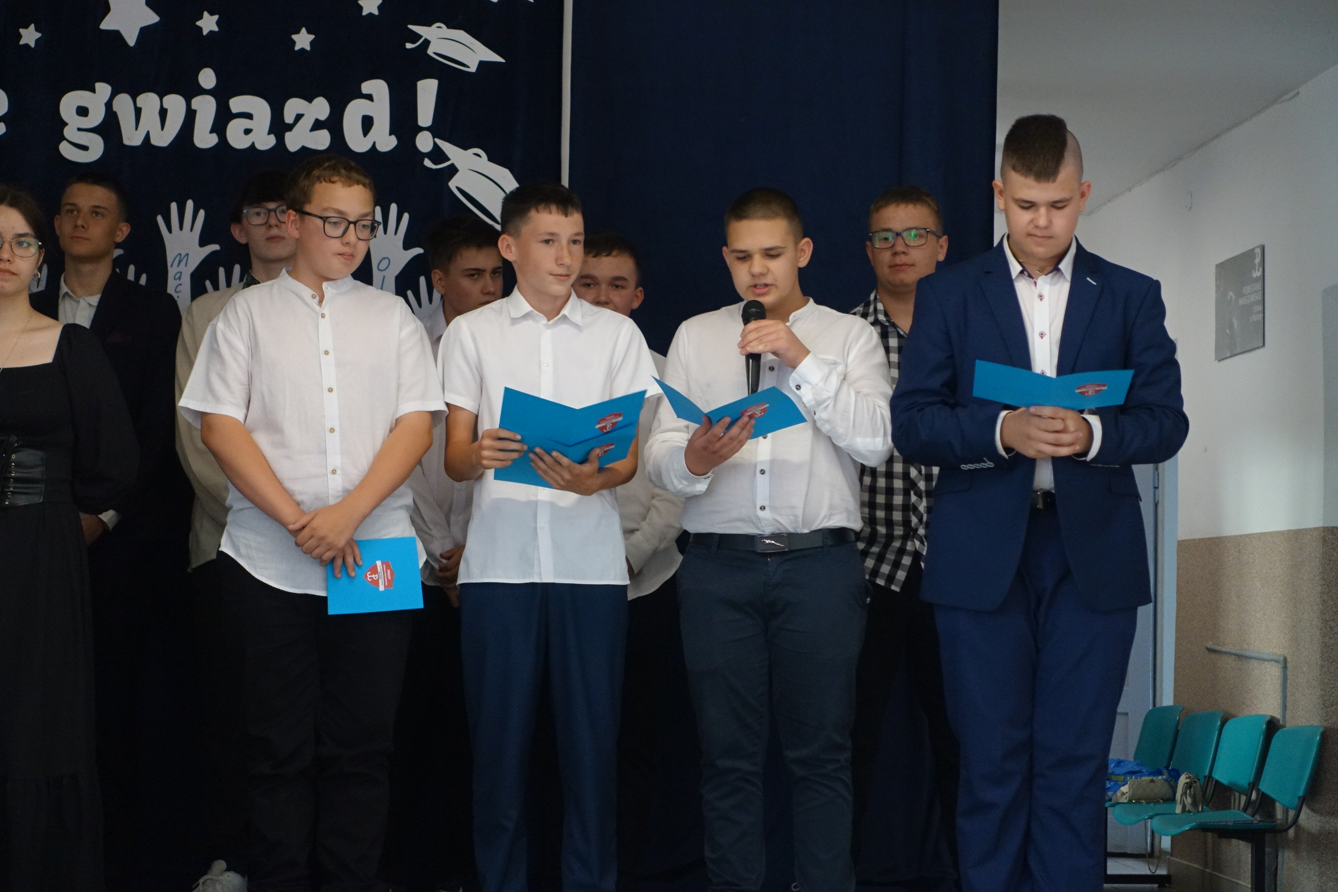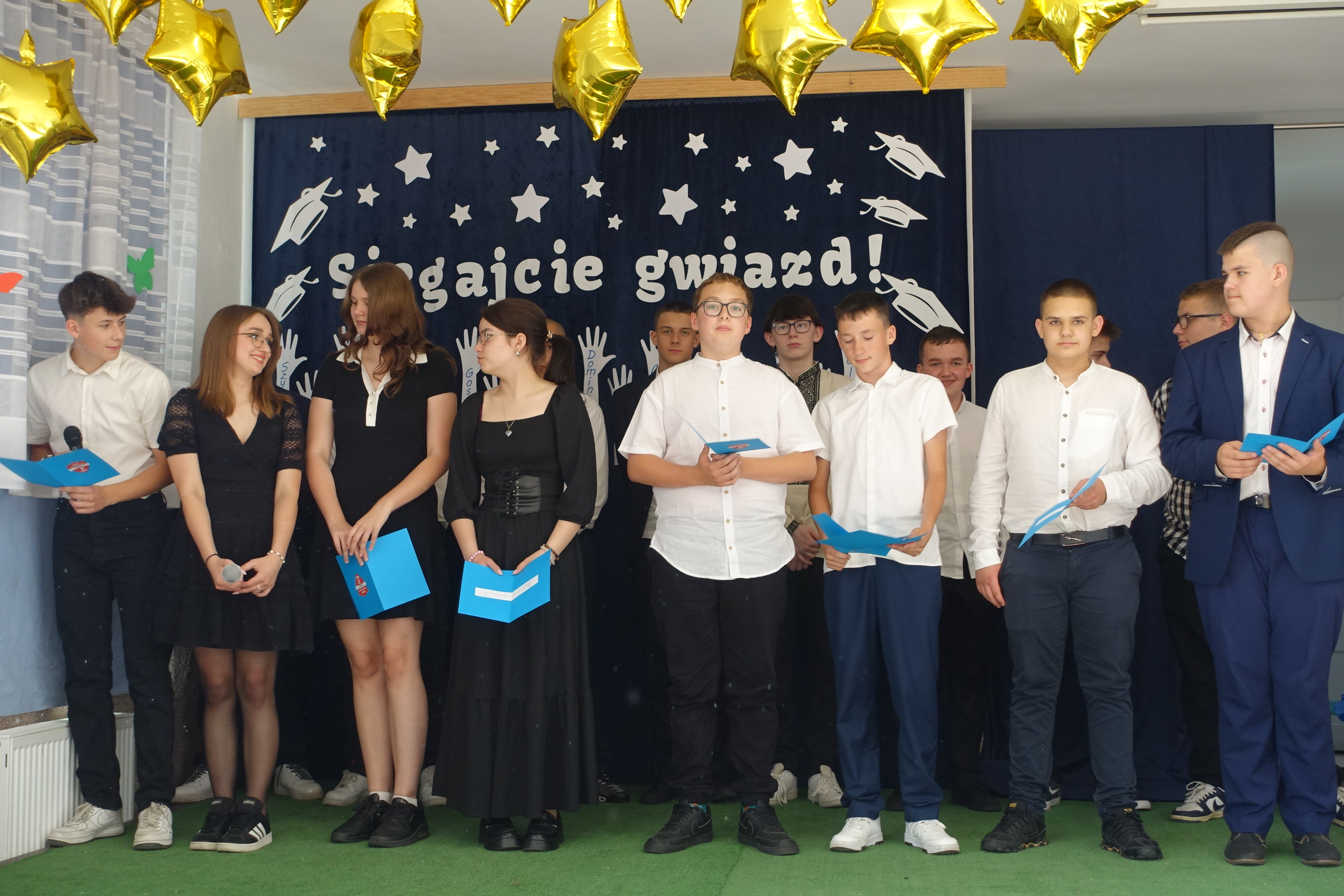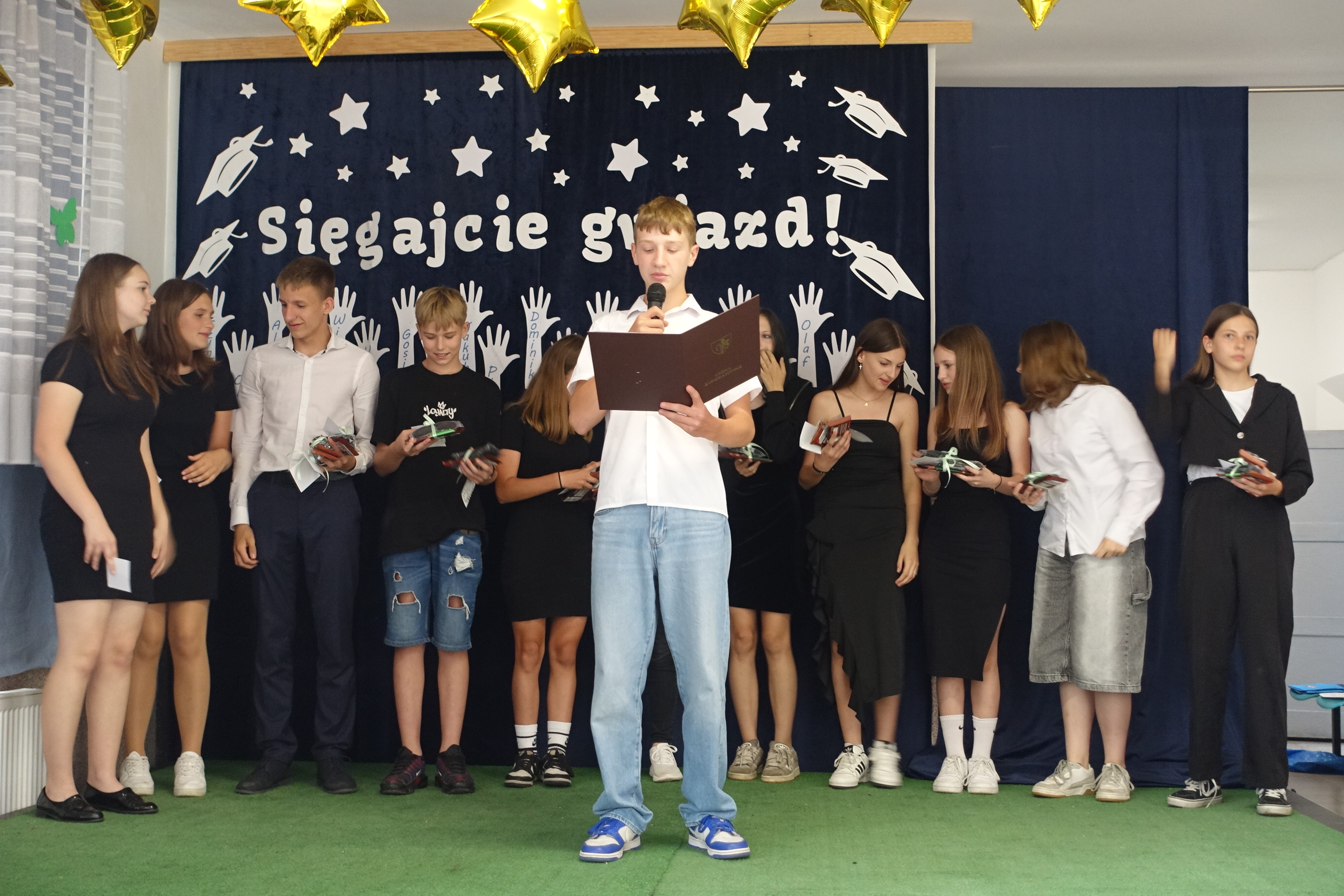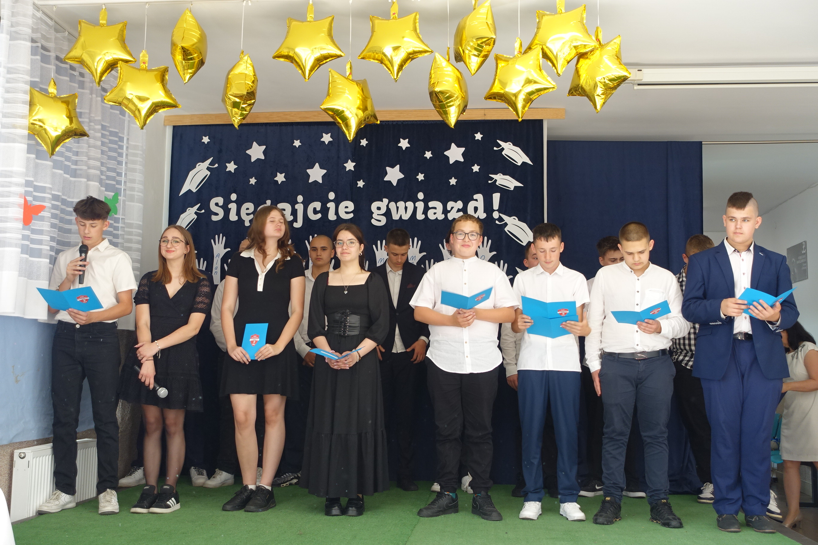 26. czerwca 2025 r. pożegnaliśmy klasę ósmą. Uroczystość była pełna wzruszeń, ale także pozytywnej energii, której jak zwykle dostarczyli nam nasi - już absolwenci. Hasło przwodnie pożegnania brzmiało: Sięgajcie gwiazd i cały przekaz tego wydarzenia skupił się wokól tej idei. Życzenia absolwentom złożyli: Dyrektos Szkoły, Wójt Gminy Kondtratowice, Przewodnicząca Rady Rodziców i wychowawczyni klasy - pani Małgorzata Wójcik. Ściankę VIP przygotowały dla uczniów panie z Rady Rodziców i stąd takie wyjątkowe zdjęcia. Za wyniki w nauce oraz pracę na rzecz szkoły, pracę w wolontariacie, samorządzie uczniowskim, za służbę w poczcie sztandarowym uczniwie otrzymali dyplomy oraz nagrody rzeczowe ufundowane przez Radę Rodziców, samorząd uczniowski, szkołę. Tradycyjnie starszych kolegów pożegnali siómoklasiści. Nie mogło zabraknąć zabawnych wierszyków o każdym absolwencie. Listy gratulacyjne oraz podziękowania za pracę na rzecz szkoły odebrali również rodzice. Do nieba poszybowały także balony z marzeniami naszych ósmoklasistów - oby sie spełniły. Nie zabrakło także słodkiego poczęstunku, za który składamuy serdeczne podziękowania rodzicom.