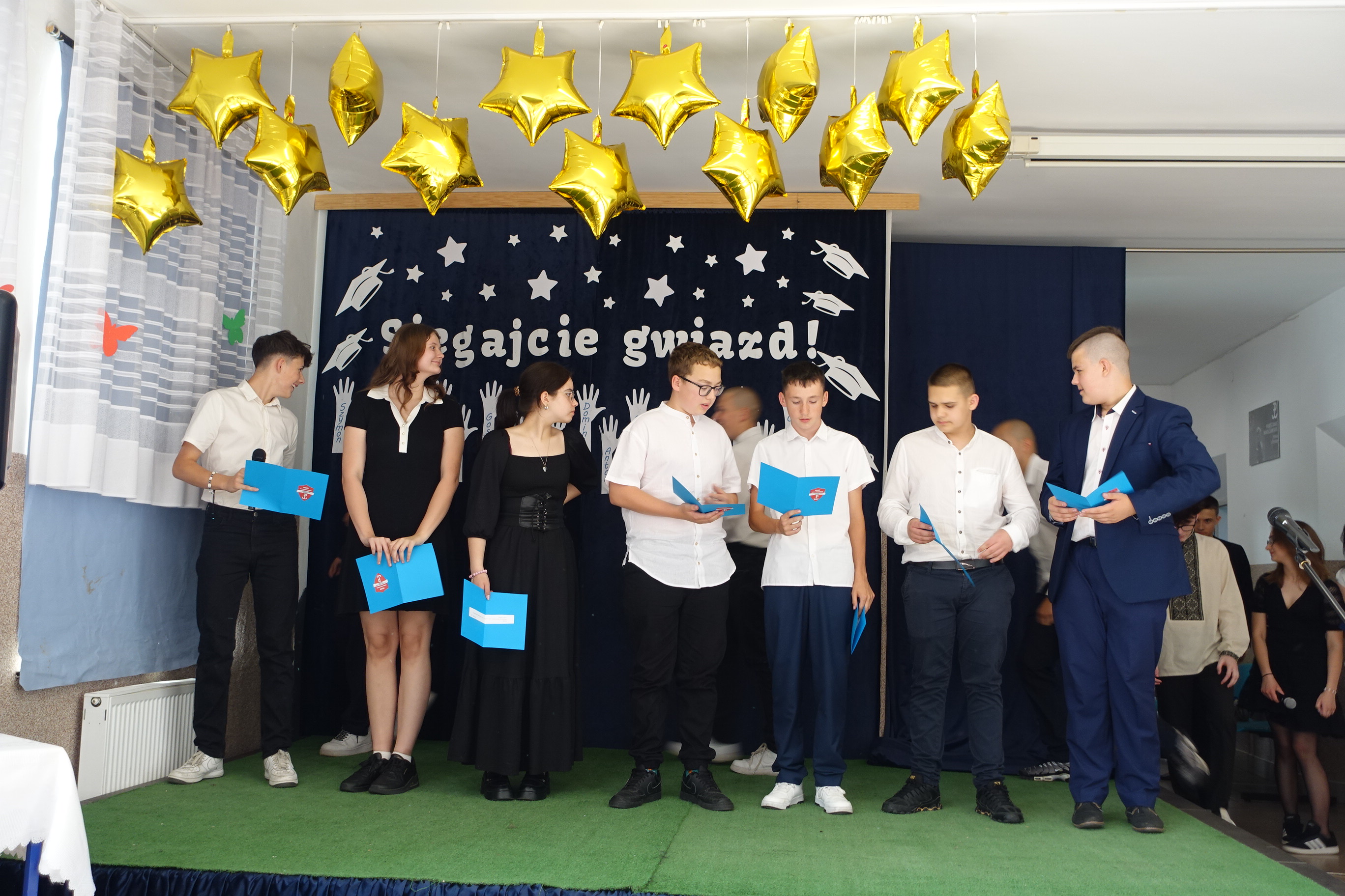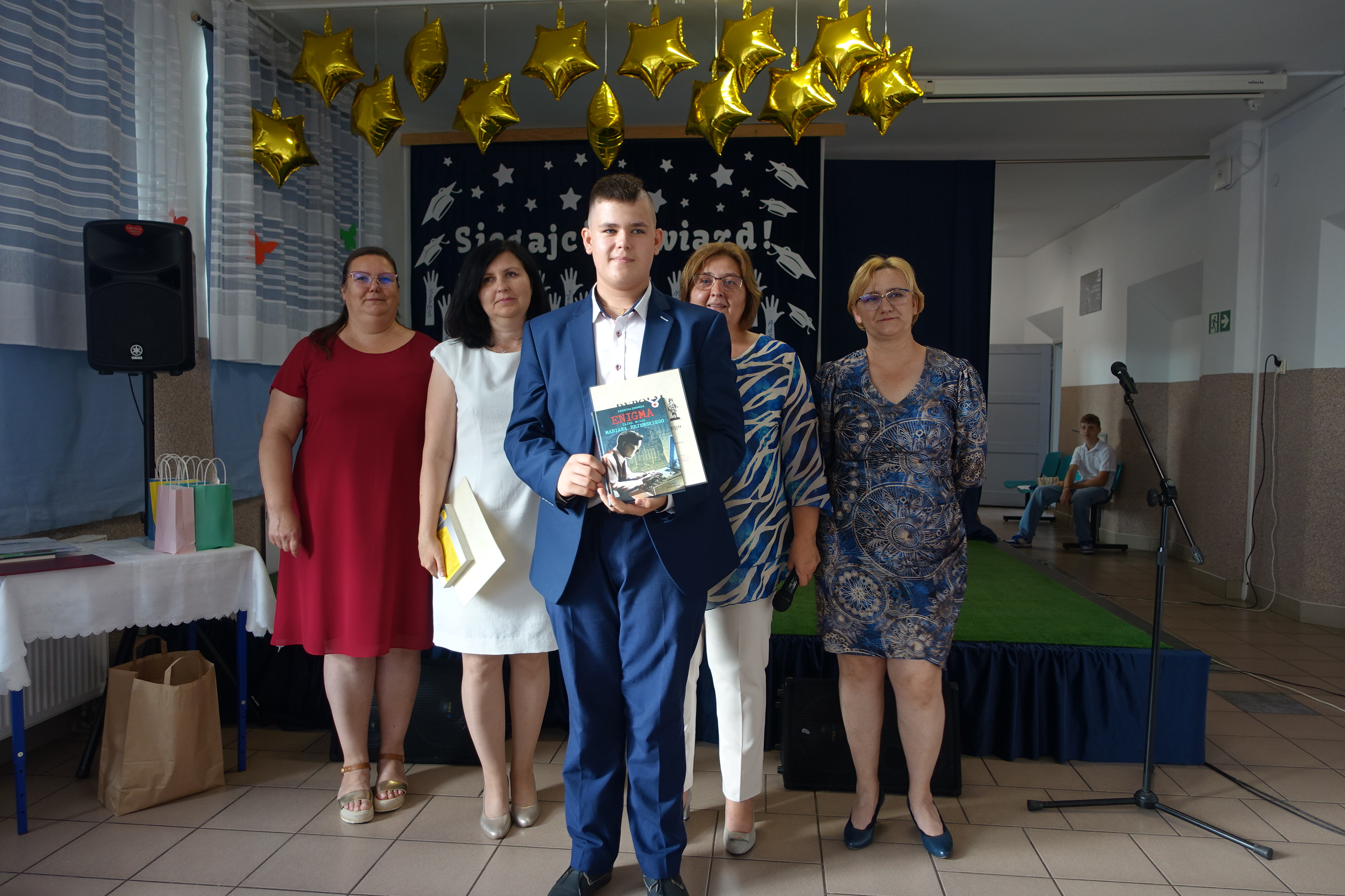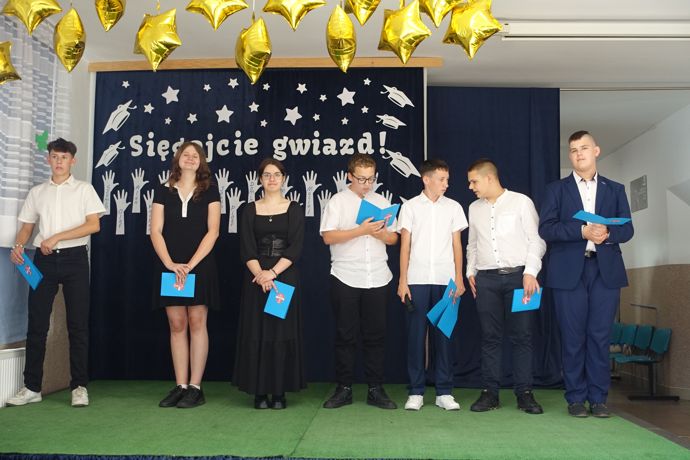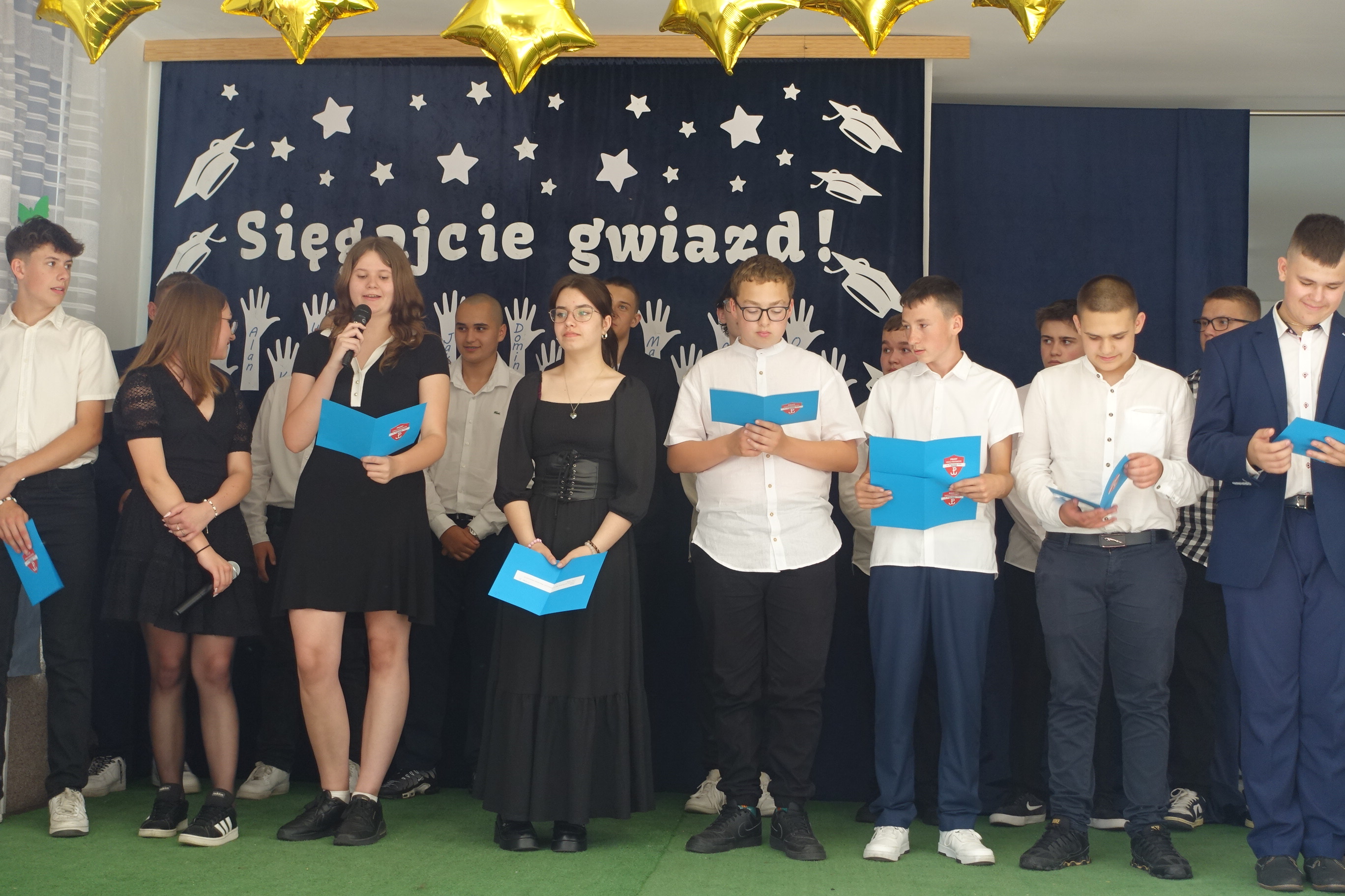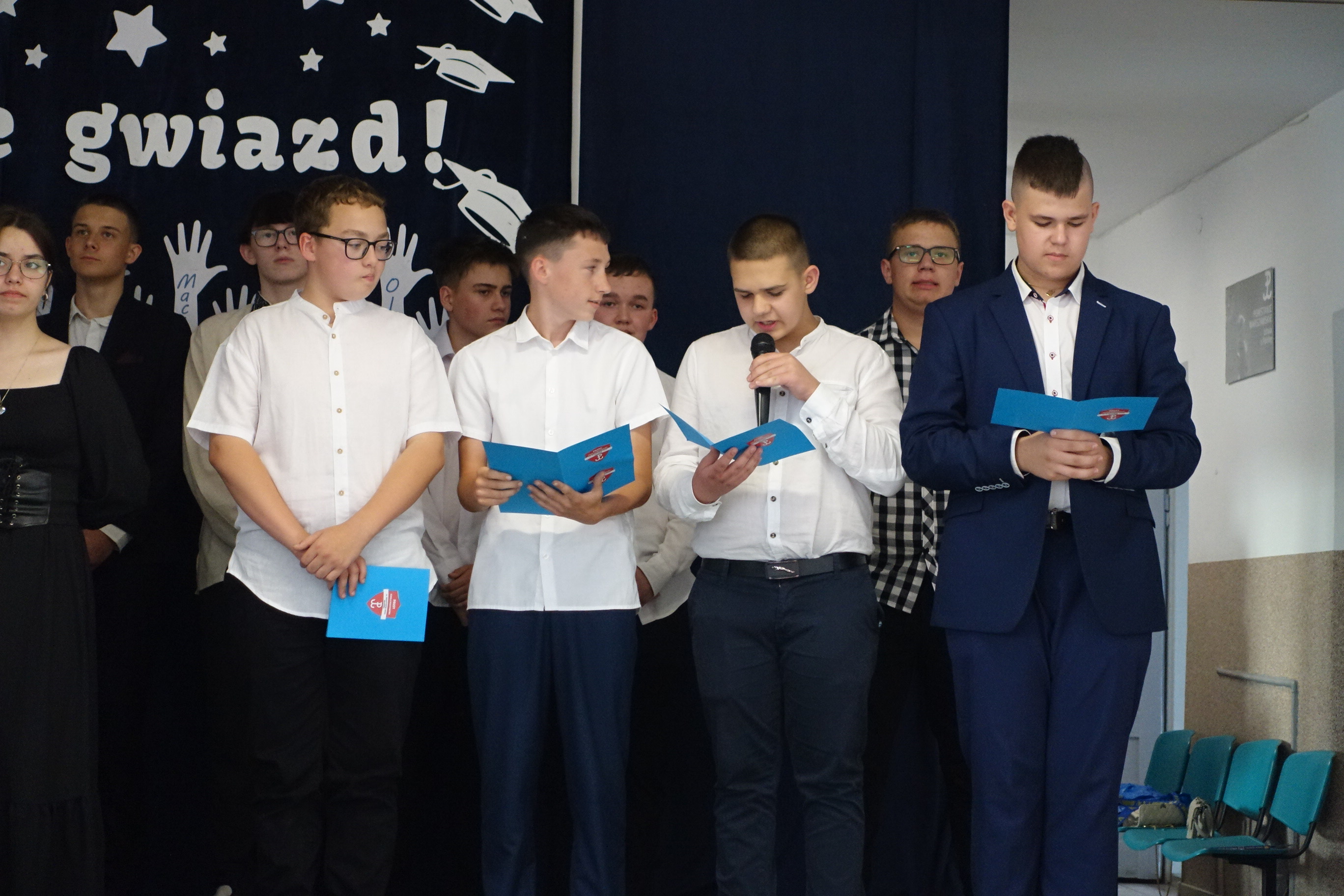 26. czerwca 2025 r. pożegnaliśmy klasę ósmą. Uroczystość była pełna wzruszeń, ale także pozytywnej energii, której jak zwykle dostarczyli nam nasi - już absolwenci. Hasło przwodnie pożegnania brzmiało: Sięgajcie gwiazd i cały przekaz tego wydarzenia skupił się wokól tej idei. Życzenia absolwentom złożyli: Dyrektos Szkoły, Wójt Gminy Kondtratowice, Przewodnicząca Rady Rodziców i wychowawczyni klasy - pani Małgorzata Wójcik. Ściankę VIP przygotowały dla uczniów panie z Rady Rodziców i stąd takie wyjątkowe zdjęcia. Za wyniki w nauce oraz pracę na rzecz szkoły, pracę w wolontariacie, samorządzie uczniowskim, za służbę w poczcie sztandarowym uczniwie otrzymali dyplomy oraz nagrody rzeczowe ufundowane przez Radę Rodziców, samorząd uczniowski, szkołę. Tradycyjnie starszych kolegów pożegnali siómoklasiści. Nie mogło zabraknąć zabawnych wierszyków o każdym absolwencie. Listy gratulacyjne oraz podziękowania za pracę na rzecz szkoły odebrali również rodzice. Do nieba poszybowały także balony z marzeniami naszych ósmoklasistów - oby sie spełniły. Nie zabrakło także słodkiego poczęstunku, za który składamuy serdeczne podziękowania rodzicom.