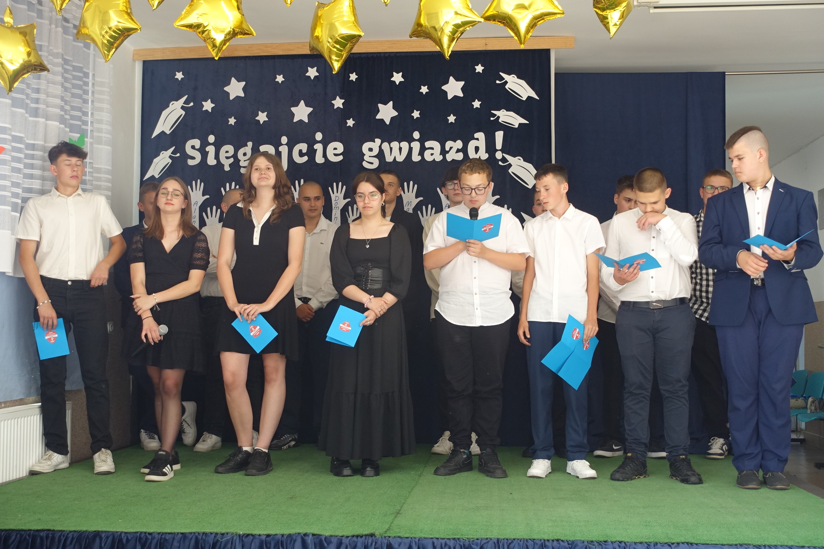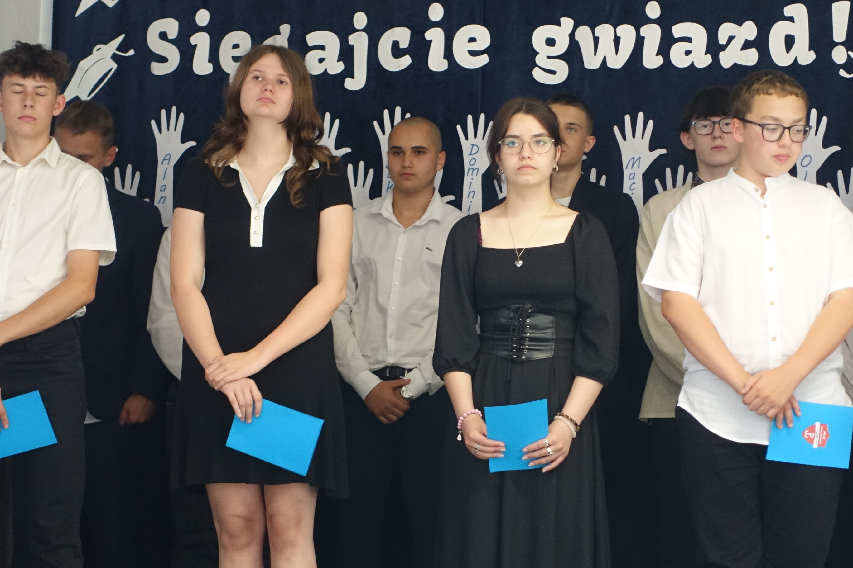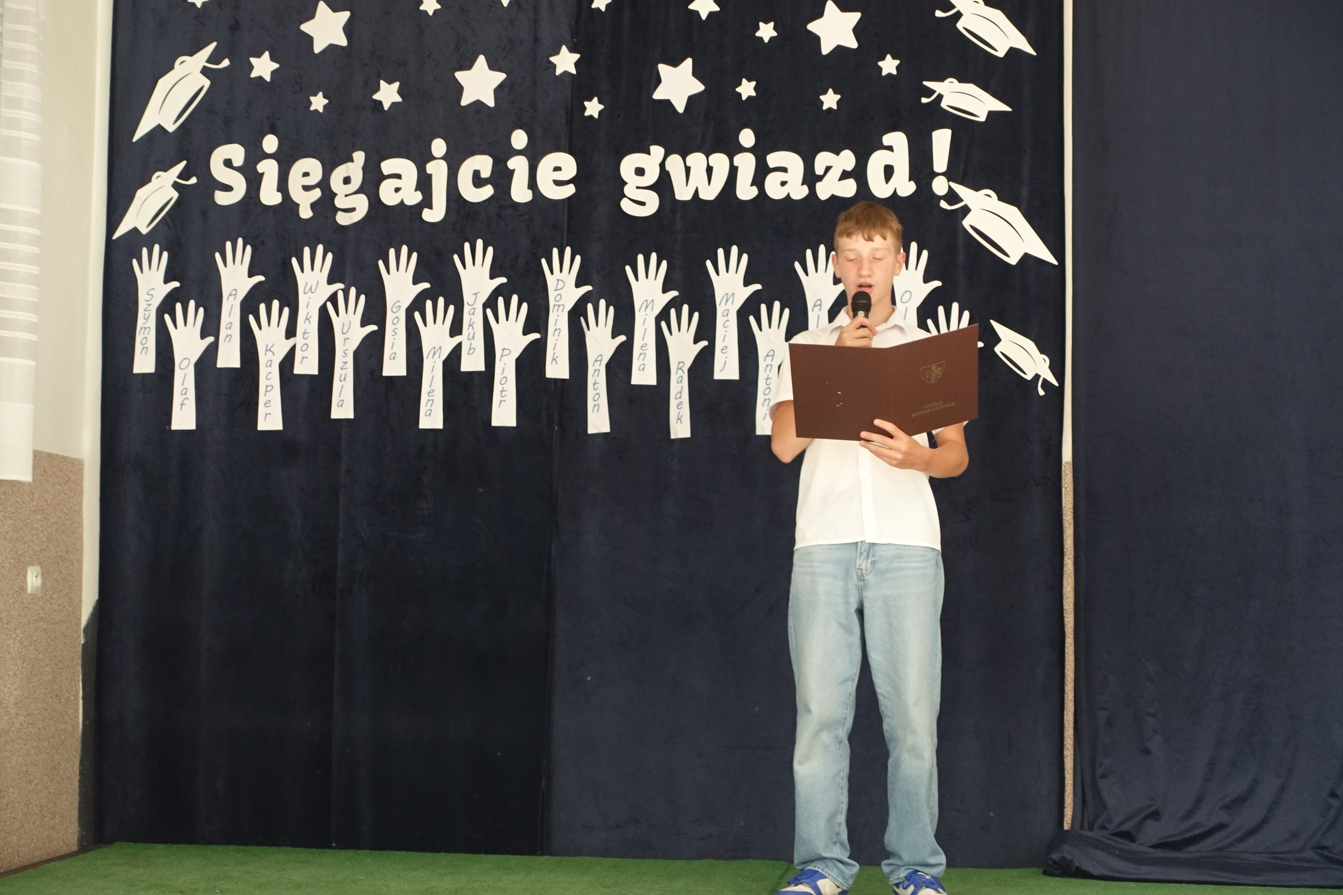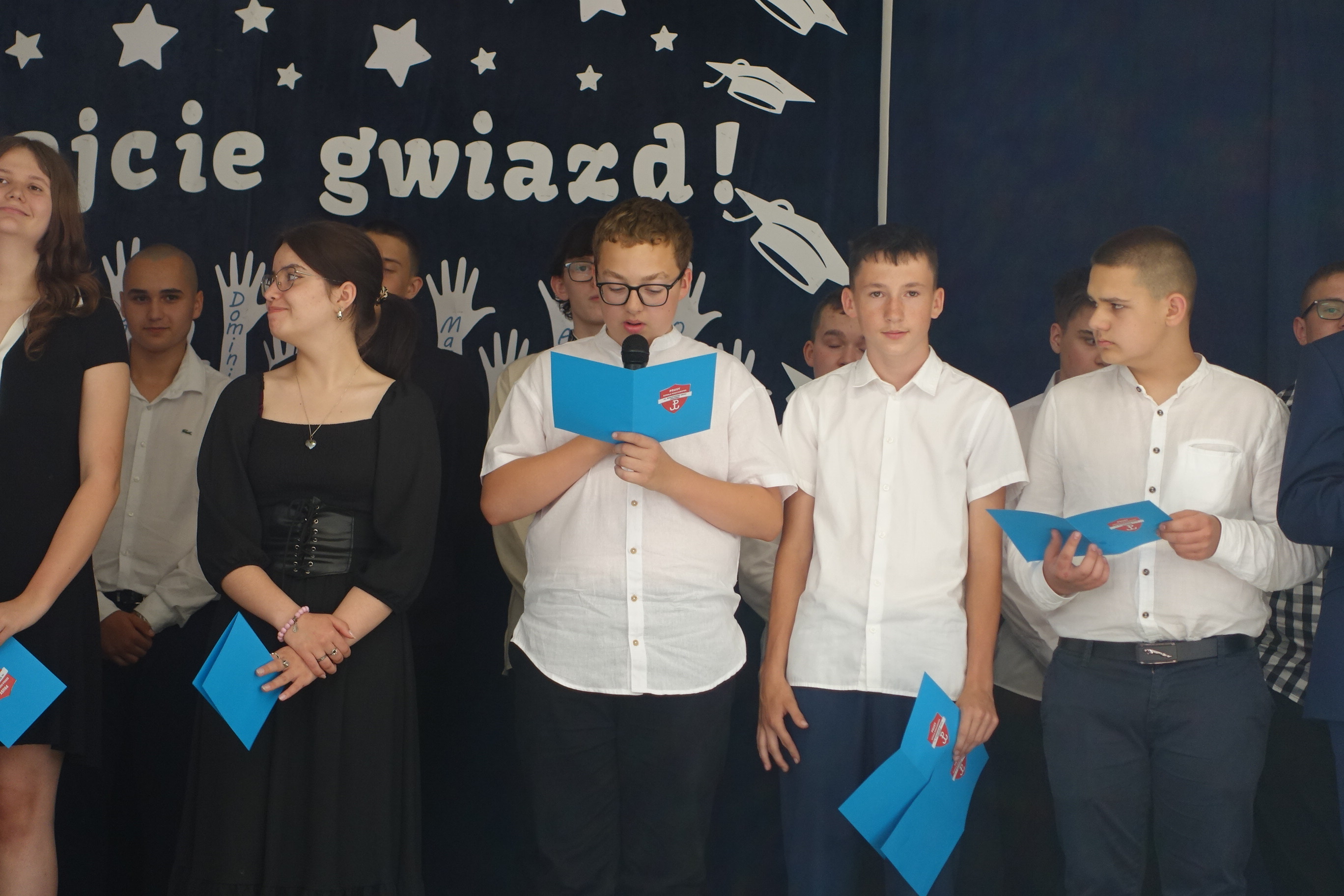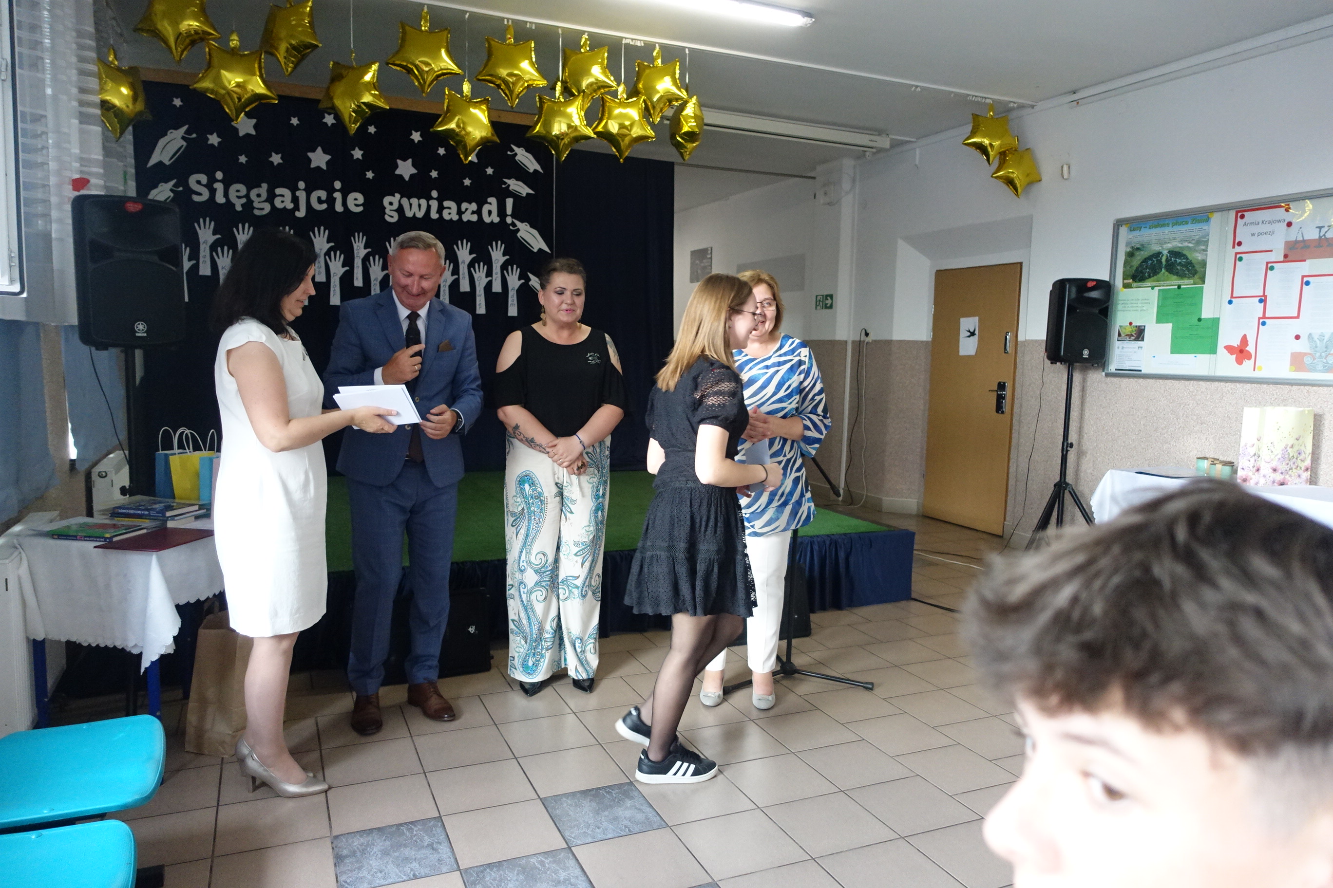26. czerwca 2025 r. pożegnaliśmy klasę ósmą. Uroczystość była pełna wzruszeń, ale także pozytywnej energii, której jak zwykle dostarczyli nam nasi - już absolwenci. Hasło przwodnie pożegnania brzmiało: Sięgajcie gwiazd i cały przekaz tego wydarzenia skupił się wokól tej idei. Życzenia absolwentom złożyli: Dyrektos Szkoły, Wójt Gminy Kondtratowice, Przewodnicząca Rady Rodziców i wychowawczyni klasy - pani Małgorzata Wójcik. Ściankę VIP przygotowały dla uczniów panie z Rady Rodziców i stąd takie wyjątkowe zdjęcia. Za wyniki w nauce oraz pracę na rzecz szkoły, pracę w wolontariacie, samorządzie uczniowskim, za służbę w poczcie sztandarowym uczniwie otrzymali dyplomy oraz nagrody rzeczowe ufundowane przez Radę Rodziców, samorząd uczniowski, szkołę. Tradycyjnie starszych kolegów pożegnali siómoklasiści. Nie mogło zabraknąć zabawnych wierszyków o każdym absolwencie. Listy gratulacyjne oraz podziękowania za pracę na rzecz szkoły odebrali również rodzice. Do nieba poszybowały także balony z marzeniami naszych ósmoklasistów - oby sie spełniły. Nie zabrakło także słodkiego poczęstunku, za który składamuy serdeczne podziękowania rodzicom.