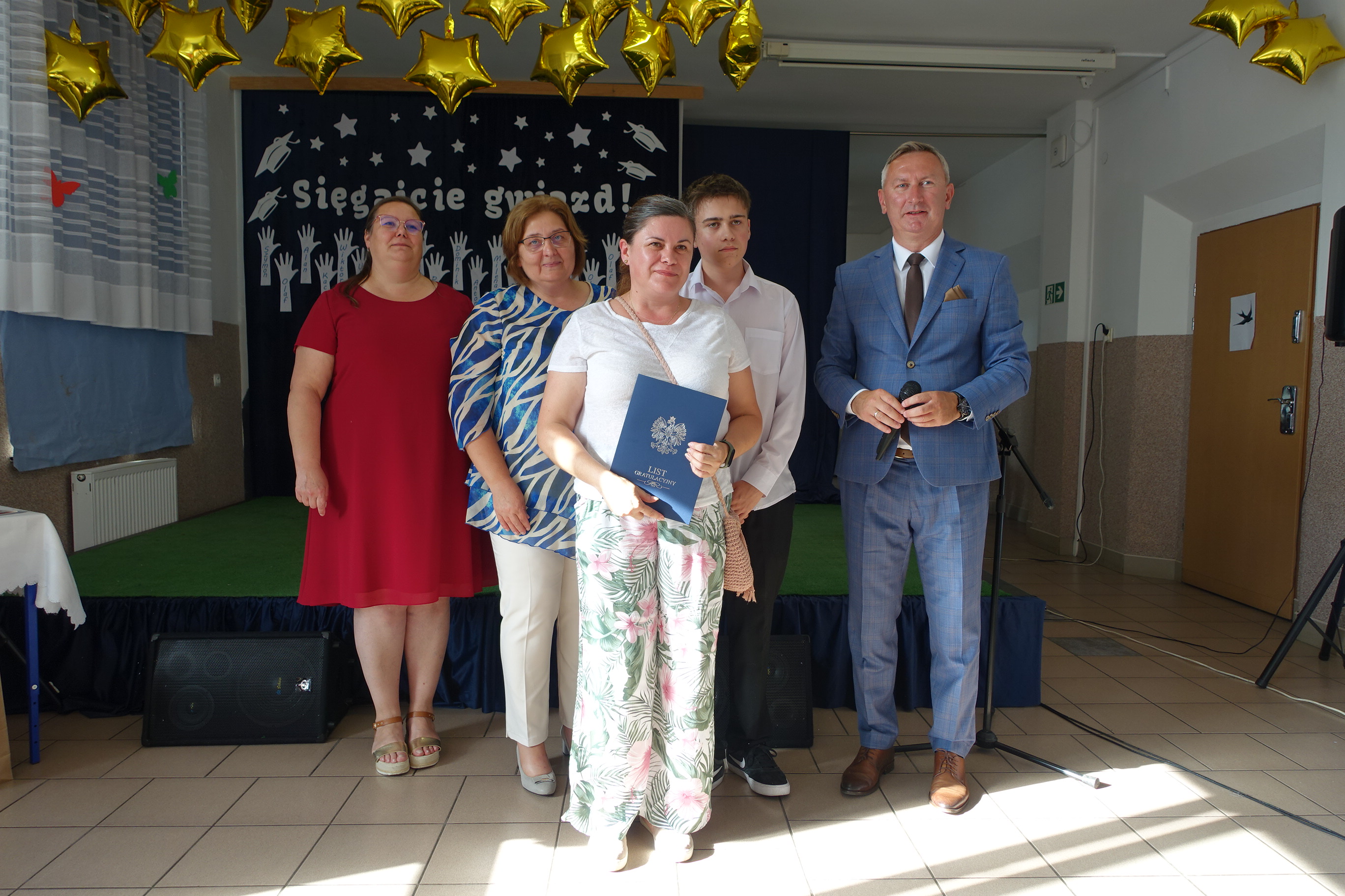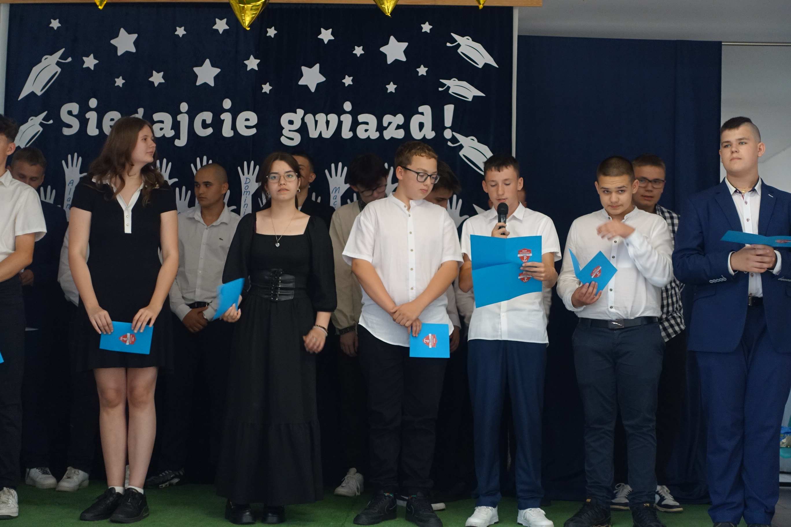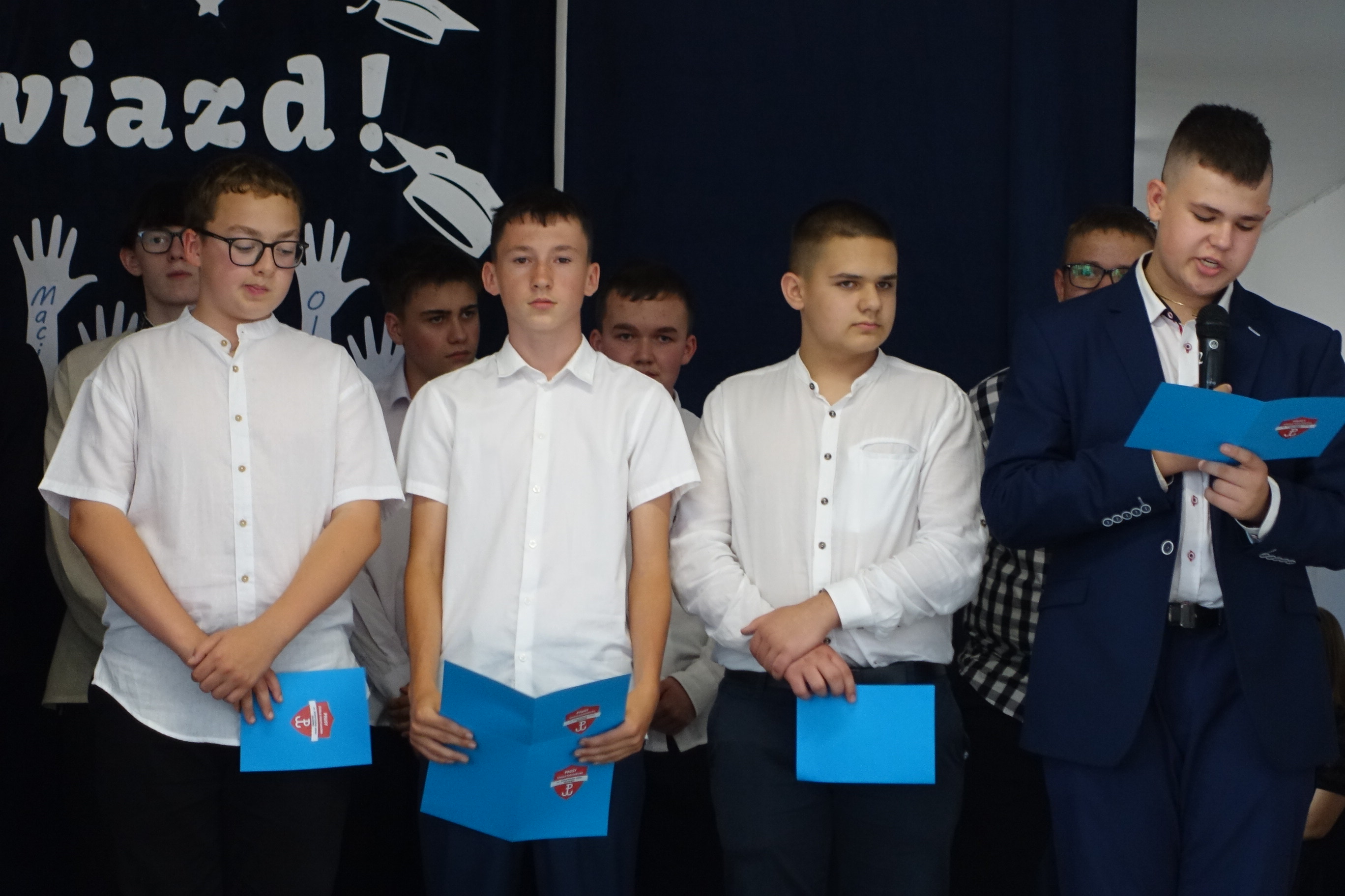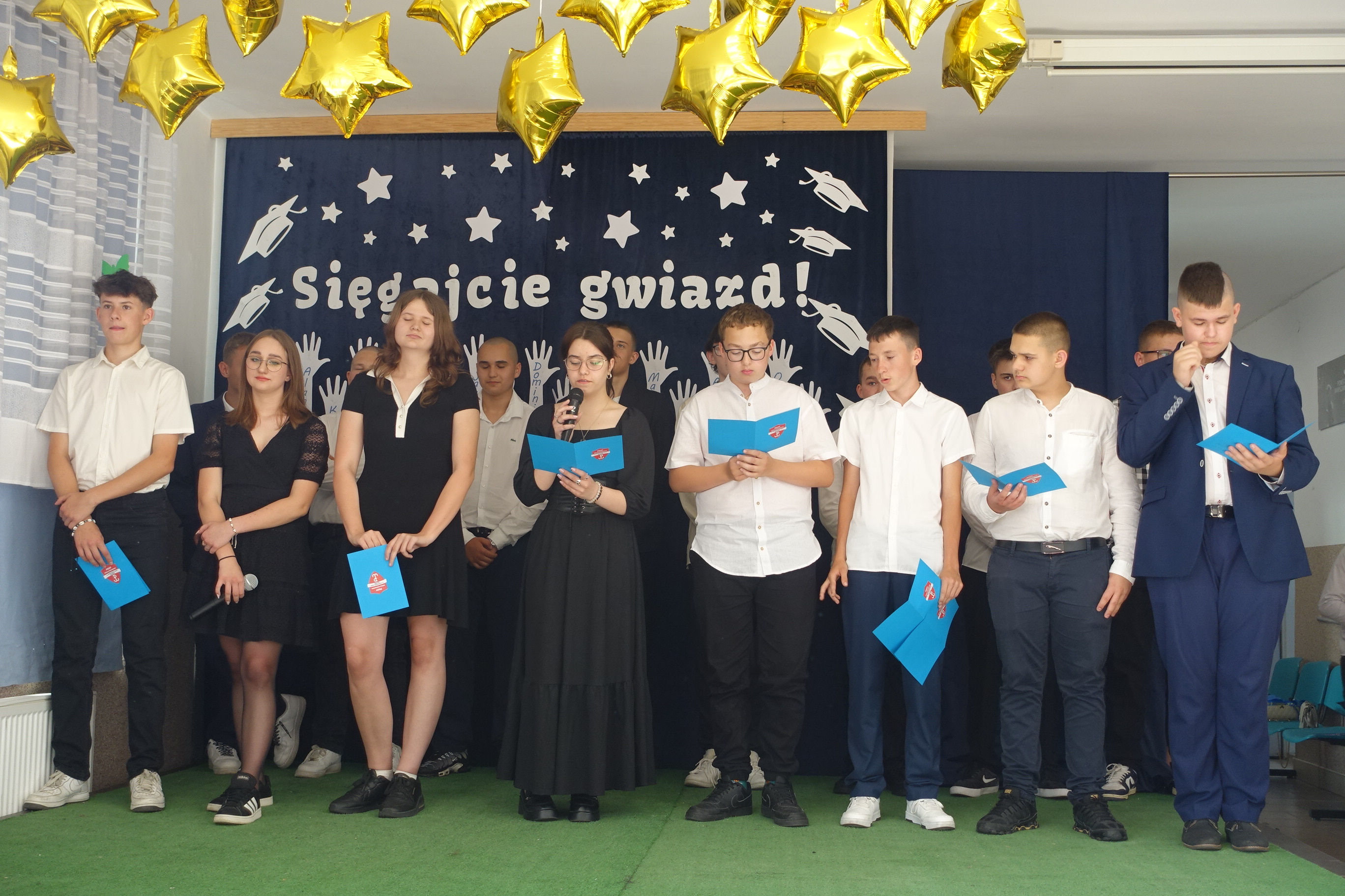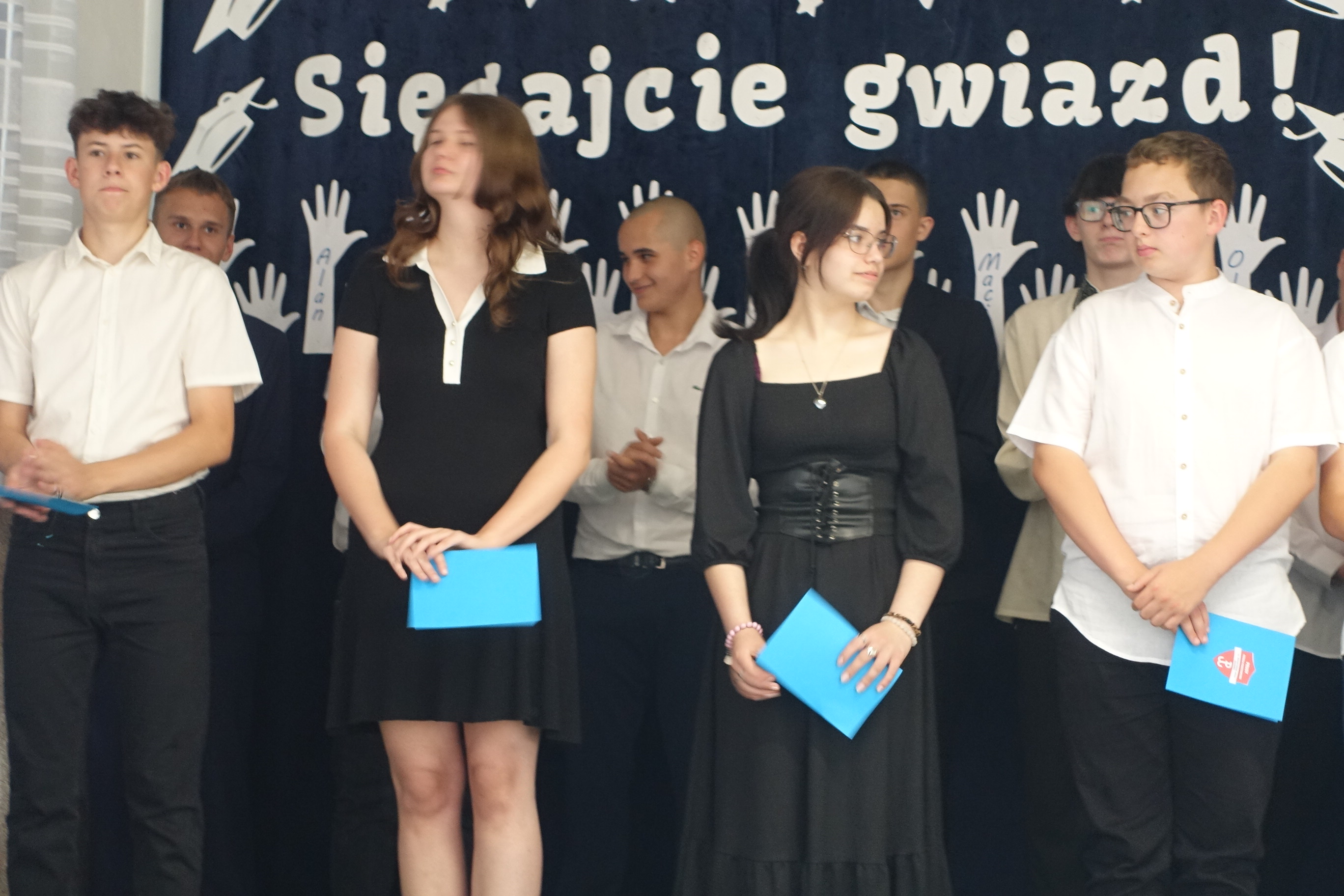 26. czerwca 2025 r. pożegnaliśmy klasę ósmą. Uroczystość była pełna wzruszeń, ale także pozytywnej energii, której jak zwykle dostarczyli nam nasi - już absolwenci. Hasło przwodnie pożegnania brzmiało: Sięgajcie gwiazd i cały przekaz tego wydarzenia skupił się wokól tej idei. Życzenia absolwentom złożyli: Dyrektos Szkoły, Wójt Gminy Kondtratowice, Przewodnicząca Rady Rodziców i wychowawczyni klasy - pani Małgorzata Wójcik. Ściankę VIP przygotowały dla uczniów panie z Rady Rodziców i stąd takie wyjątkowe zdjęcia. Za wyniki w nauce oraz pracę na rzecz szkoły, pracę w wolontariacie, samorządzie uczniowskim, za służbę w poczcie sztandarowym uczniwie otrzymali dyplomy oraz nagrody rzeczowe ufundowane przez Radę Rodziców, samorząd uczniowski, szkołę. Tradycyjnie starszych kolegów pożegnali siómoklasiści. Nie mogło zabraknąć zabawnych wierszyków o każdym absolwencie. Listy gratulacyjne oraz podziękowania za pracę na rzecz szkoły odebrali również rodzice. Do nieba poszybowały także balony z marzeniami naszych ósmoklasistów - oby sie spełniły. Nie zabrakło także słodkiego poczęstunku, za który składamuy serdeczne podziękowania rodzicom.