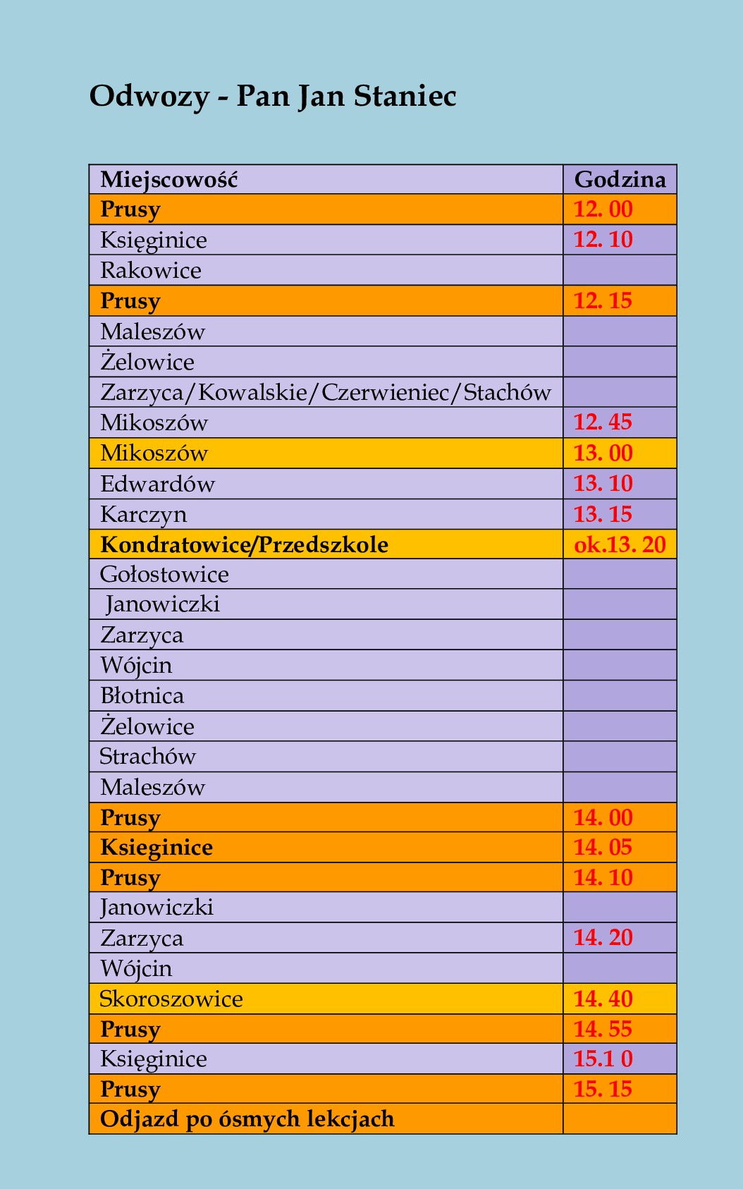Szanowni Państwo, zwracamy się z ogromną prośbą, aby rano uczniowie wychodzili na autobus około 10 minut wcześniej. Jednocześnie informujemy, że wszelkie opóźnienia autobusów wynikają z przyczyn związanych z warunkami panującymi na drodze, nieprzewidzianymi zmianami w organizacji zajęć, obciążeniem przejazdów. Bardzo prosimy o wyrozumiałość.