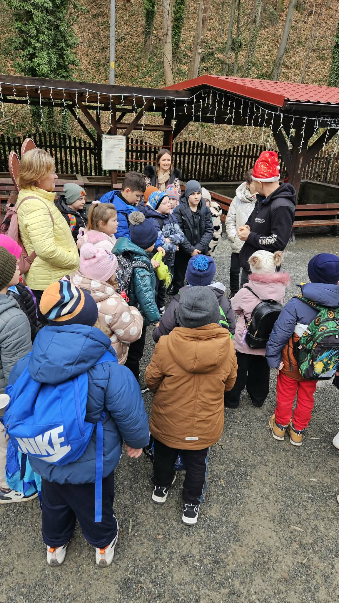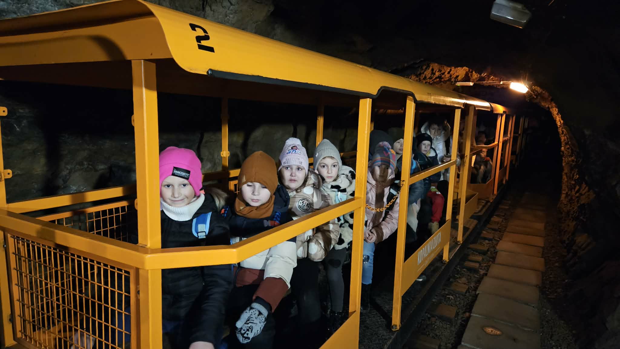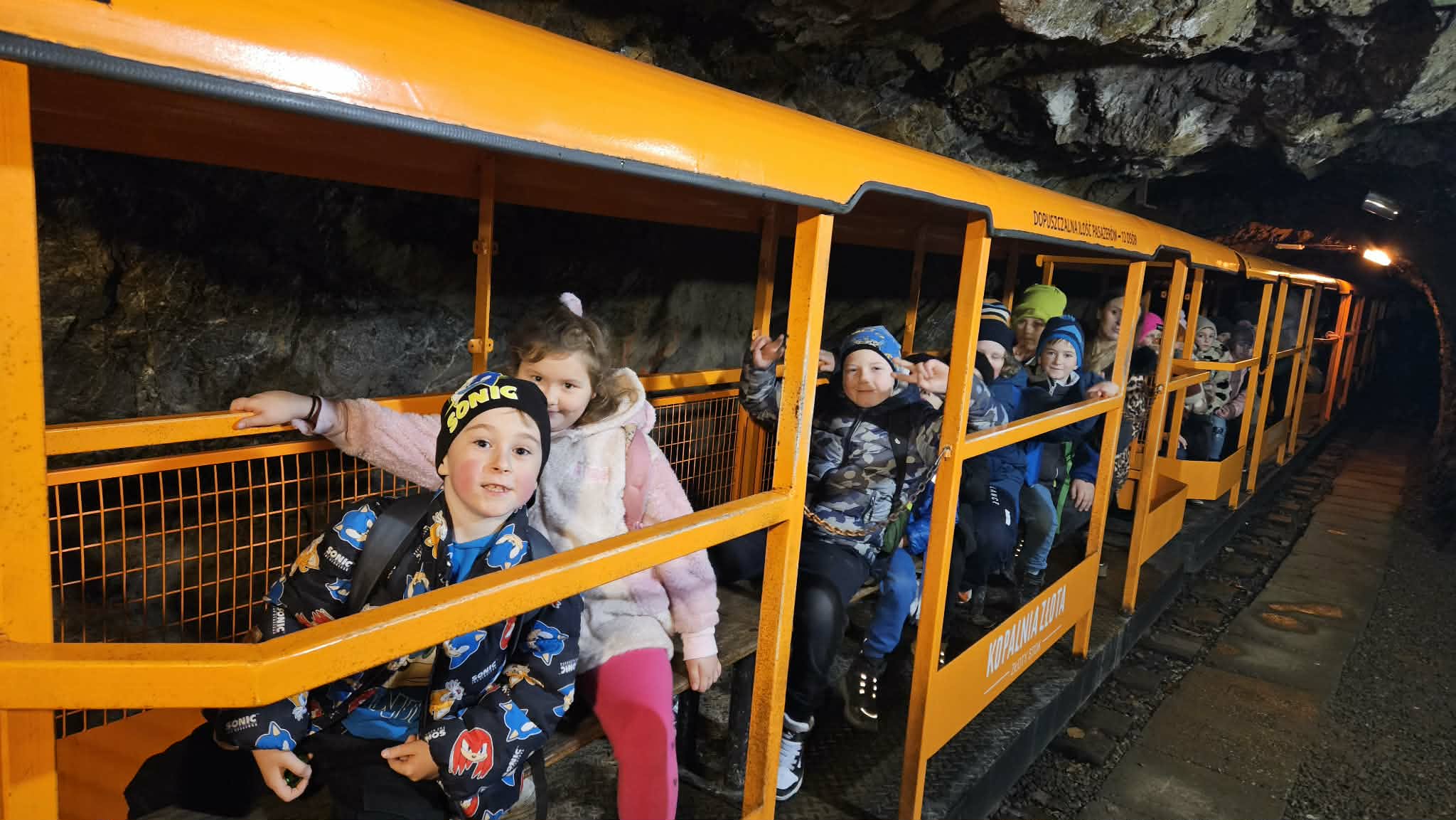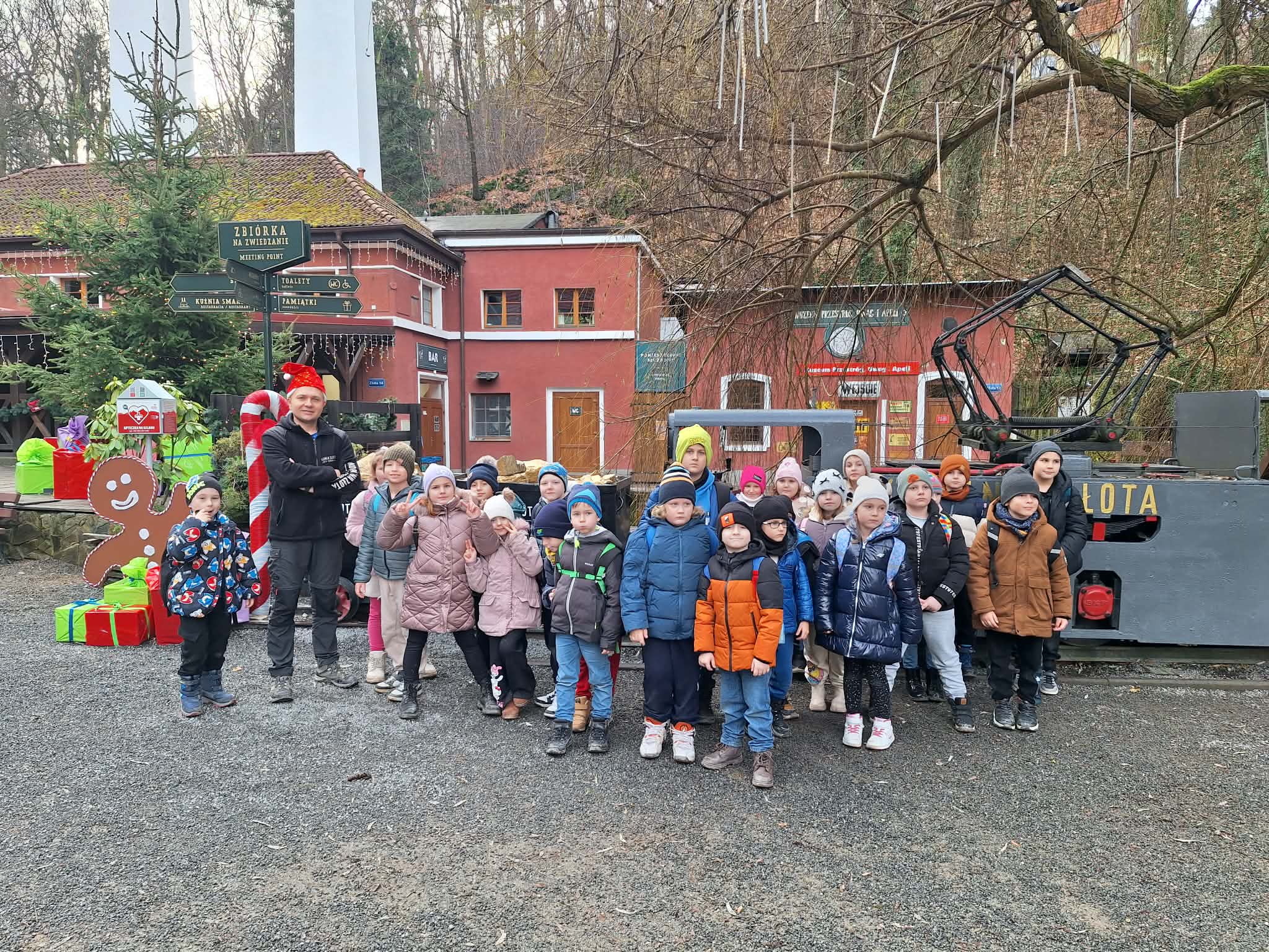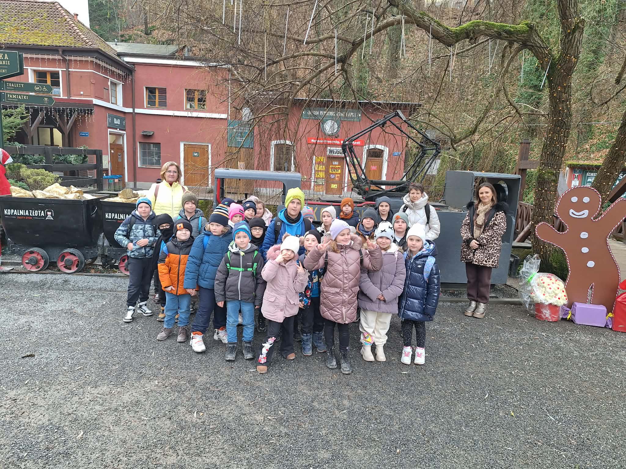 9 grudnia 2025r. wybraliśmy się z klasą 2b na spotkanie z Mikołajem do kopalni złota w Złotym Stoku. Na miejscu oczekiwał na nas bardzo sympatyczny Elf- przewodnik. Zwiedzanie rozpoczęliśmy od Muzeum Minerałów, gdzie dowiedzieliśmy się czym jeździ św.Mikołaj ( narty, sanie) oraz w jakich butach chodzi. Następnie poszłiśmy do kopalni. Było ciemno i wilgotno. Elf opowiadał nam historie związane z kopalnią. Zaskoczyło nas spotkanie z tajemniczą kobietą szukającą swojego męża. Dowiedzieliśmy się jak ciężka jest kostka złota, jak wytwarzano monety ze złotego kruszcu, co robiono z arszeniku i zobaczyliśmy podziemny wodospad. Z kopalni wyjechaliśmy pomarańczową kolejką. Każdy z nas miał okazję poszukać skarbu w skrzyniach z piaskiem. Na koniec poczęstowano nas przepyszną , rozgrzewającą herbatką oraz słodziutkim ciasteczkiem. Pełni wrażeń oraz pamiątek wróciliśmy szczęsliwie do szkoły.