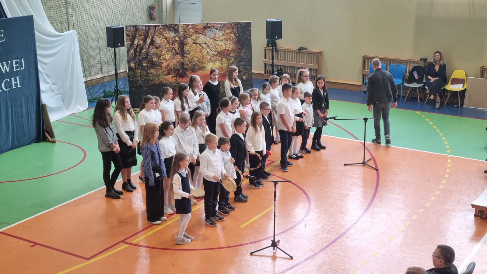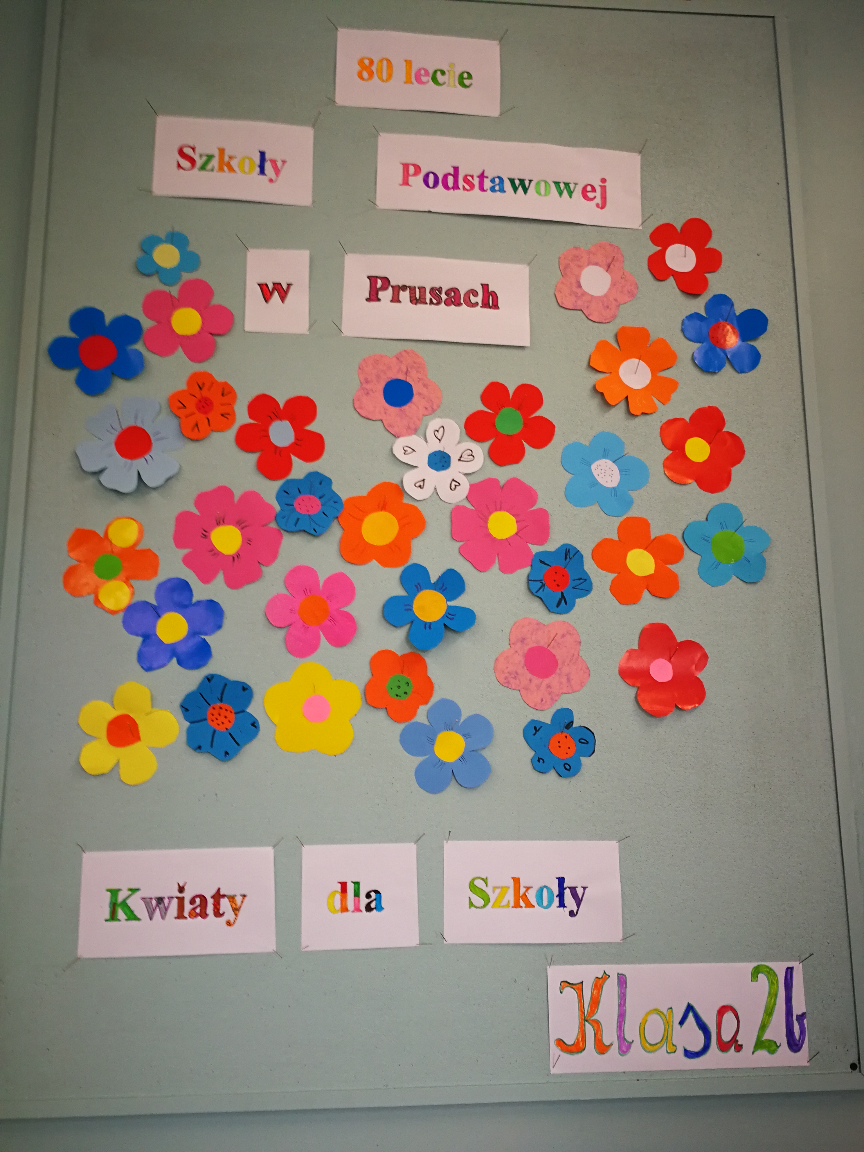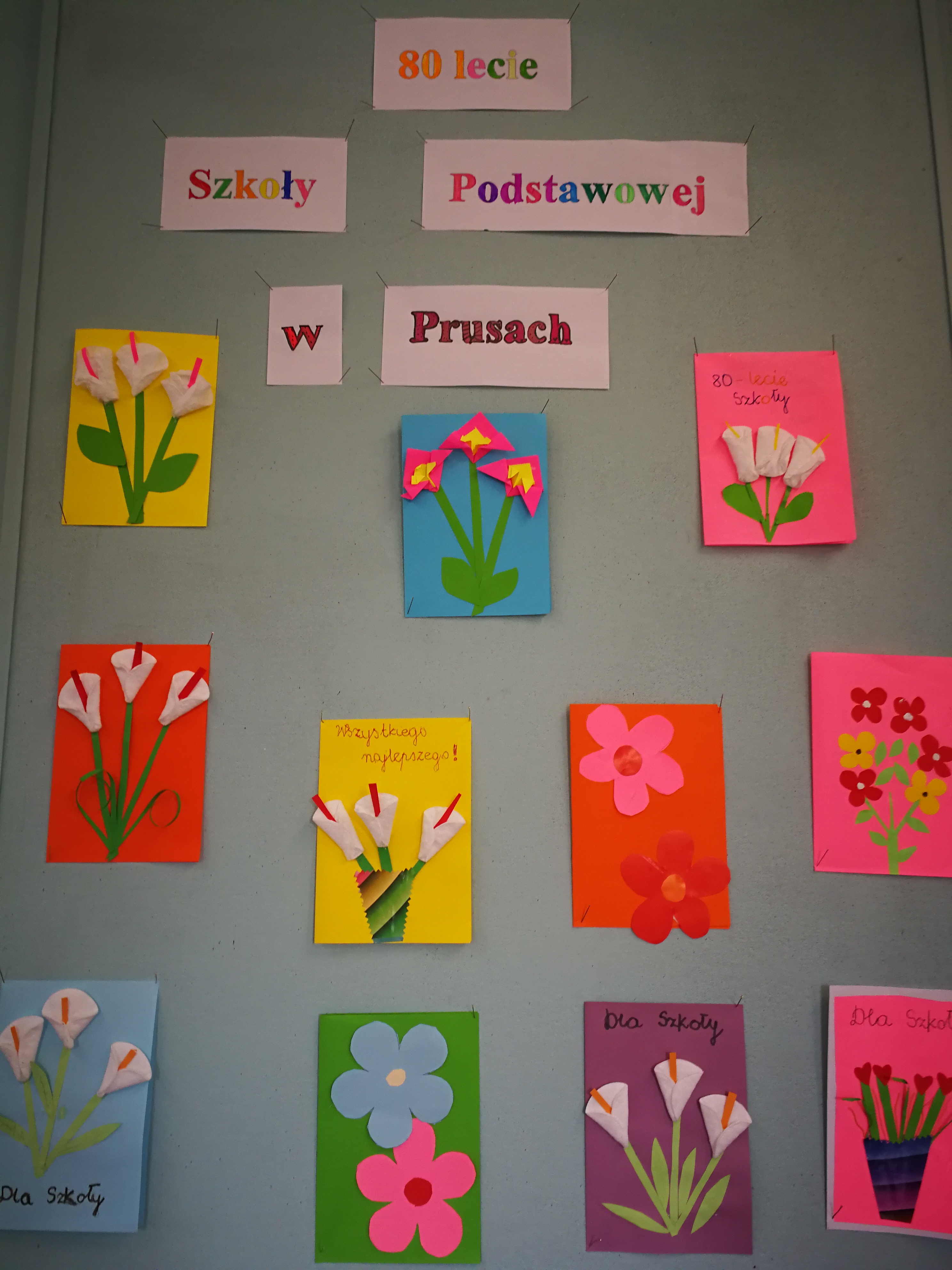 W tym roku nasza szkoła obchodzi 80 -lecie. Z tej okazji wykonaliśmy laurki dla szkoły z życzeniami płynącymi prosto z serca, a następnie zrobiliśmy wielki bukiet dla szkoły. Na uroczystość jubileuszową przygotowaliśmy występ -  graliśmy i spiewaliśmy