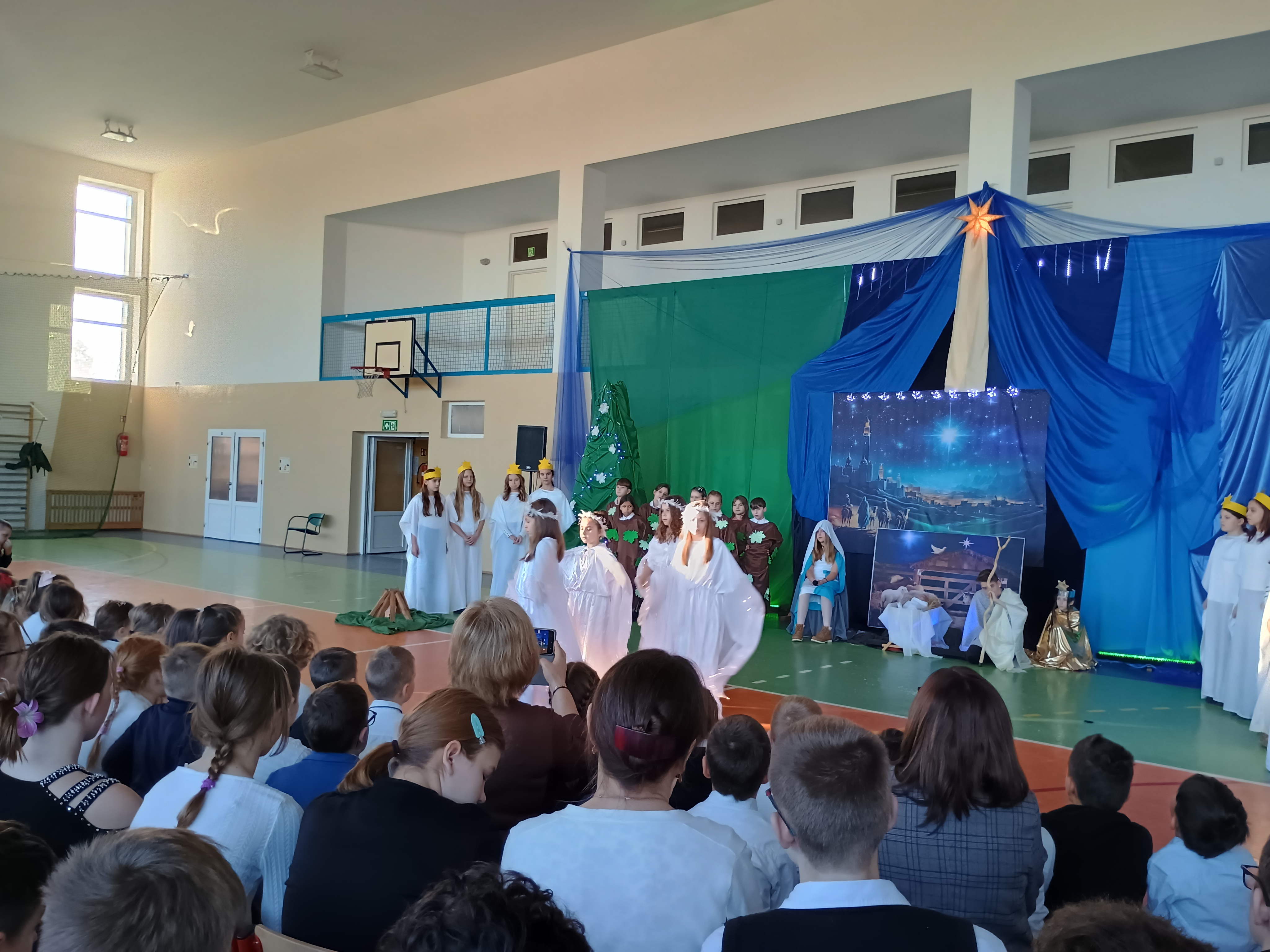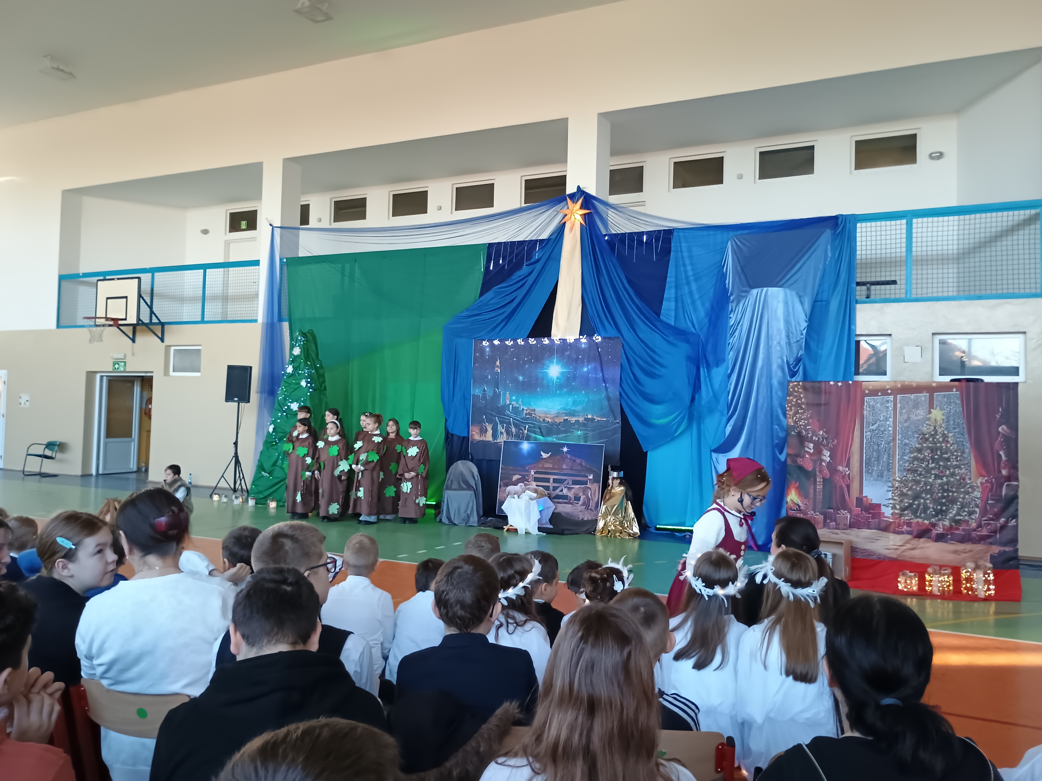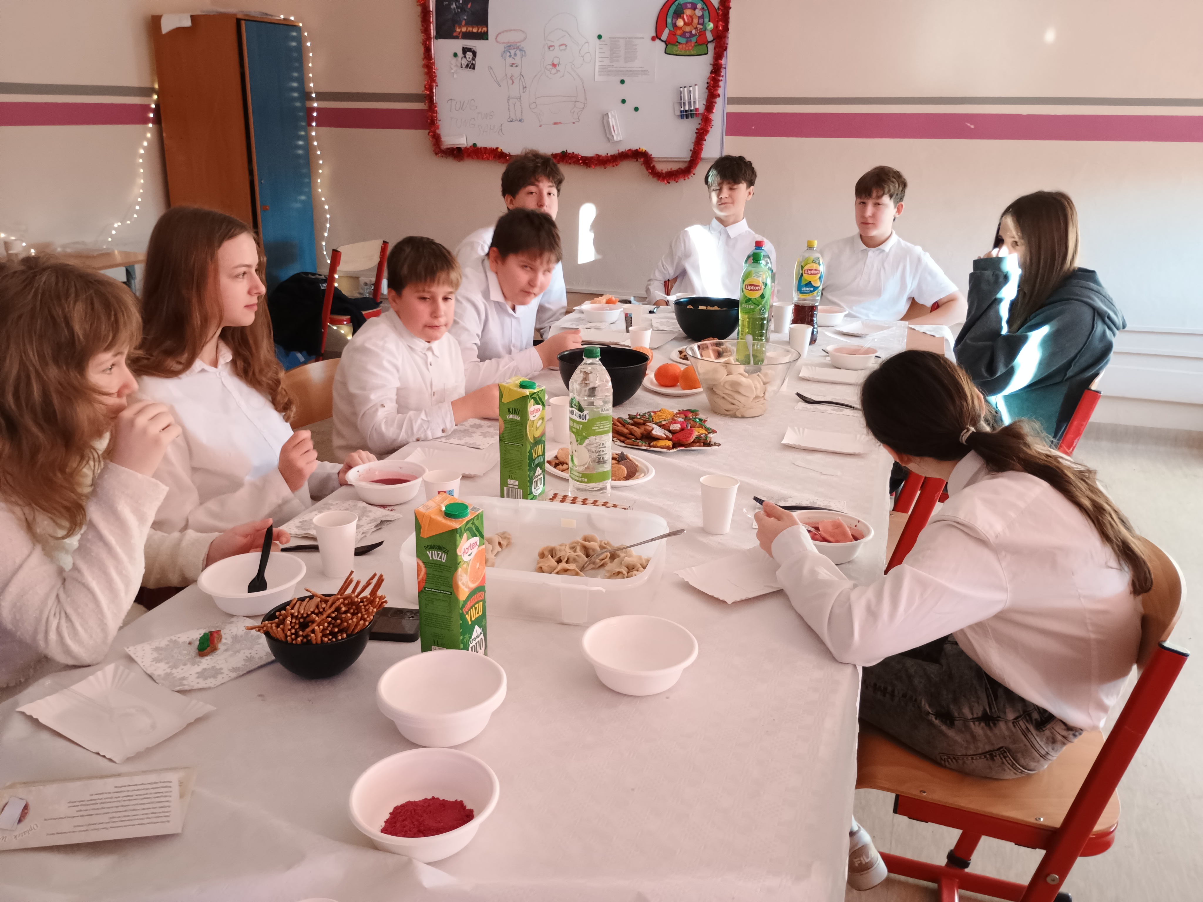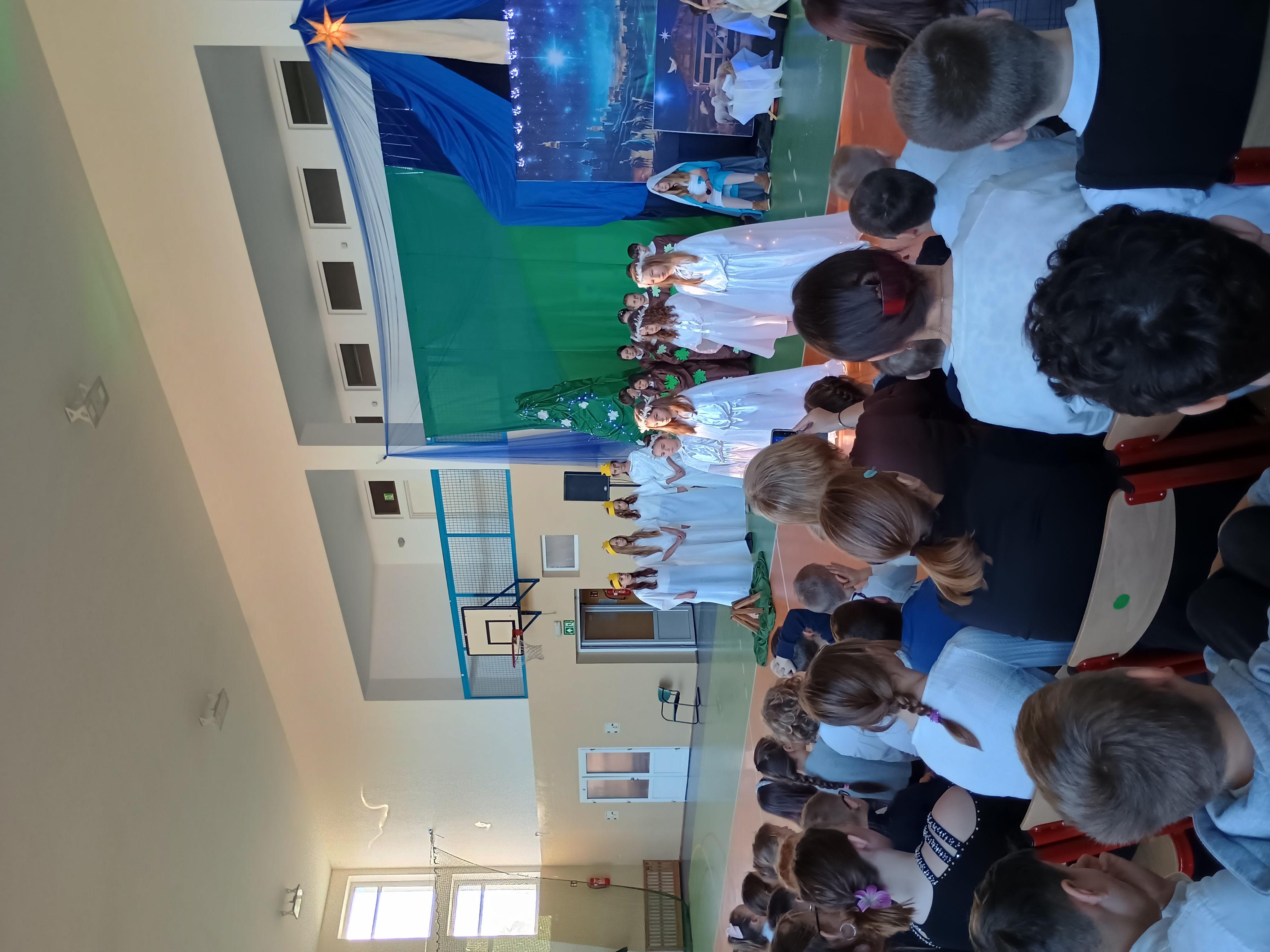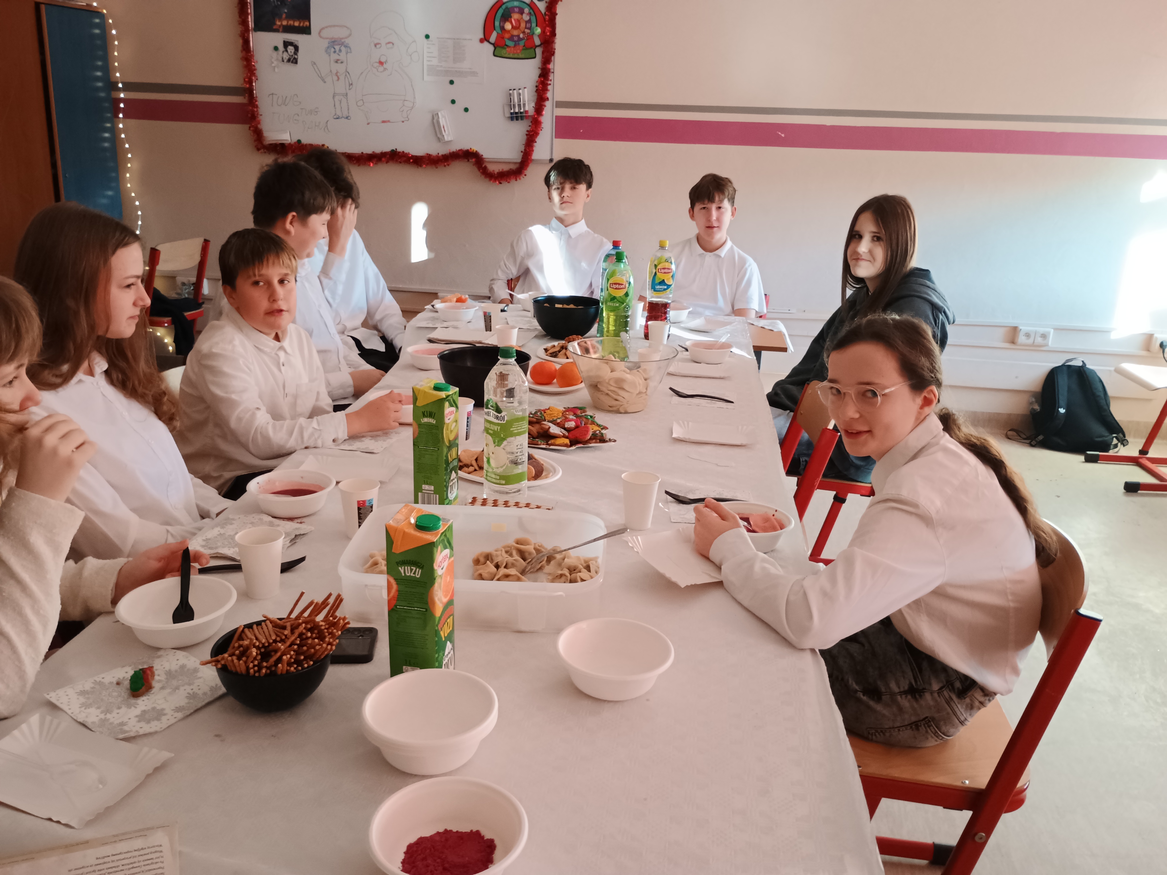 19 grudnia uczestniczyliśmy w szkolnych jasełkach. Po jasełkach mieliśmy wigilię klasową. Rodzice (reprezentowani przez mamę Kasi) zadbali o to, by na talerzach pojawił się ciepły barszcz, uszka, pierogi. Nie udało się zjeść wszystkiego, no ale takie sa właśnie wigilie. Bardzo dziękujemy.