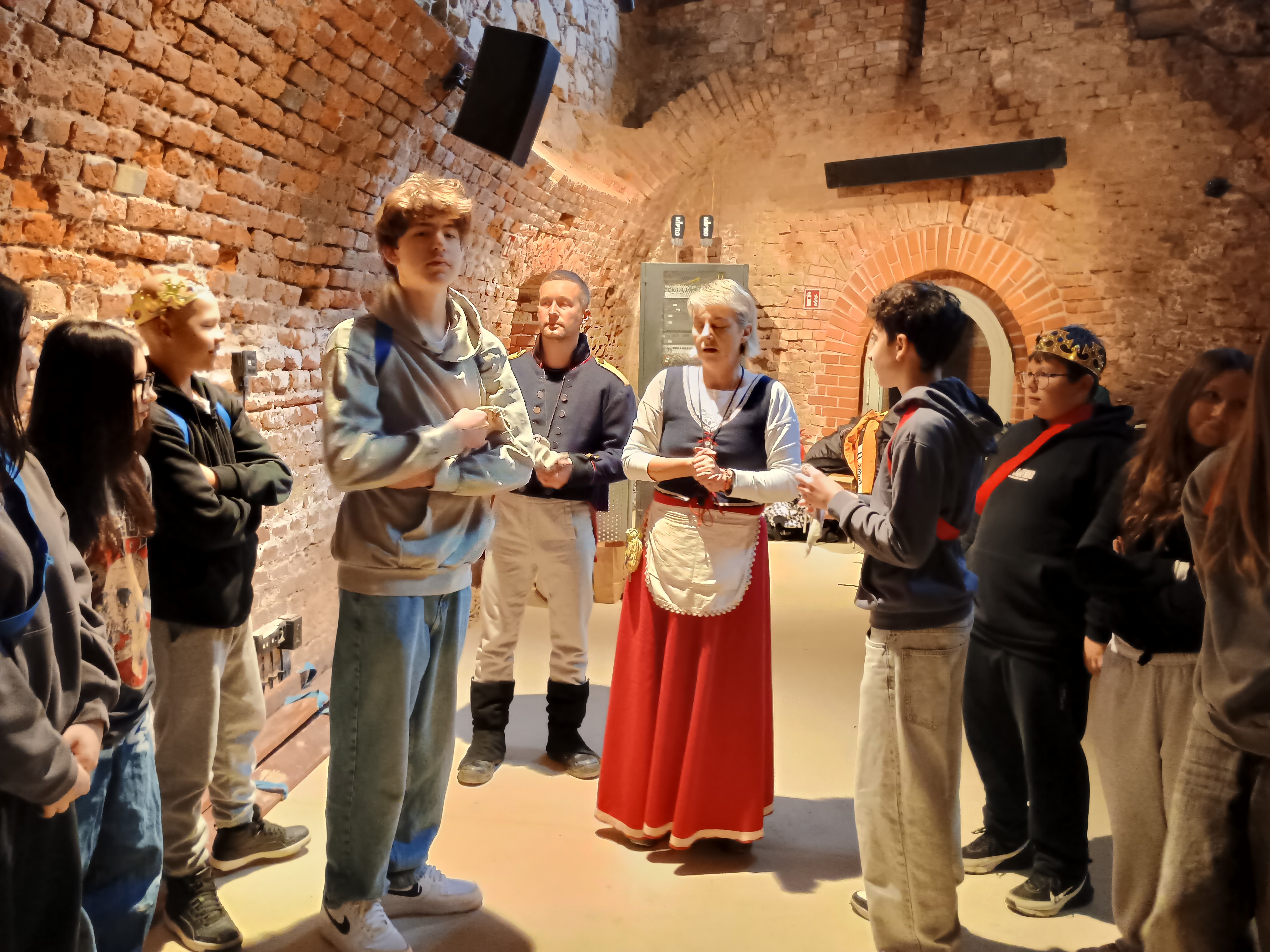 Na początku przywitała nas sympatyczna para przewodników w strojach z epoki. Niestety, po chwili okazało się, że staliśmy się rekrutami dwóch wrogich armii: pruskiej i francuskiej. Zaczęło się szkolenie – wiadomo, na początek musztra (dlaczego ta prawa strona tak myli się z lewą?).