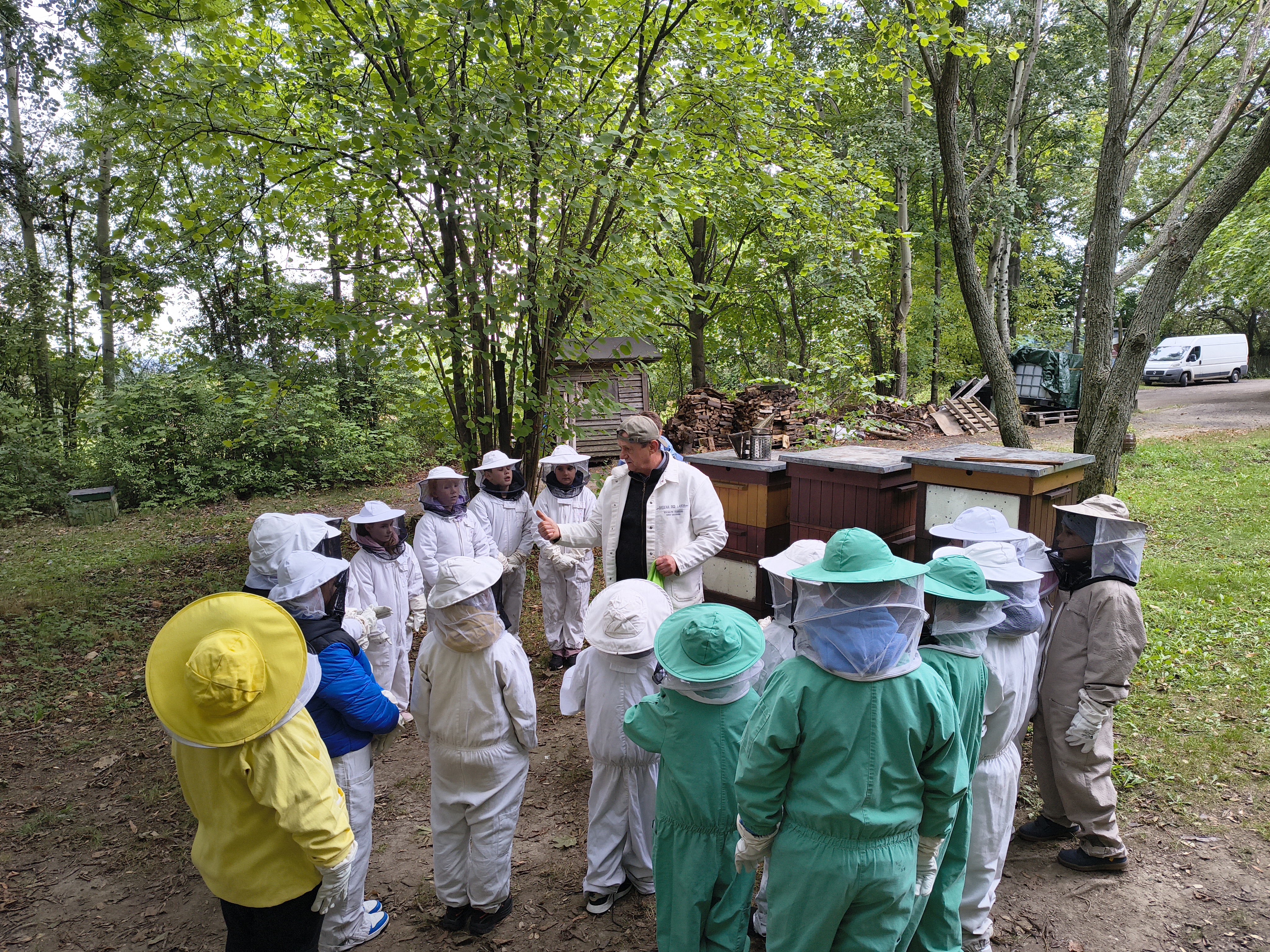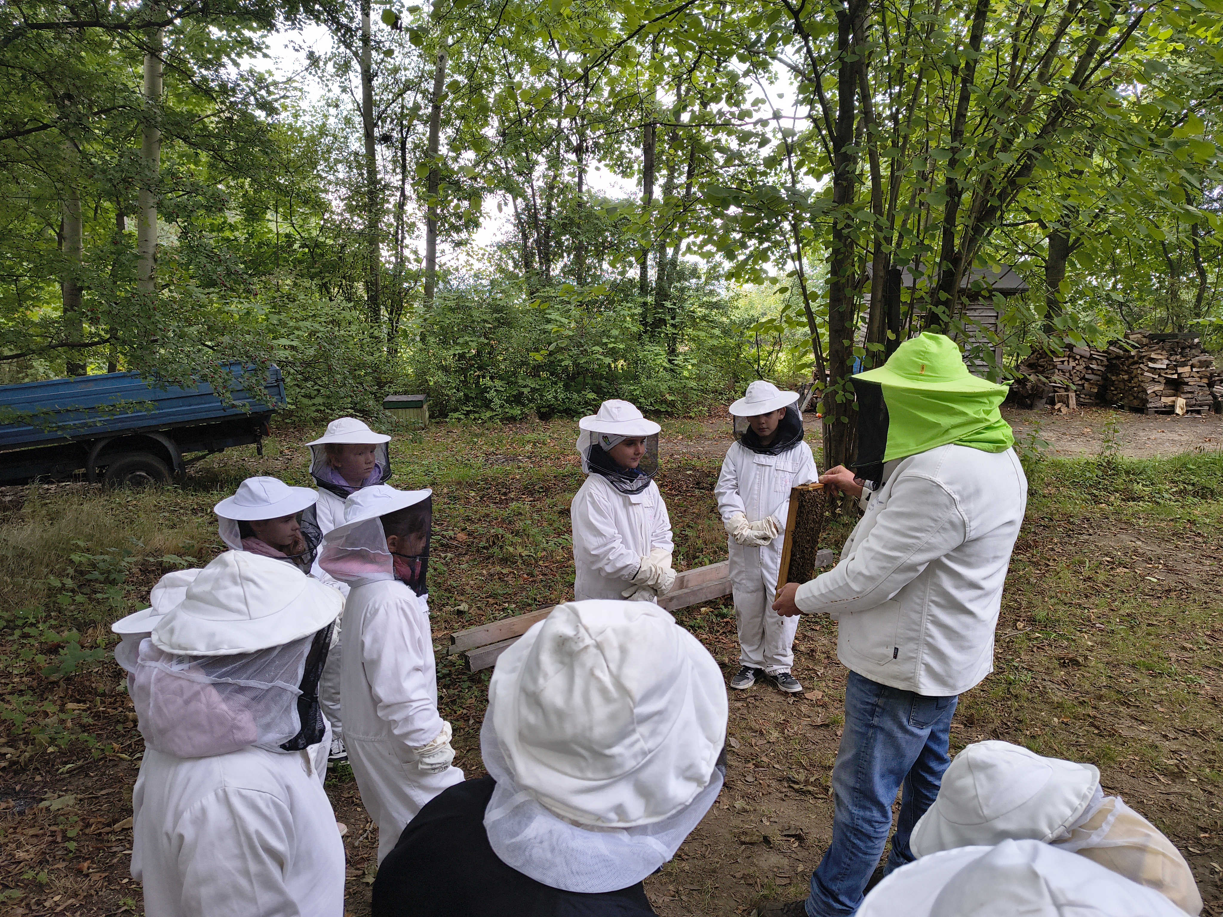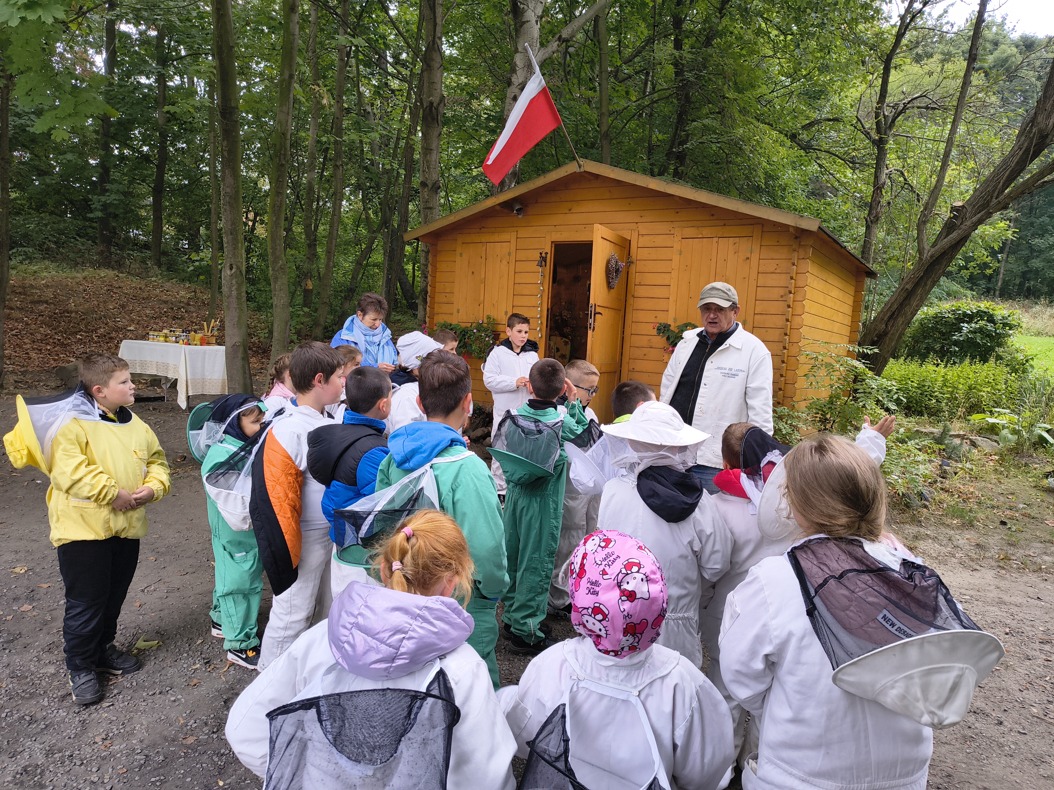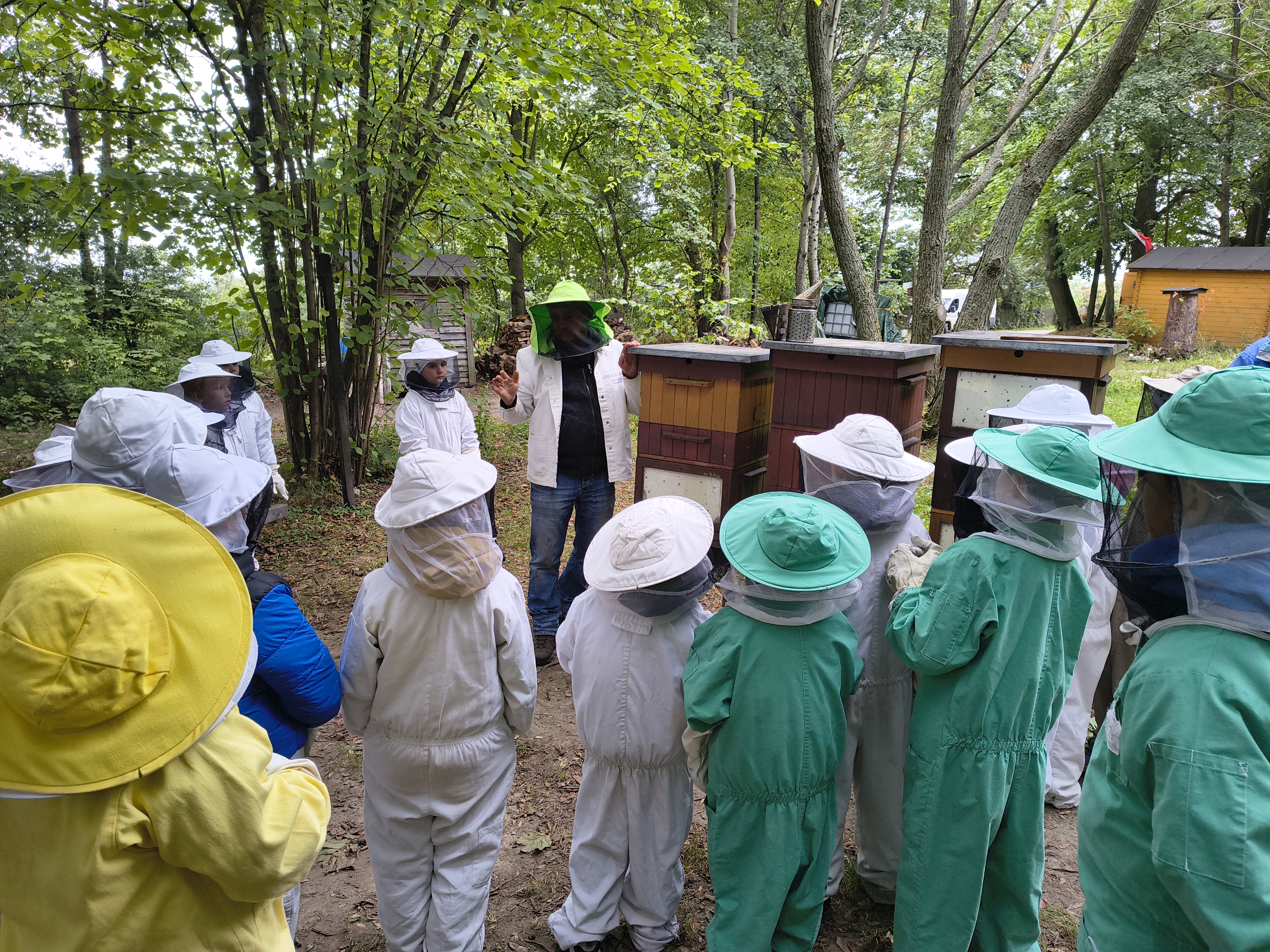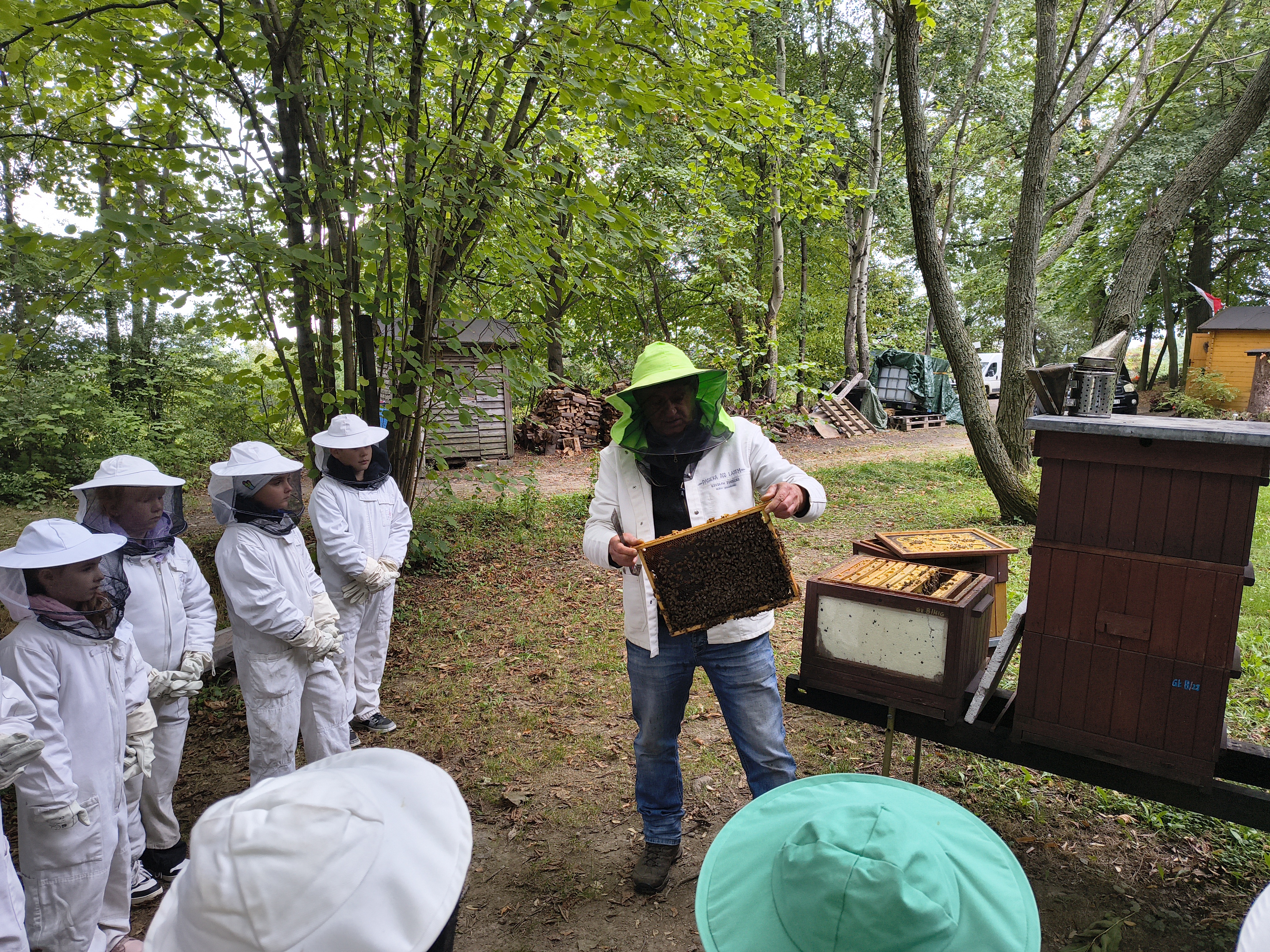W dalszej części wycieczki uczniowie udali się przez las do pasieki. Tam wysłuchali prelekcji mistrza pszczelarstwa, który opowiedział o pracy pszczół i sposobach opieki nad ulami. Mieli również możliwość obejrzenia prawdziwych uli oraz poznania darów, jakie człowiek otrzymuje dzięki pszczołom.
